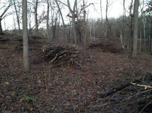 … the Three BrushCuteers cried as they fired up their chainsaws. Rich, Lindsay and I took the battle to the enemy today and many a stout and formidable foe was slain, dismembered and piled. The battle ground was the hilltop/sand dune just above the Hillside and Hidden Springs (see Map), where we have been working recently.