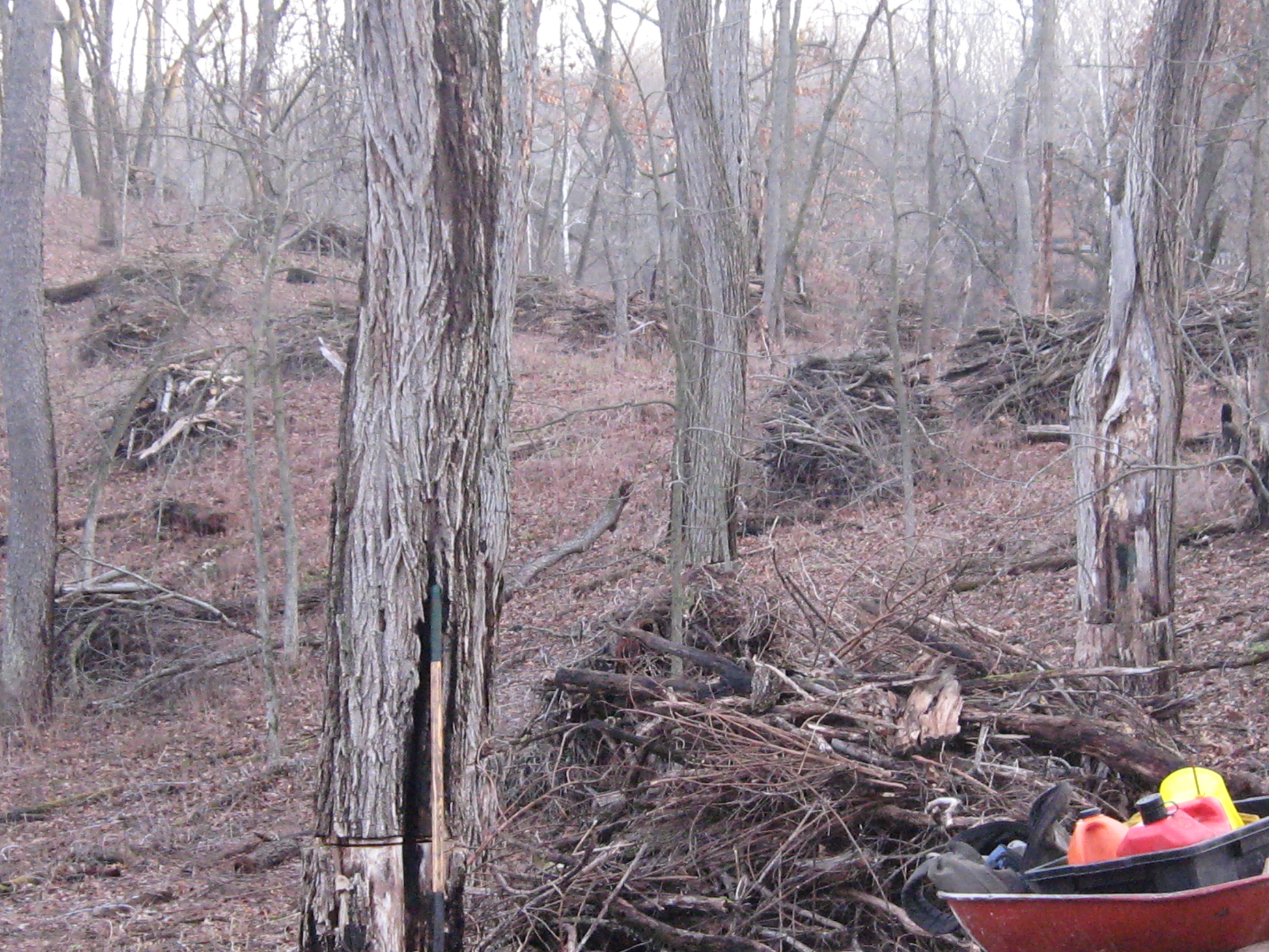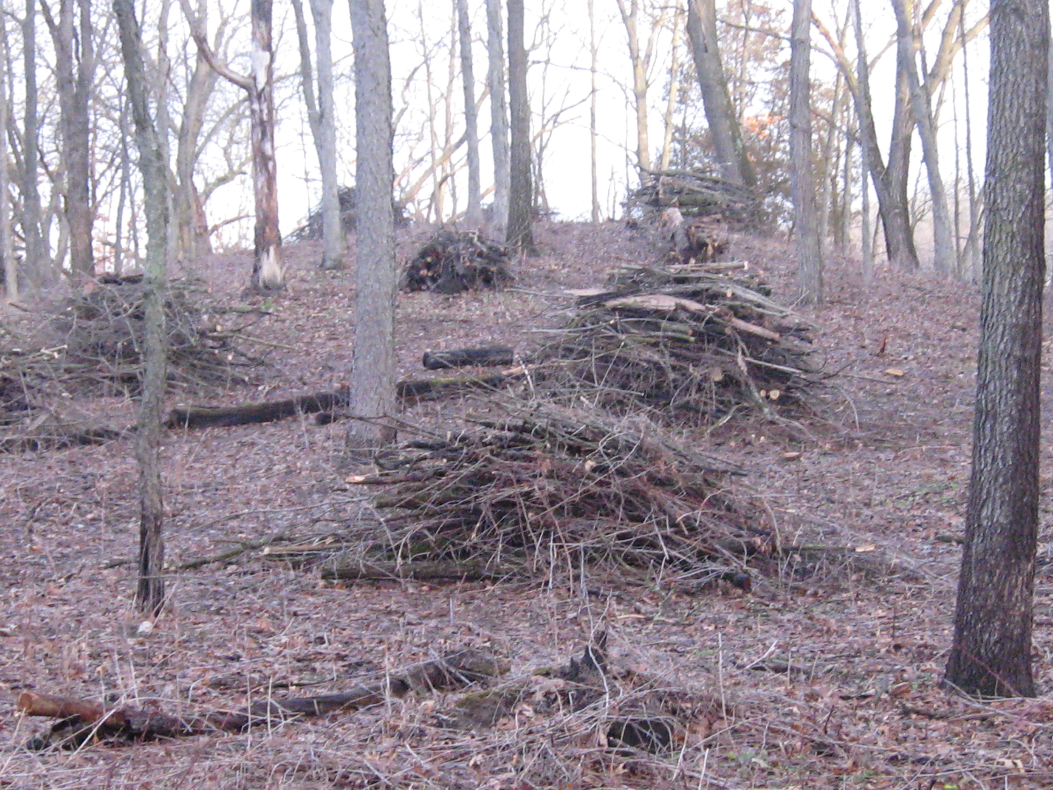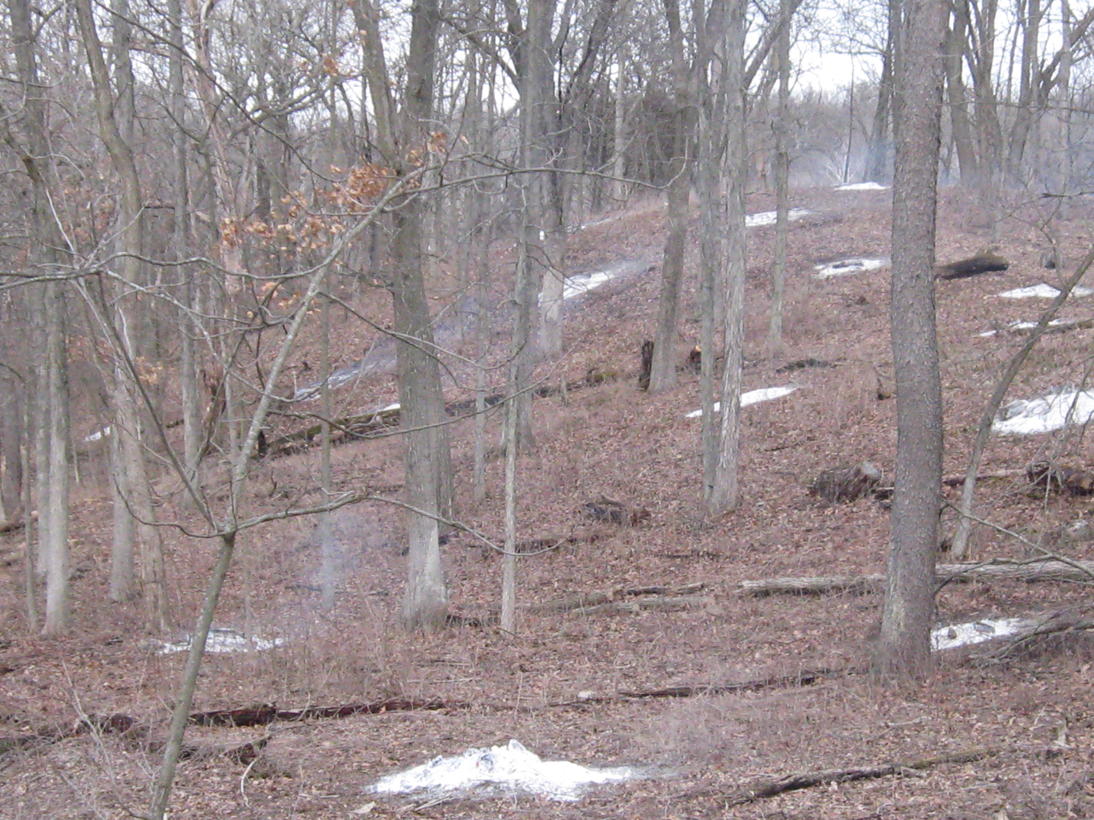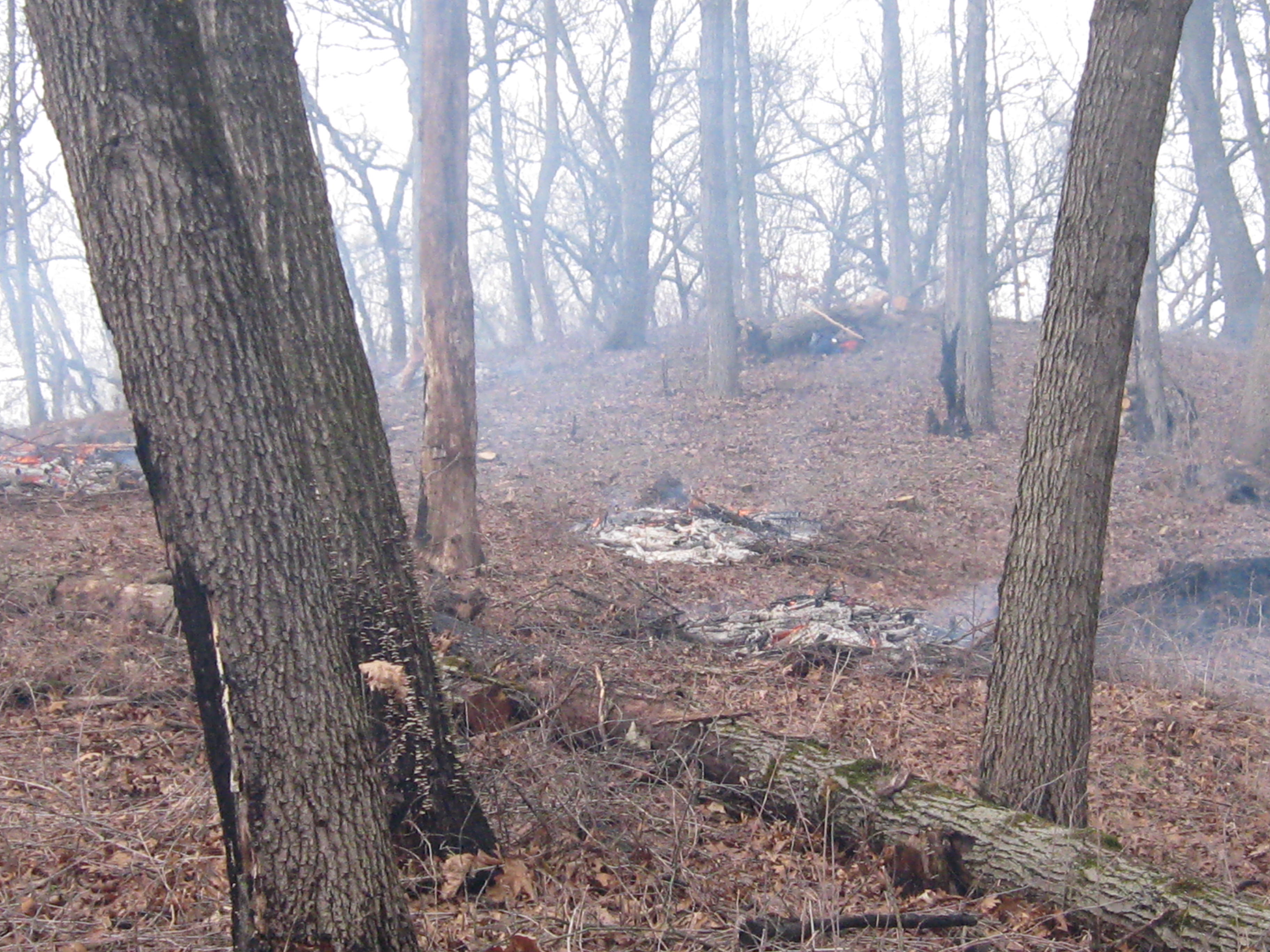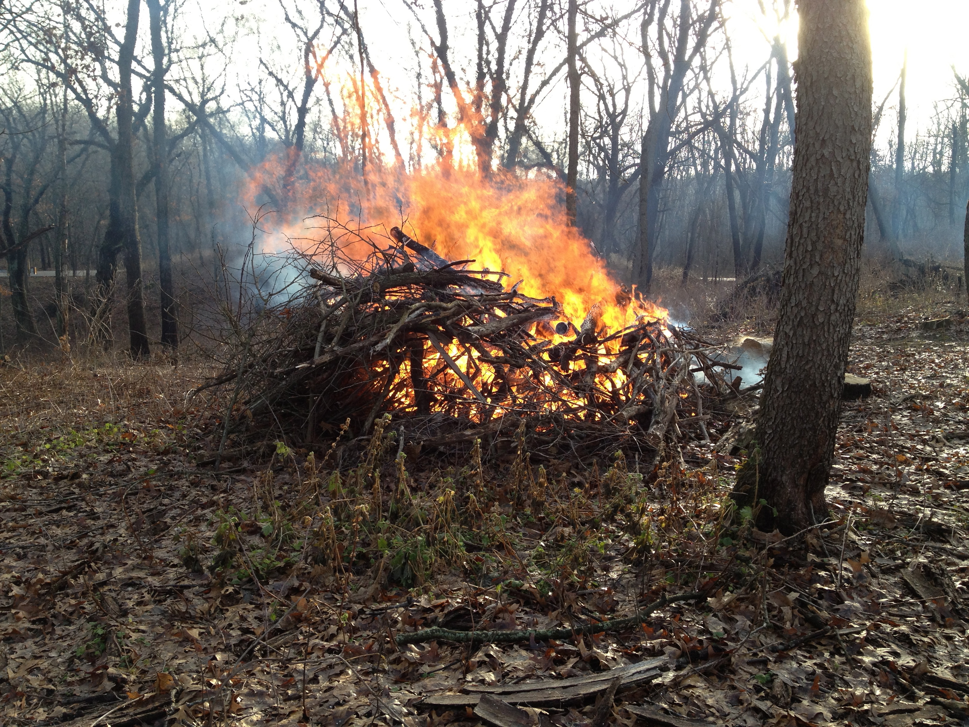 It felt like a warm, sunny Spring day. The snow had all melted and the ground was wet. The brush piles on the South end of the loop trail were wet from the recent rain, but the steady Westerly breeze promised all the support we would need, and we started lighting fires.
