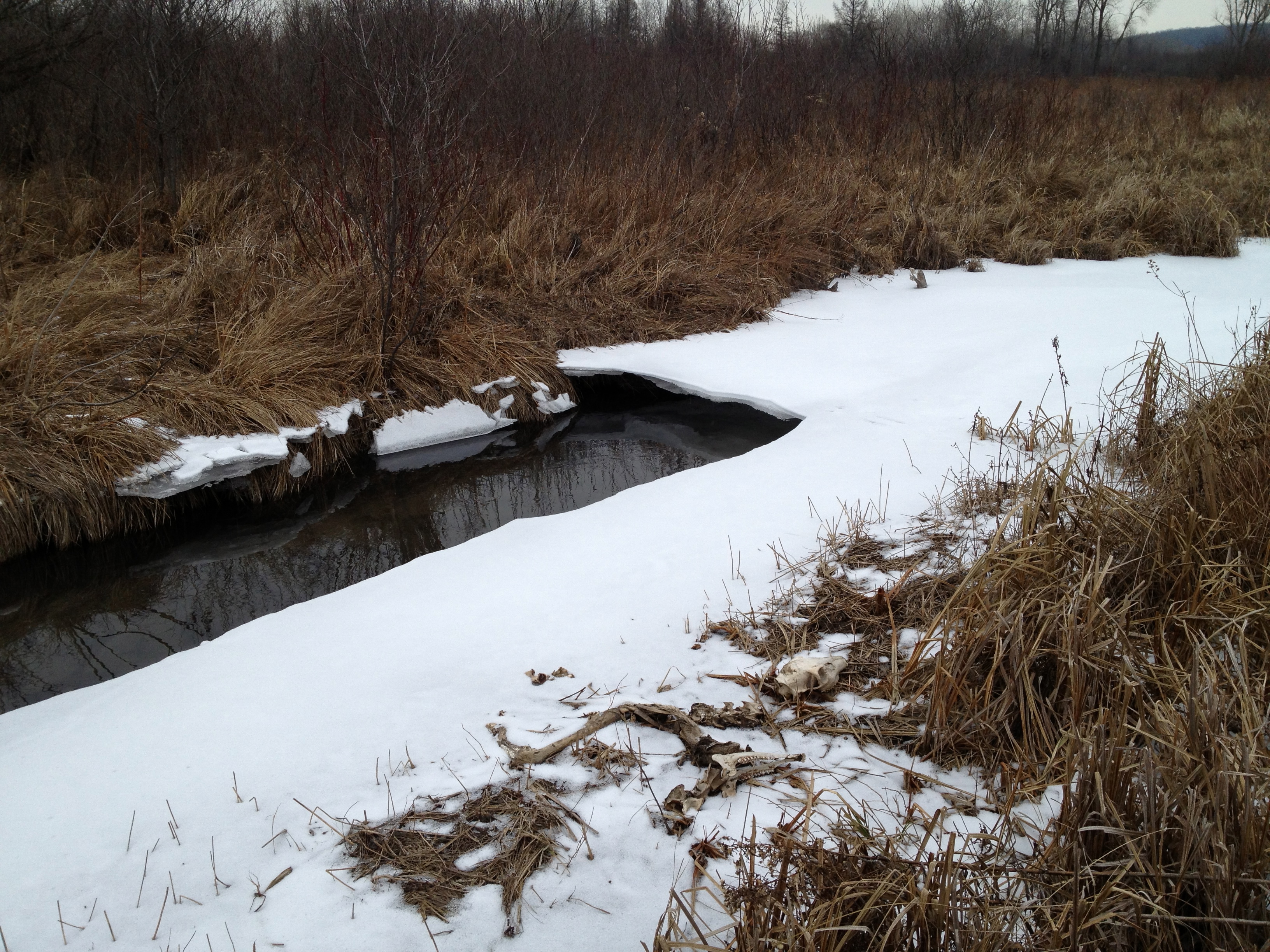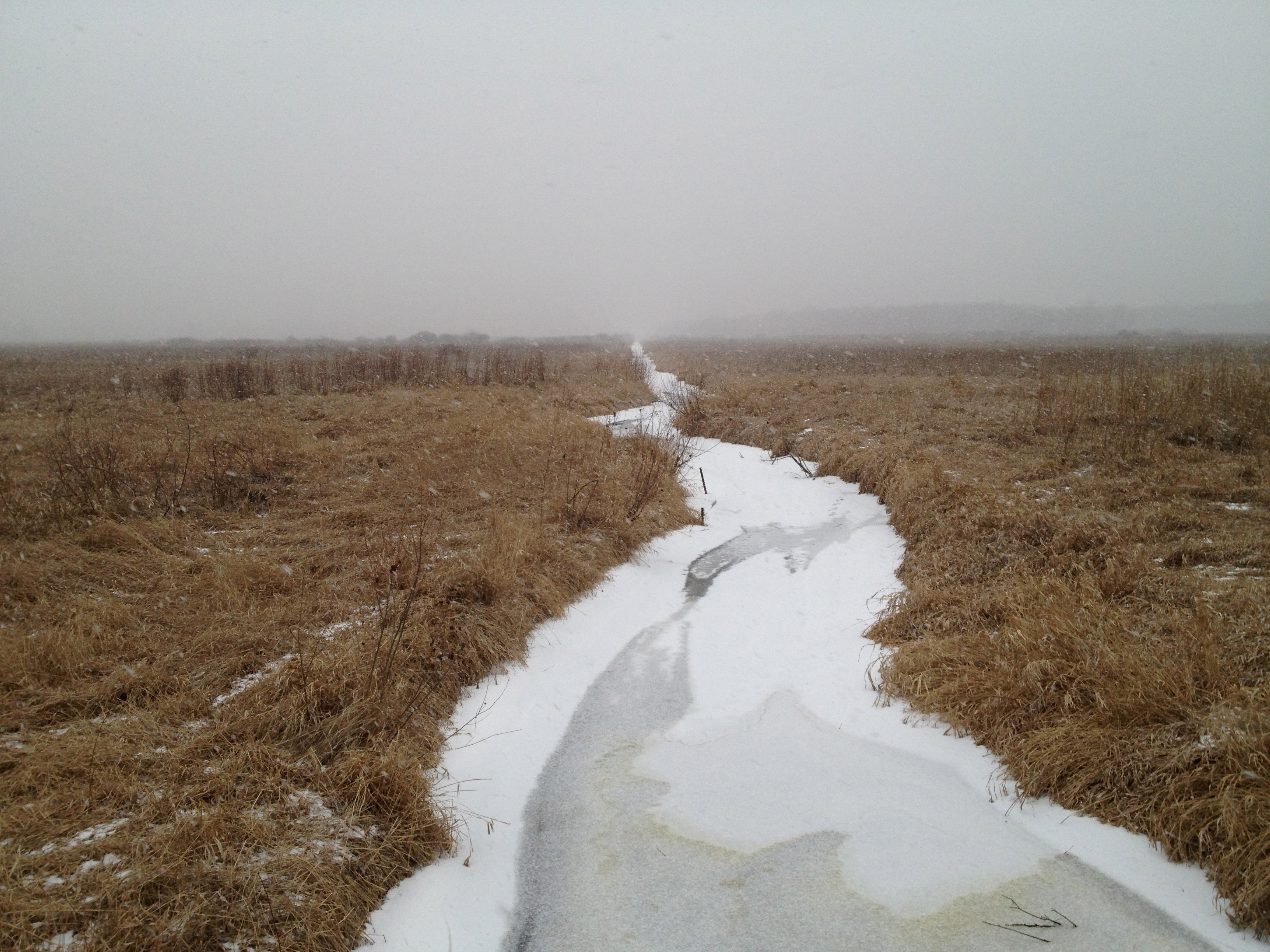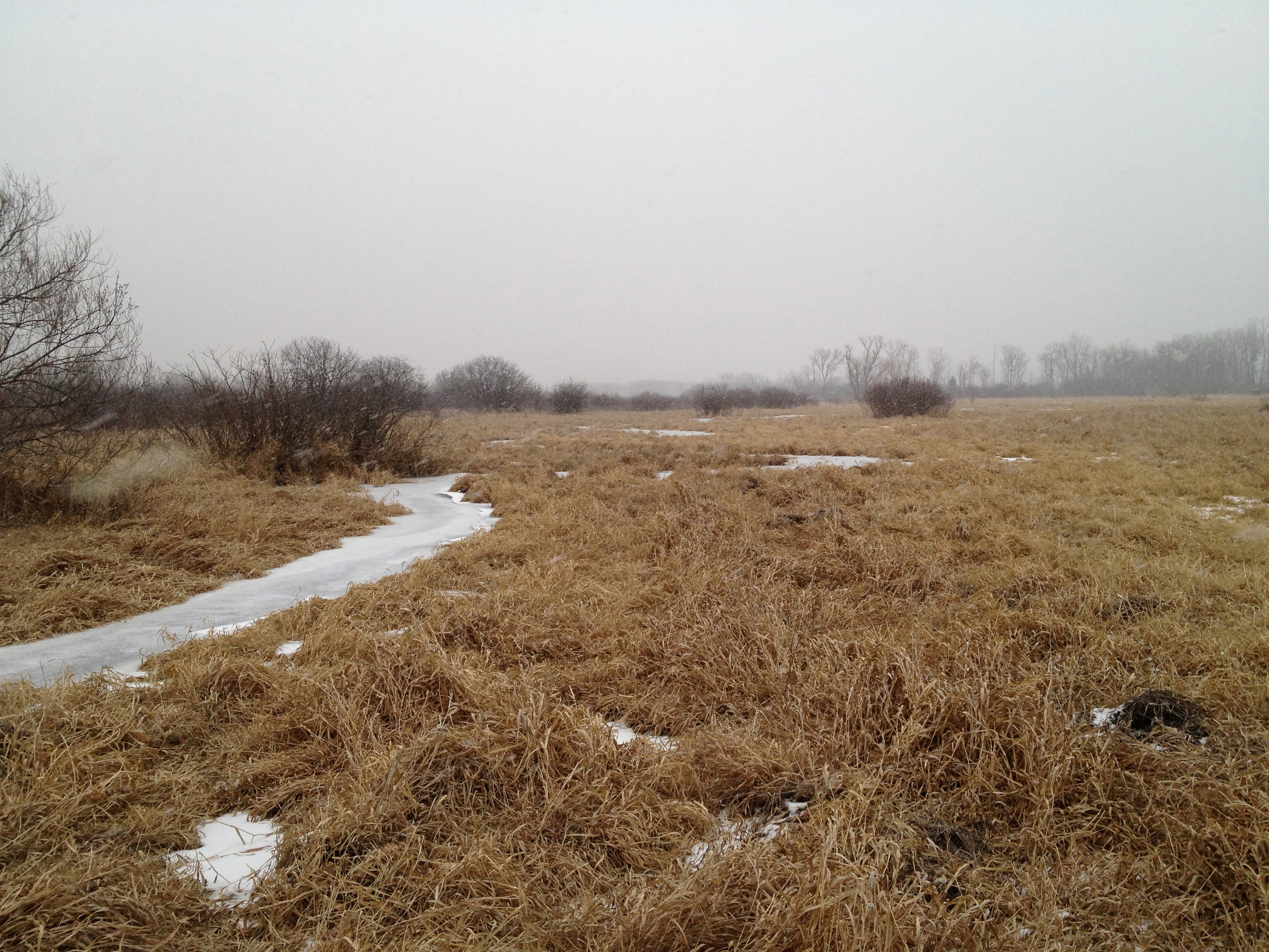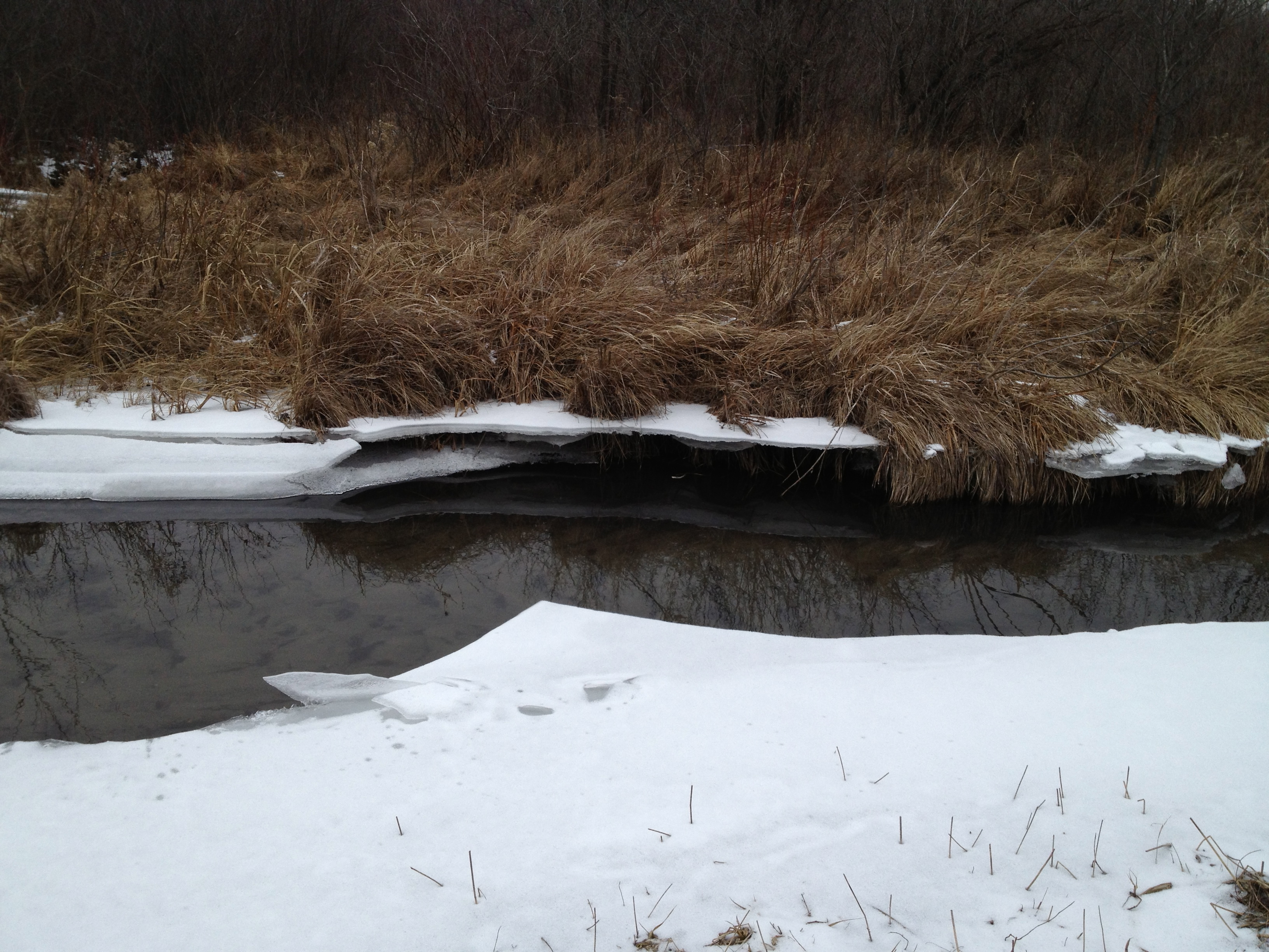 As we approached Hwy N, the snow and sleet began to fall. You’ll hear me musing repeatedly about why there is water in the channel. I will follow up with the DNR about this to see if it is expected.