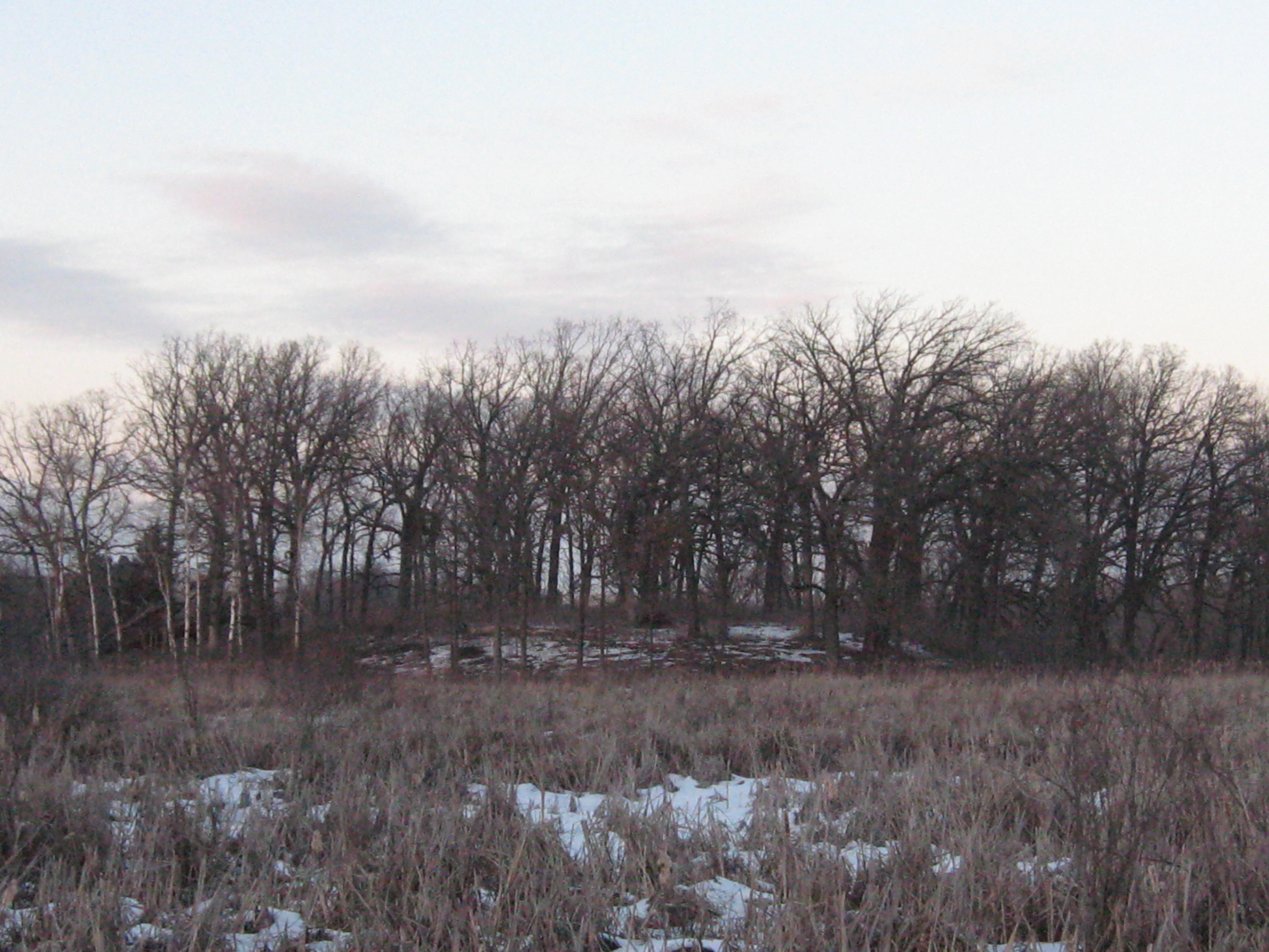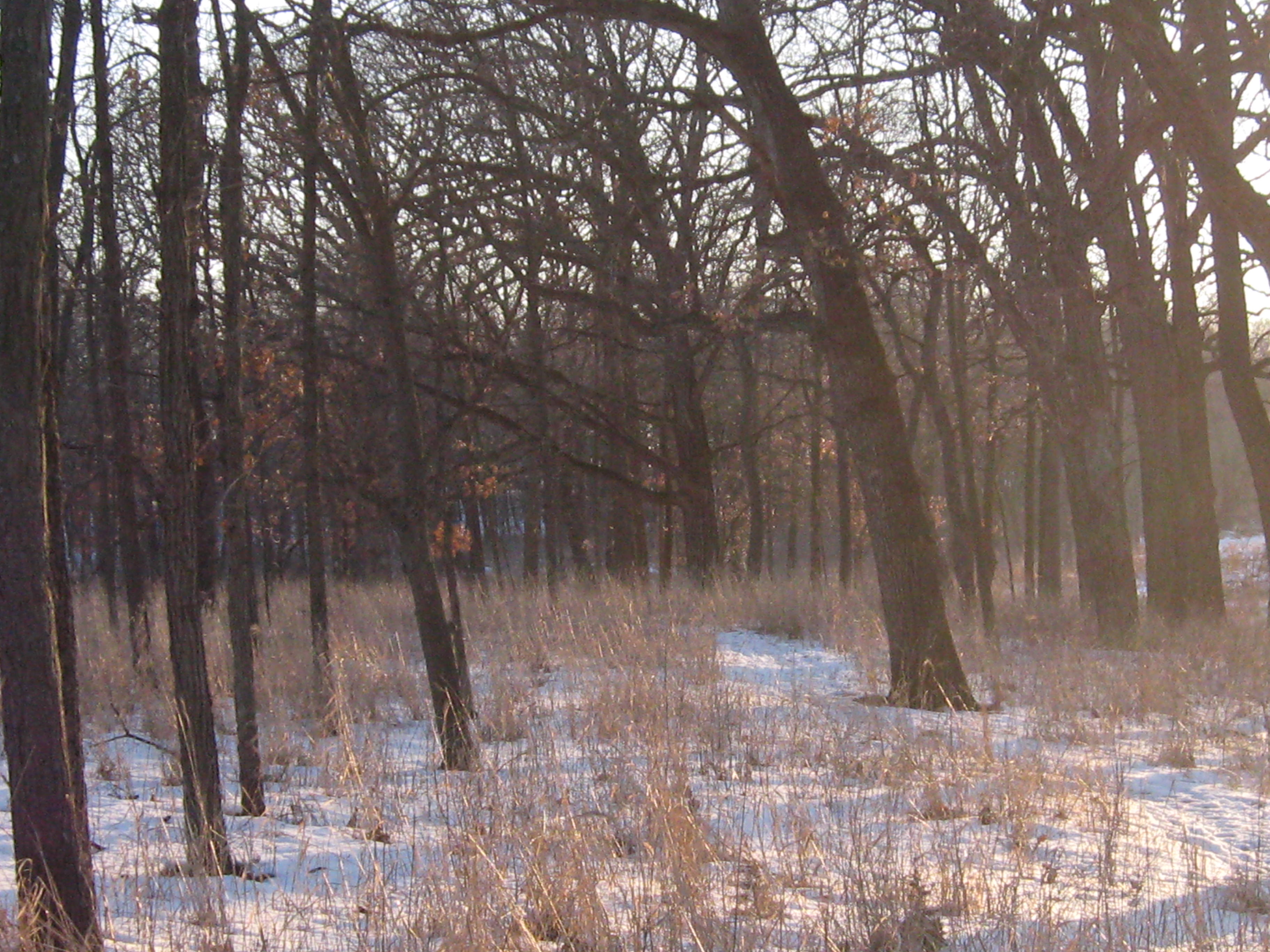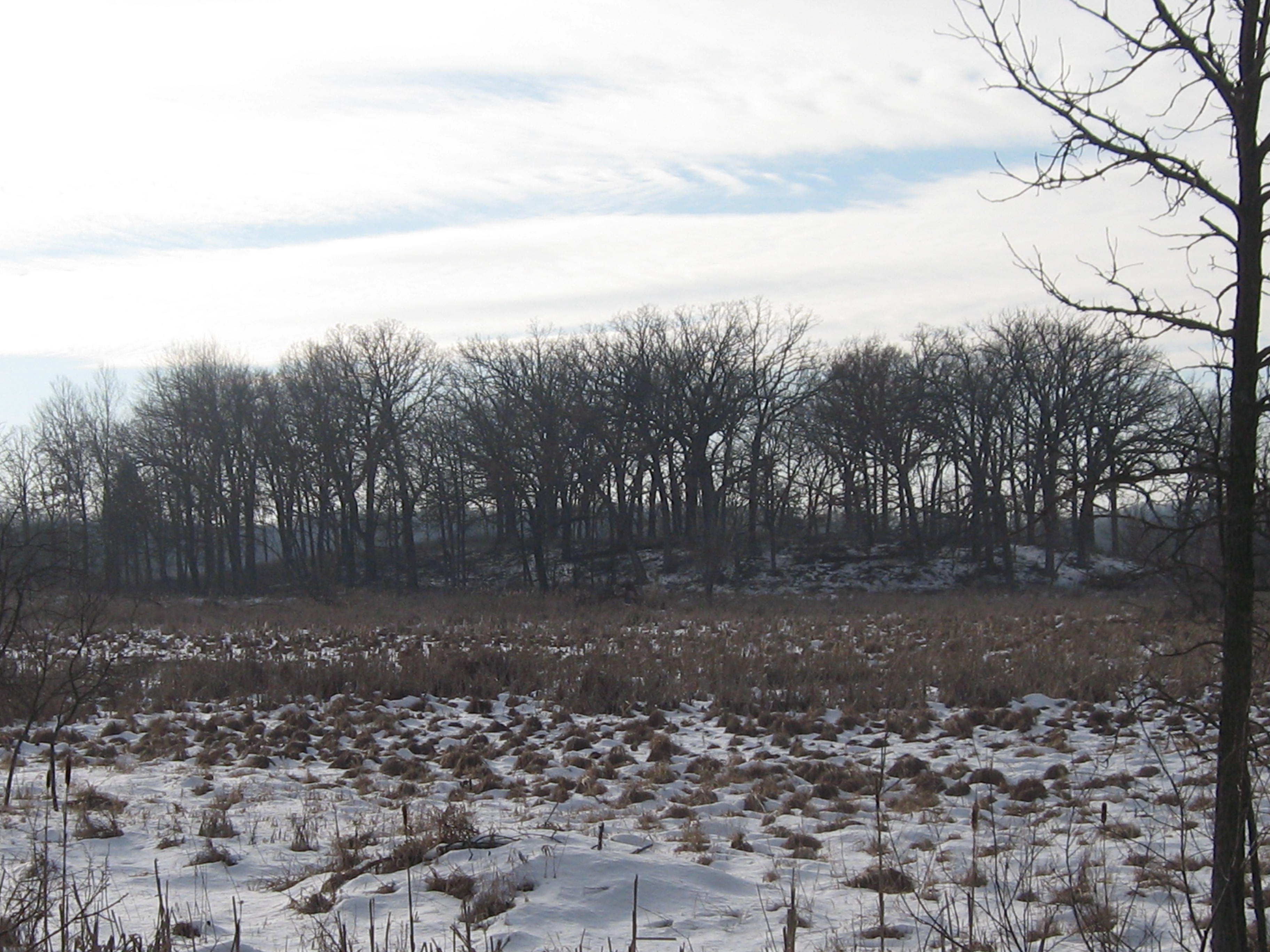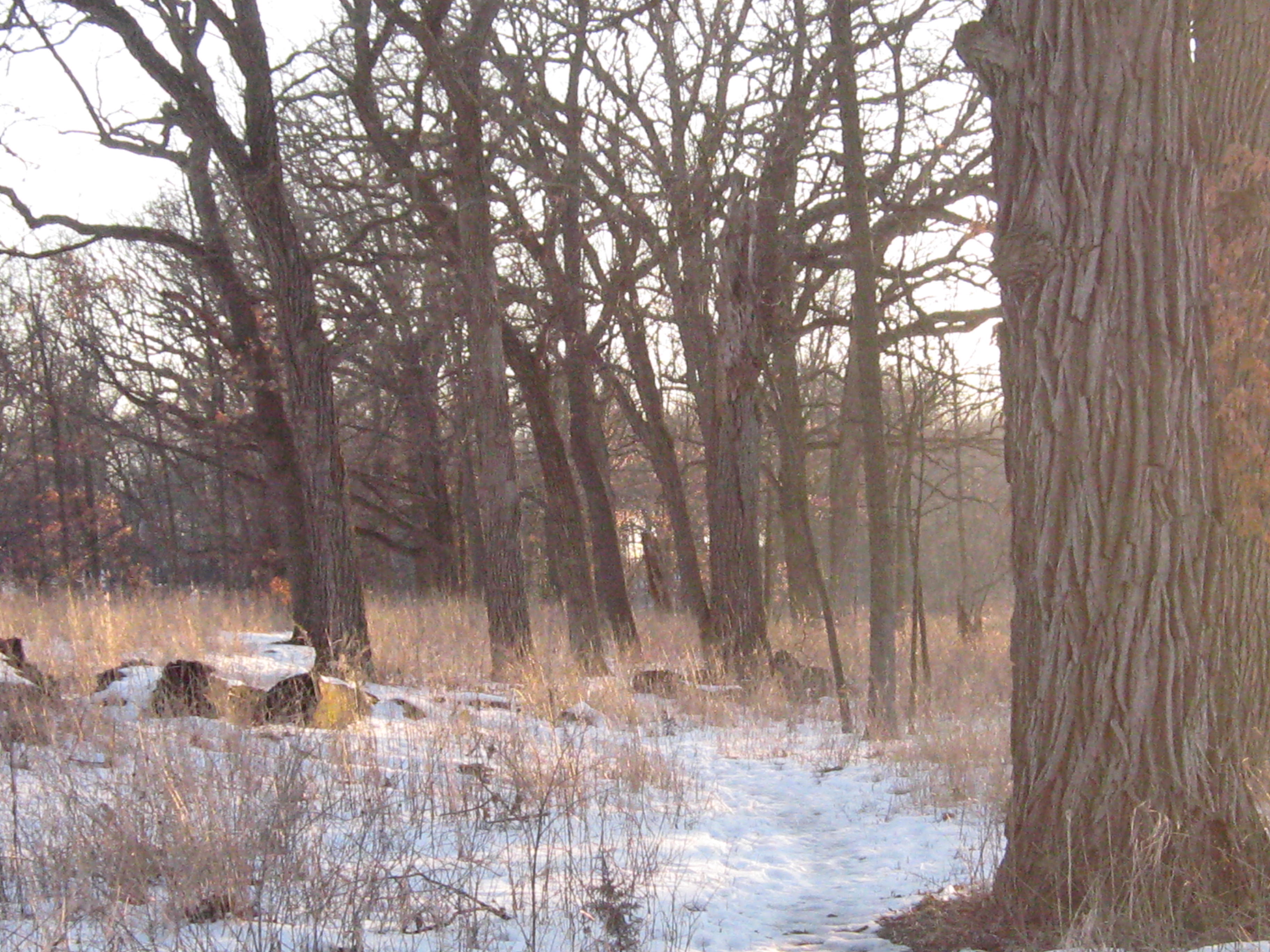 Here is the view from the sign above looking west down the loop trail. You can see the charred remains of burned buckthorn piles.