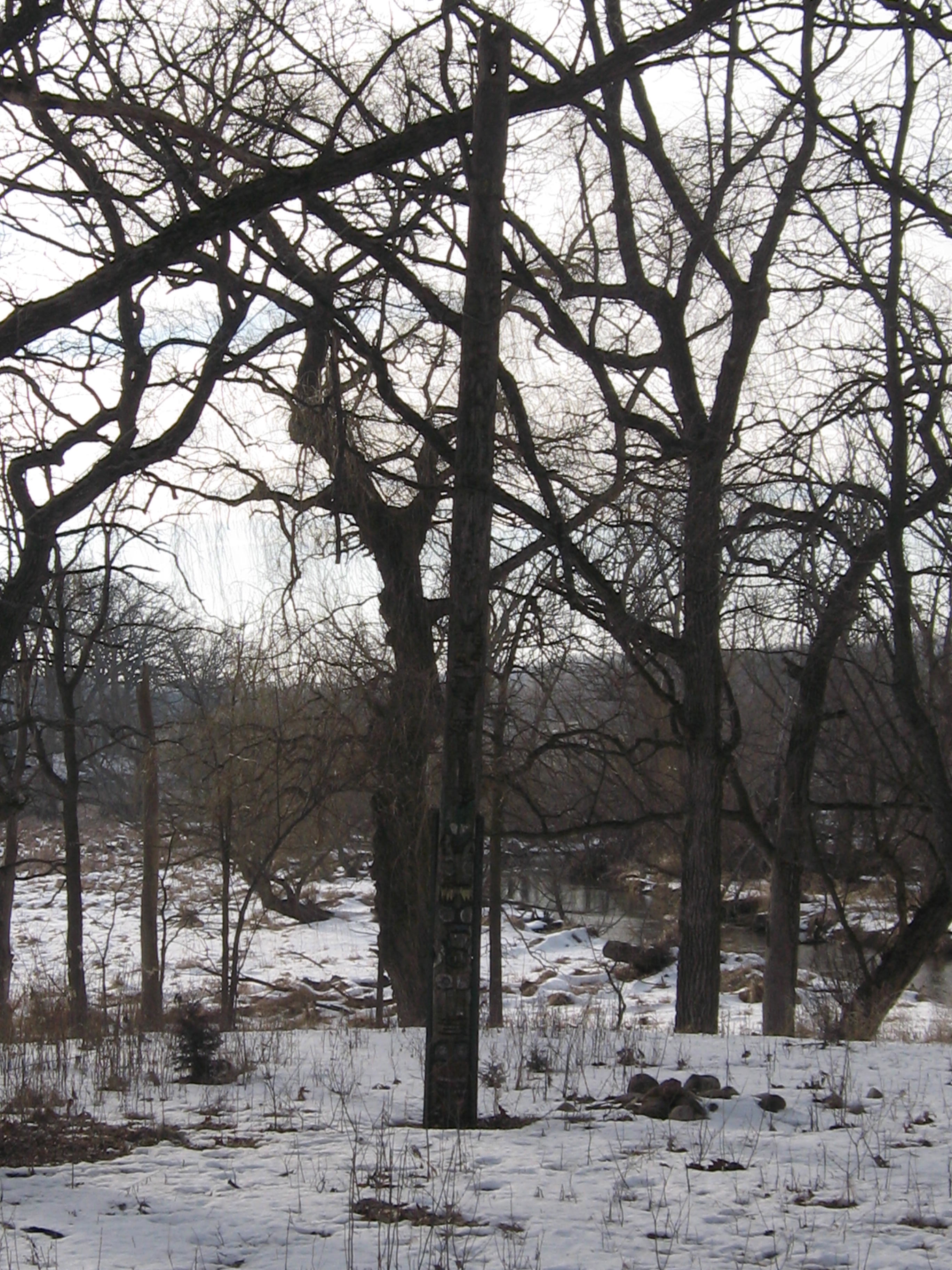 Upon their return from World War I, John and Jim Parker built a cozy home on top of a “low finely modeled hill” surrounded by springs and mature oak trees.  John Parker carved this totem pole, which I found laying on the hill above the river completely obscured by a buckthorn thicket.  Marlin Johnson, who was instrumental in acquiring this property for the Waukesha County Land Conservancy, and Brian Engel stood the pole up.