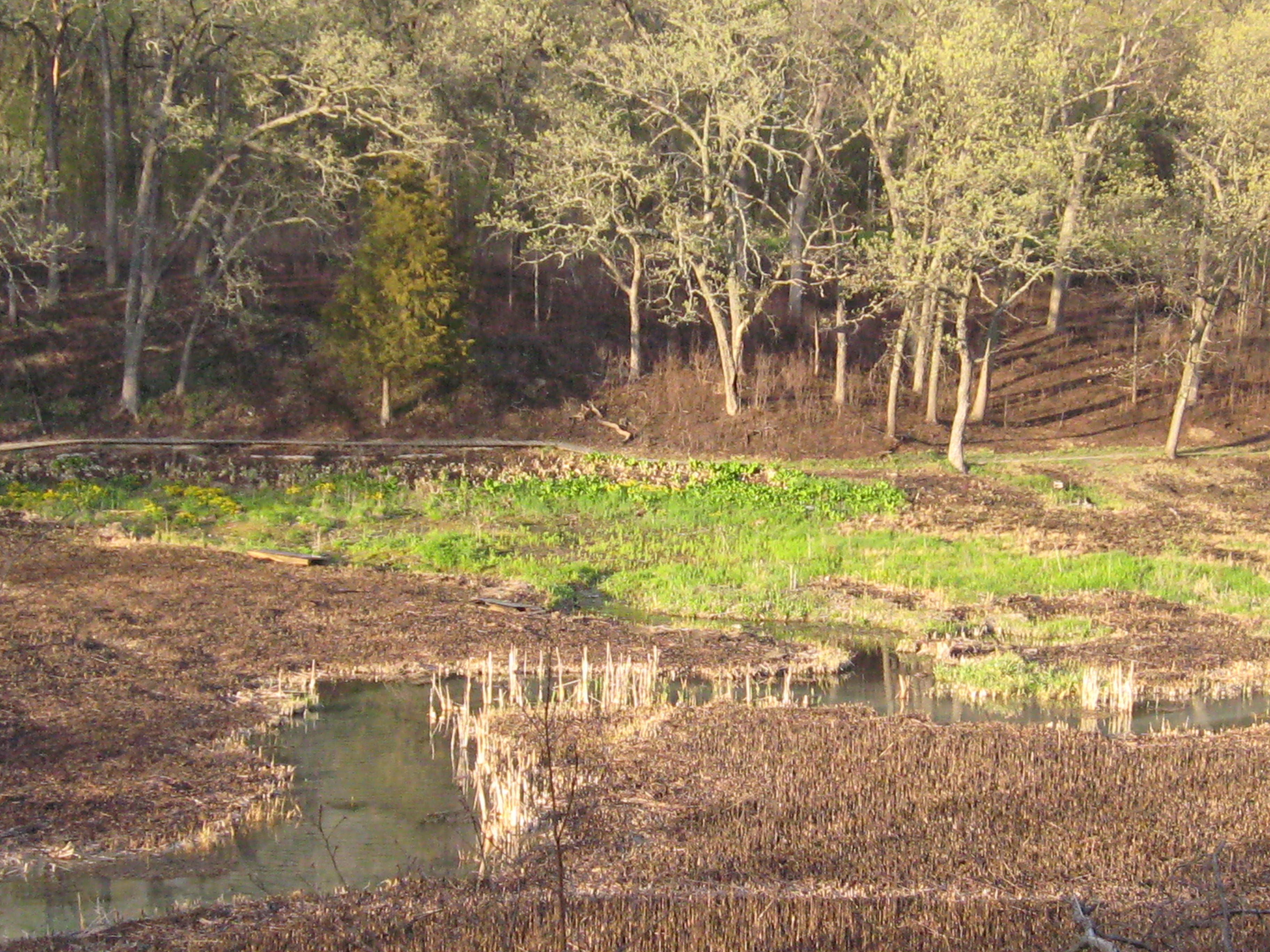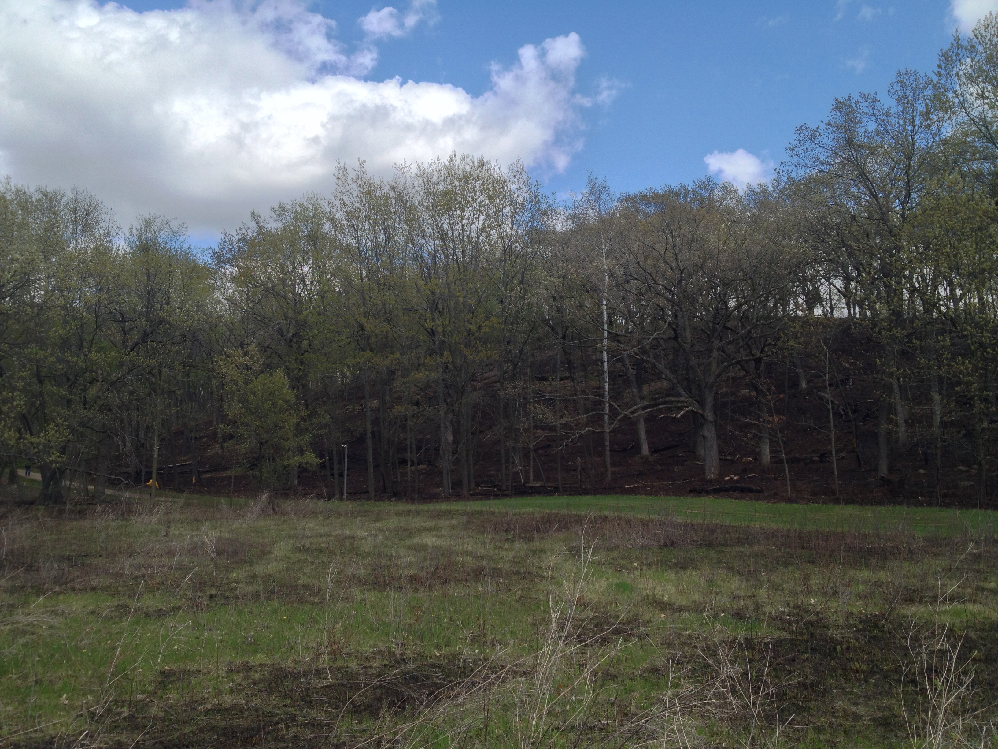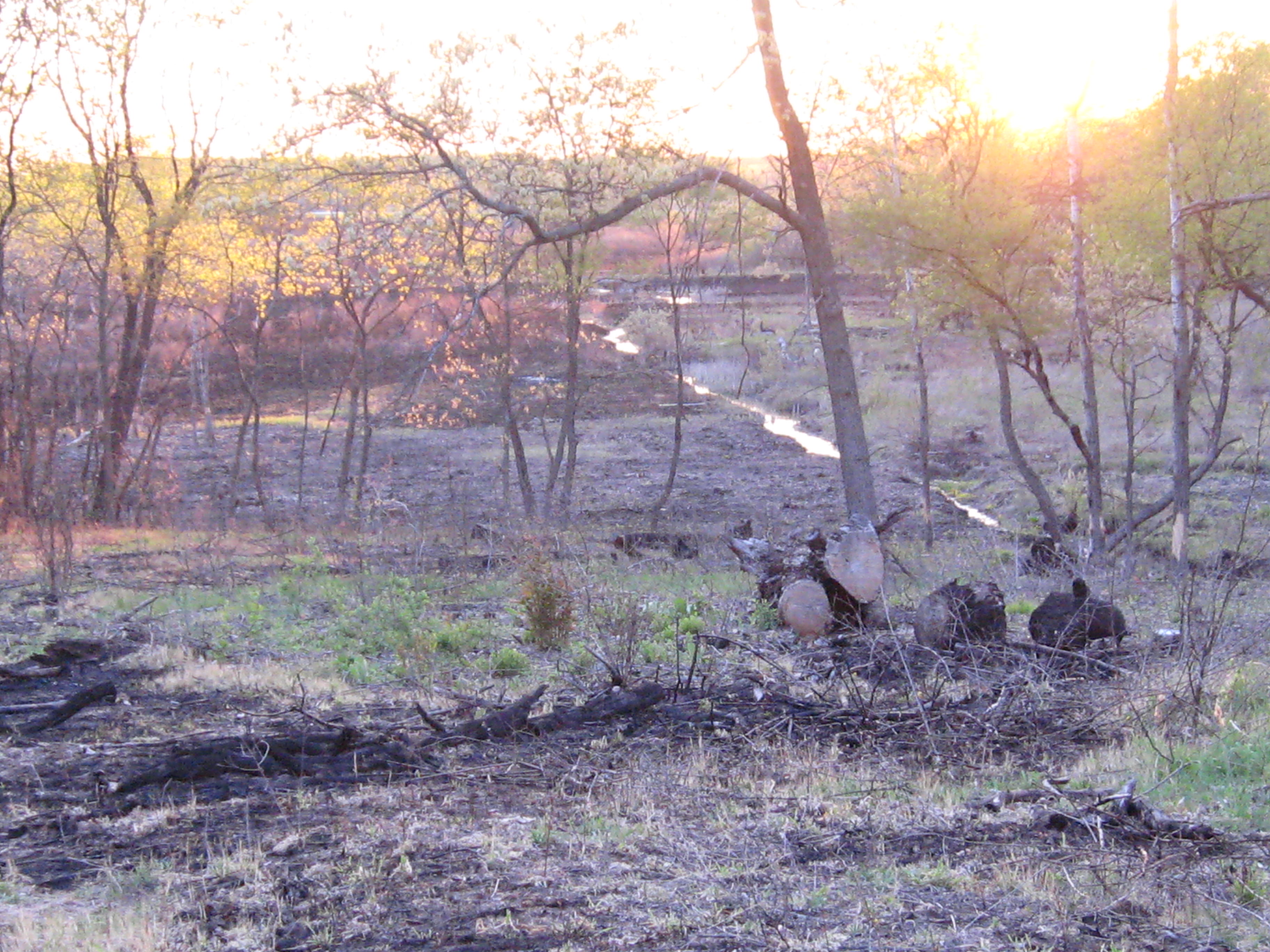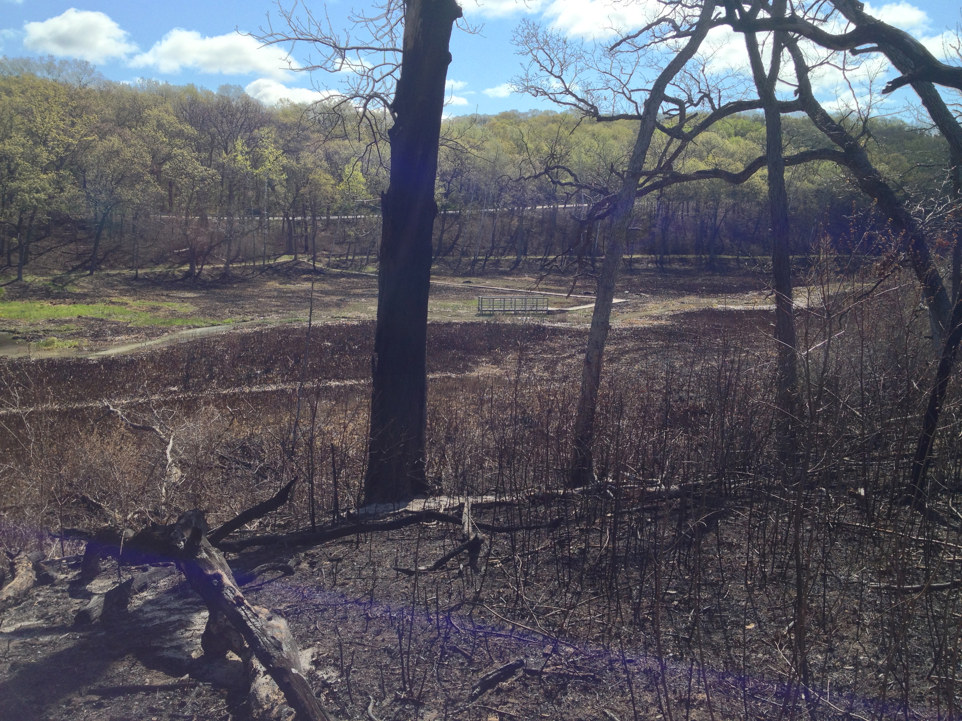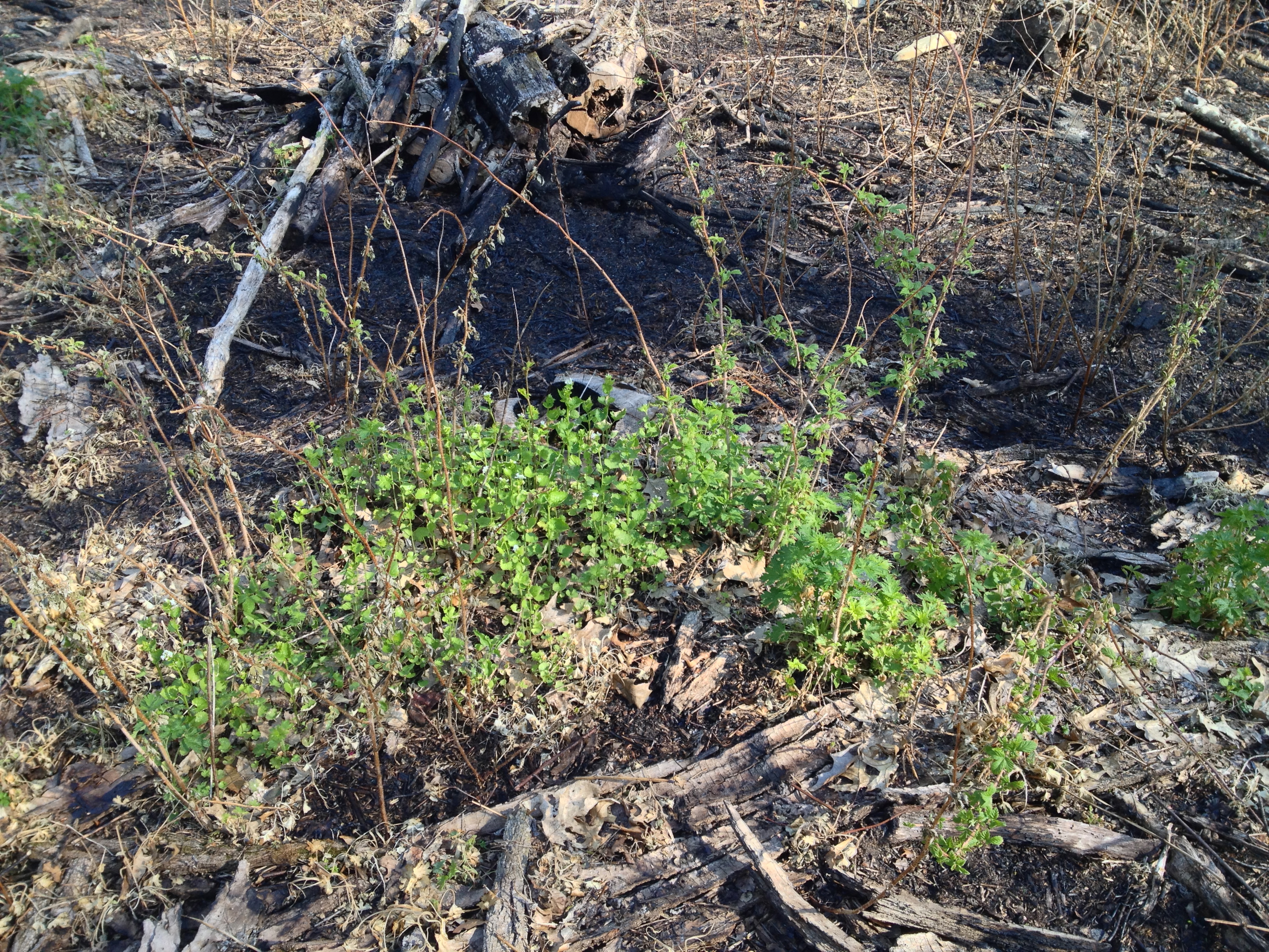 On Sunday, May 12th, I was back at The Springs. Wow, I wonder how long it will take for the forest floor to become green again. I wonder if the native flowers and grasses will have enough strength in their roots to push up fresh growth this year; or next. I began the day spraying garlic mustard, which appeared in isolated patches that escaped the fires.