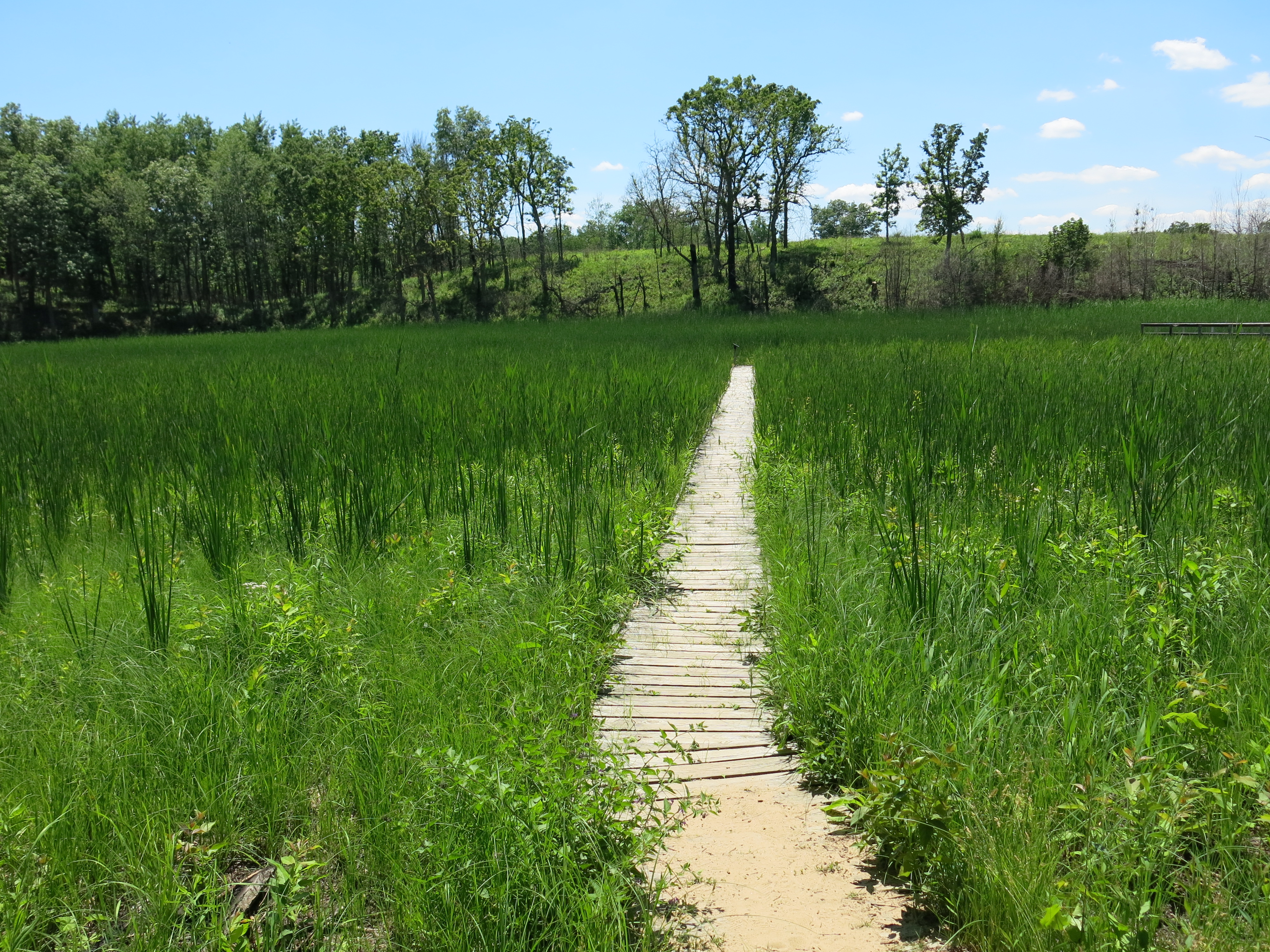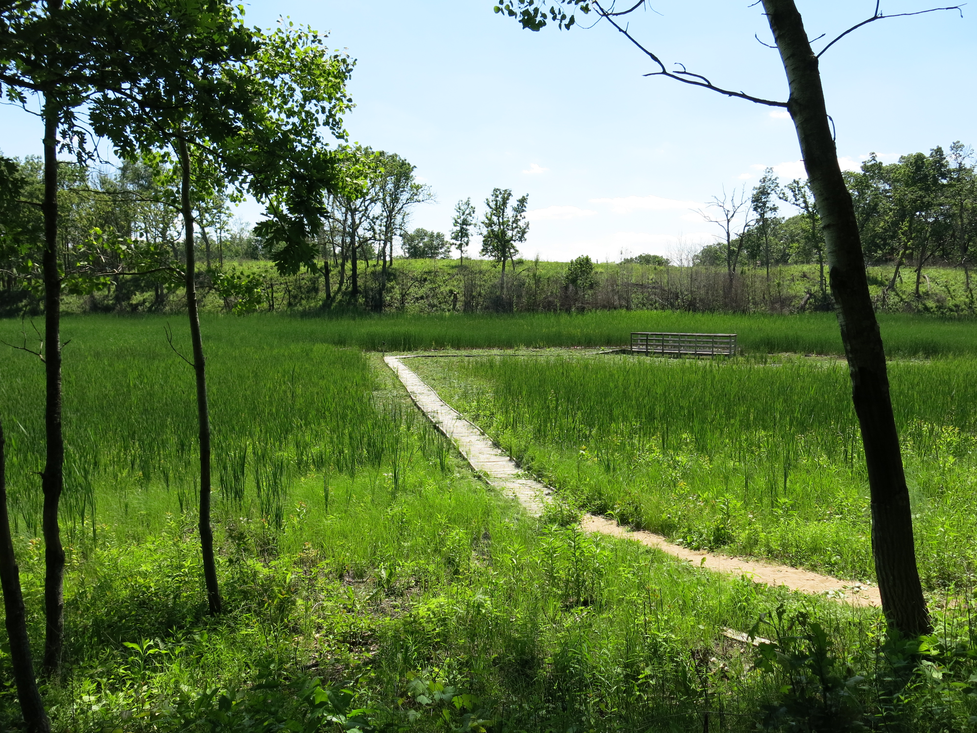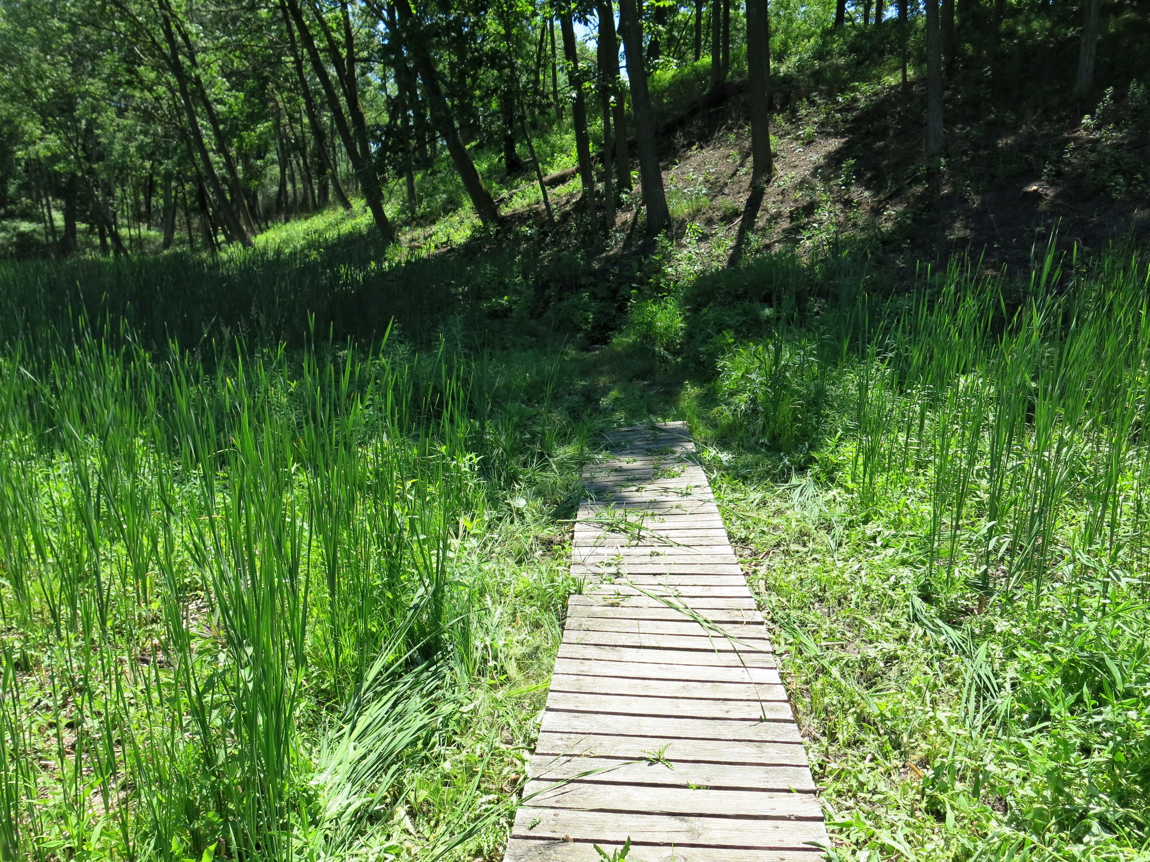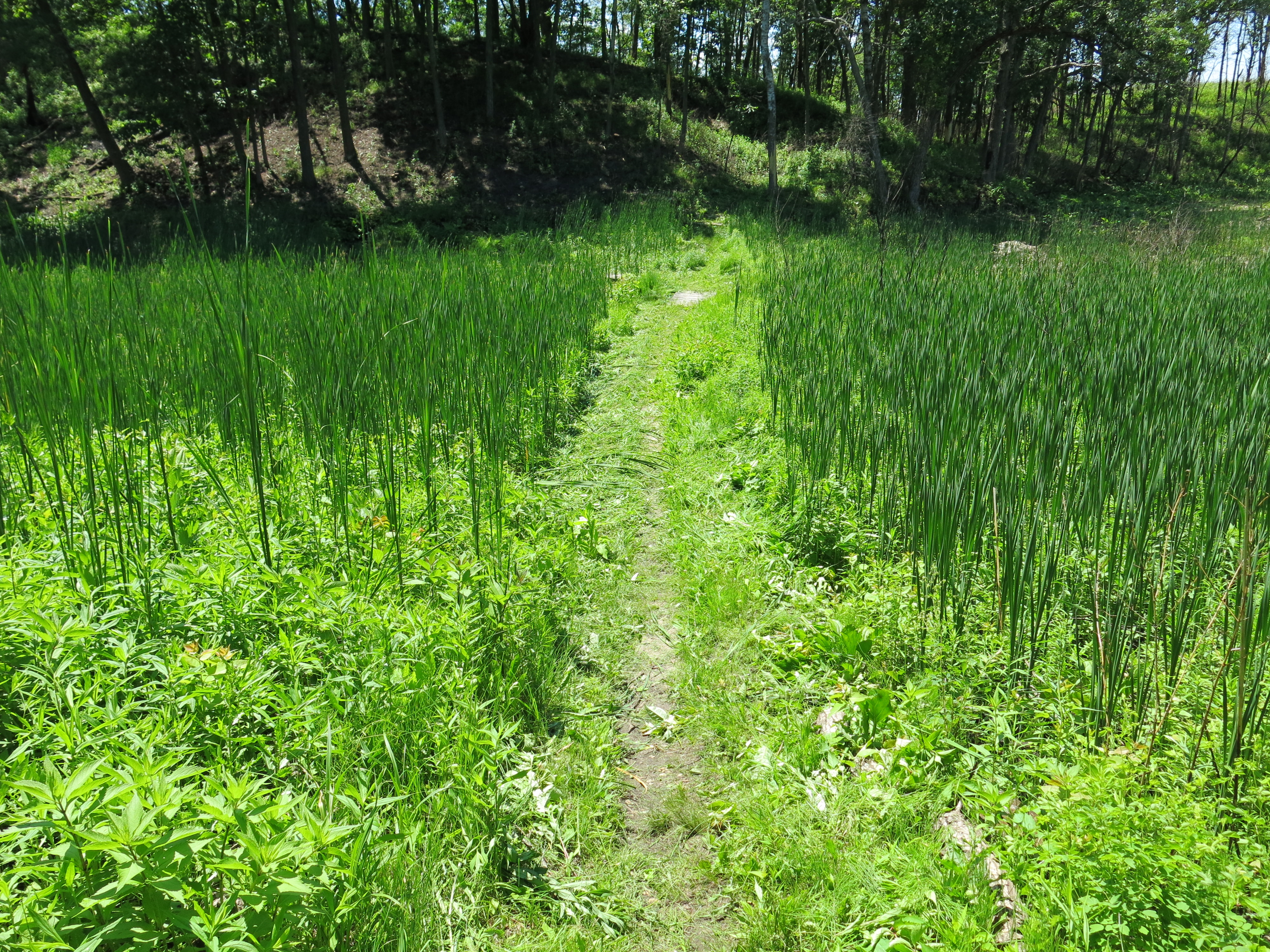 I cut cattails and willow resprouts at the Hatching House Springs and reed canary grass and buckthorn resprouts by the old hotel and barn sites. Jon Bradley mentioned in the last post that his expedition did not venture onto the cut-off trail because he “couldn’t see a definitive trail”. Indeed, a lot of aspen, buckthorn, honeysuckle and prickly ash has quickly sprouted so I went through the entire trail with the brush cutter to make it more evident. You can pick up the cut-off trail (aka, The Lost Trail) on your left as you walk along the main trail just past the long, tall, marl pit factory wall, on your right. Look for 4 logs laying parallel crossing a little drainage ditch and take this trail!