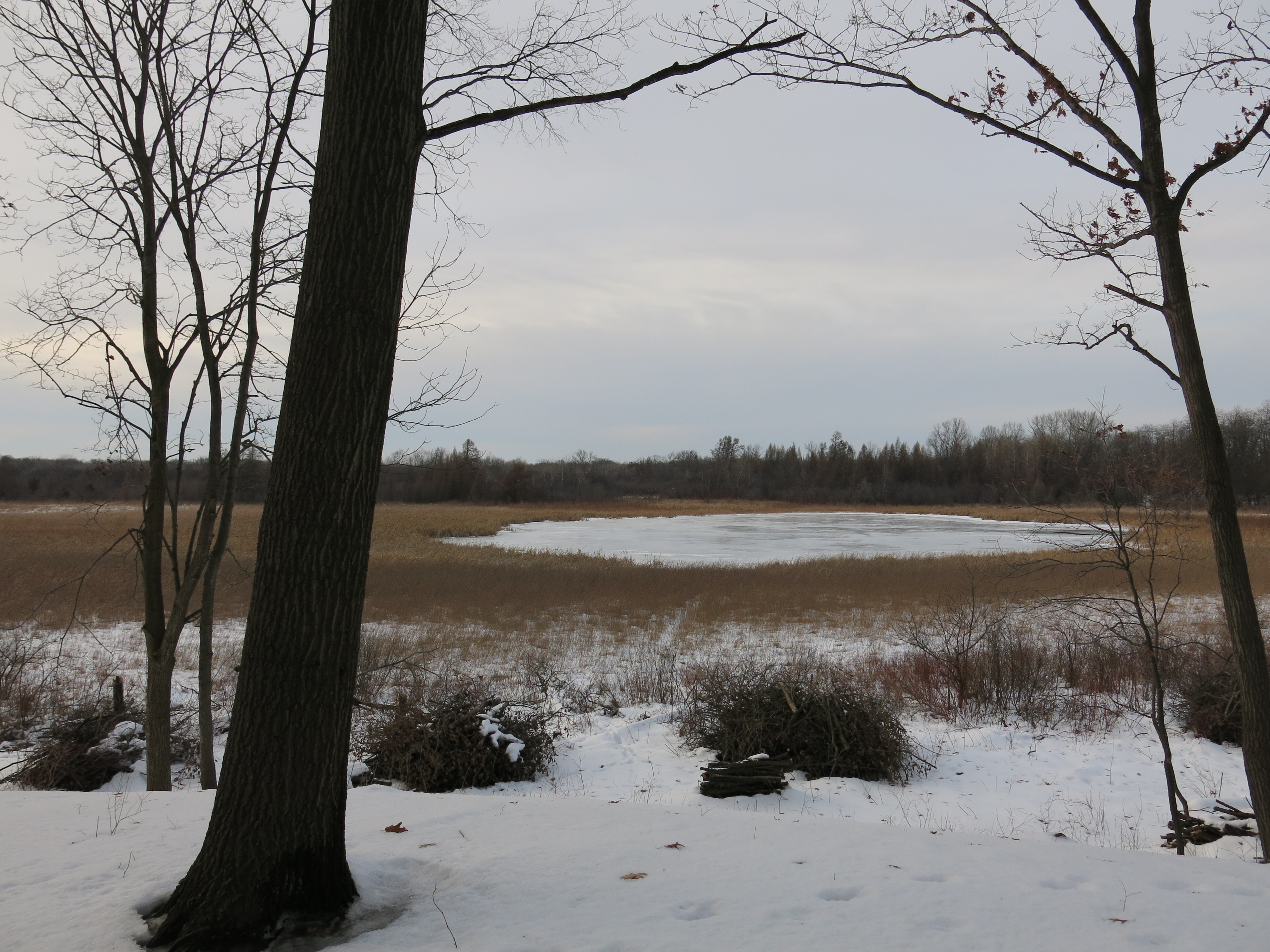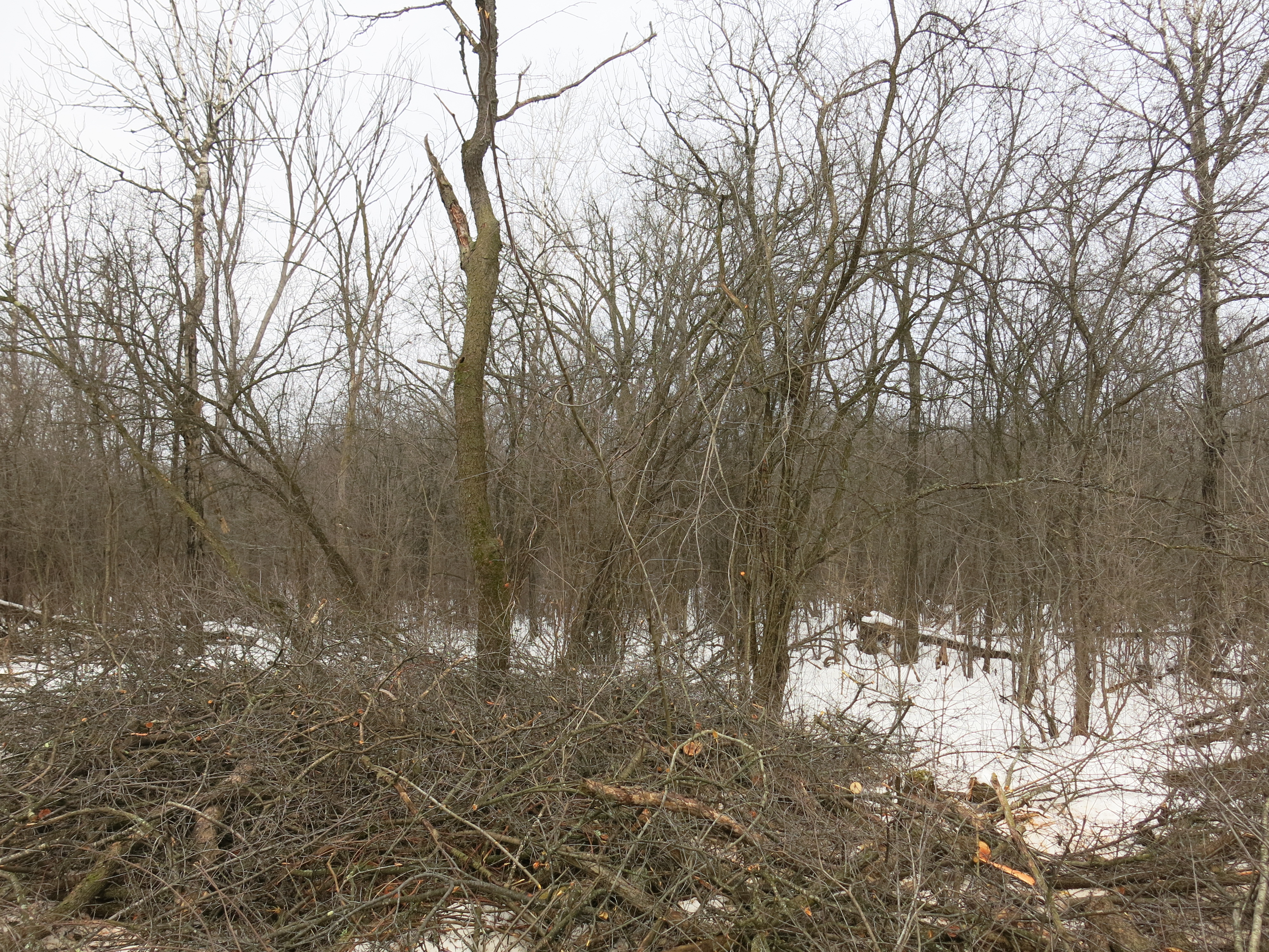Yesterday we got a break from the deep freeze and I took advantage of the benign weather to continue cutting along the trail that passes through the Buckthorn Alley. Below, I look north, east and southeast from the spot where we left off last time.