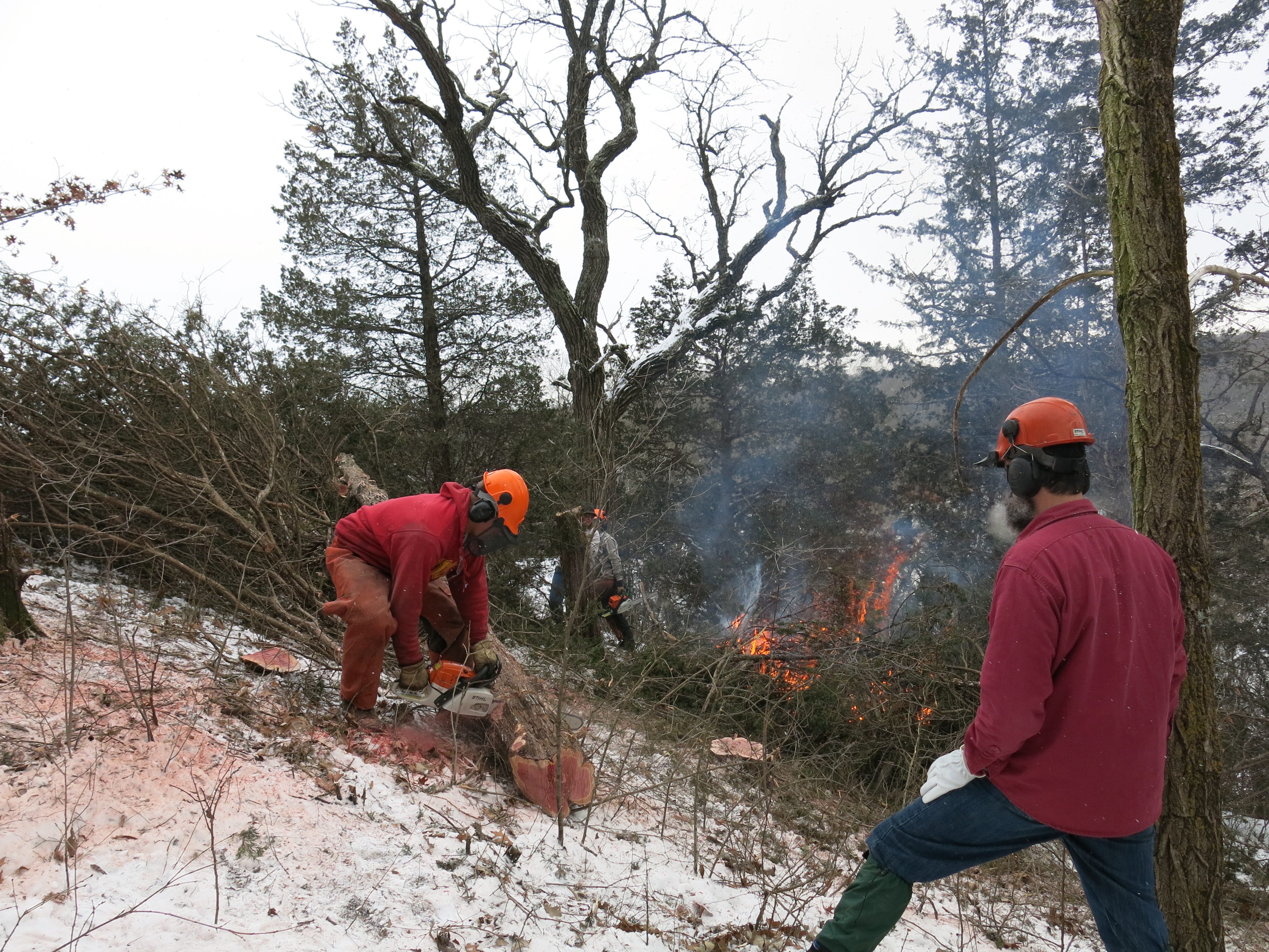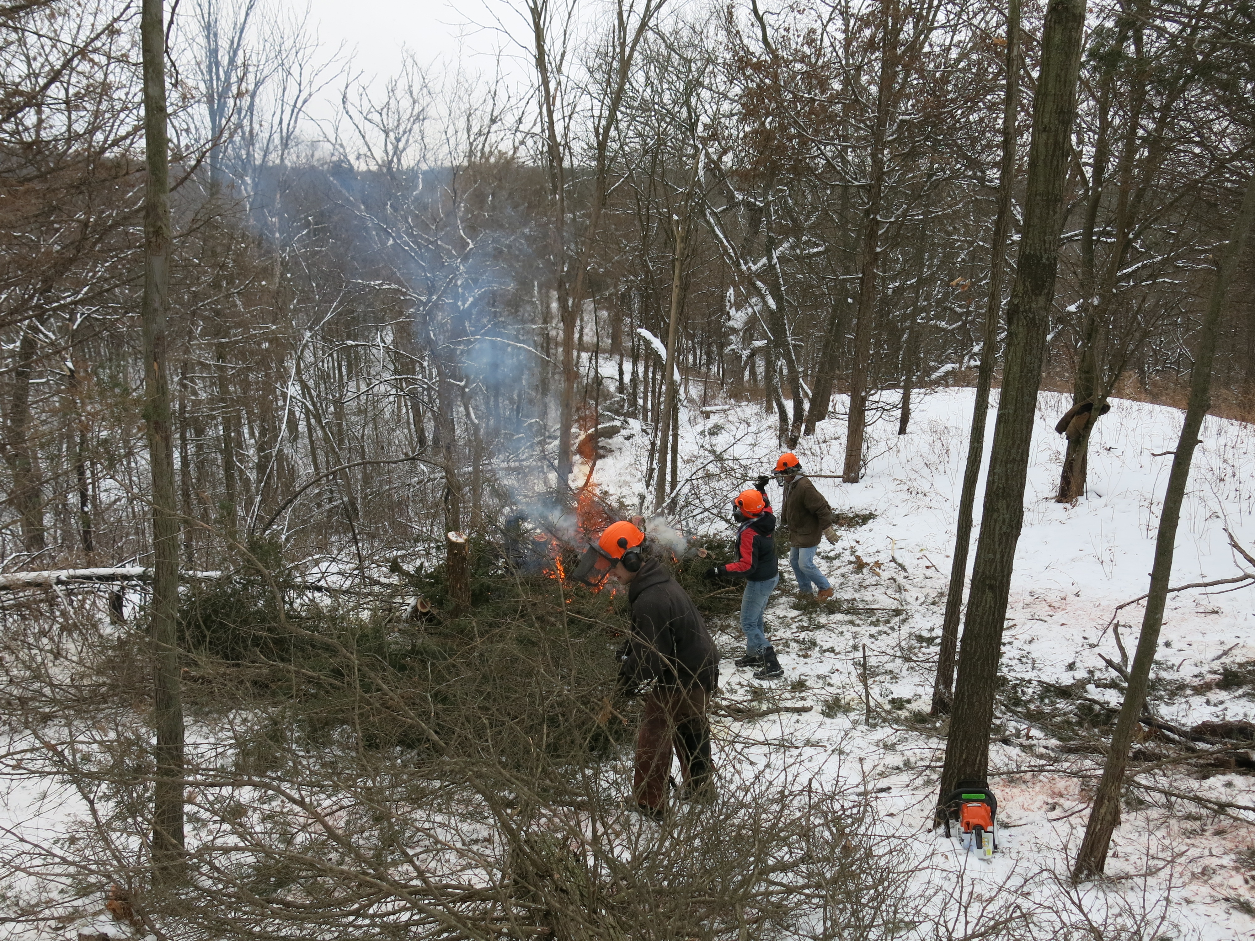 Long live the ER team! It was less than 2 years ago that Jared Urban began coordinating with local volunteers to adopt a State Natural Area and yesterday we saw the maturation of that effort in a splendid workday at the Eagle Oak Opening SNA. ER crew leader Jessica Renley, along with Jared, Adam Stone, Scott Stipetich and Don Dane formed the nucleus of a high powered and highly organized effort to remove red cedar and other unwanted trees from the Eagle Oak Opening.