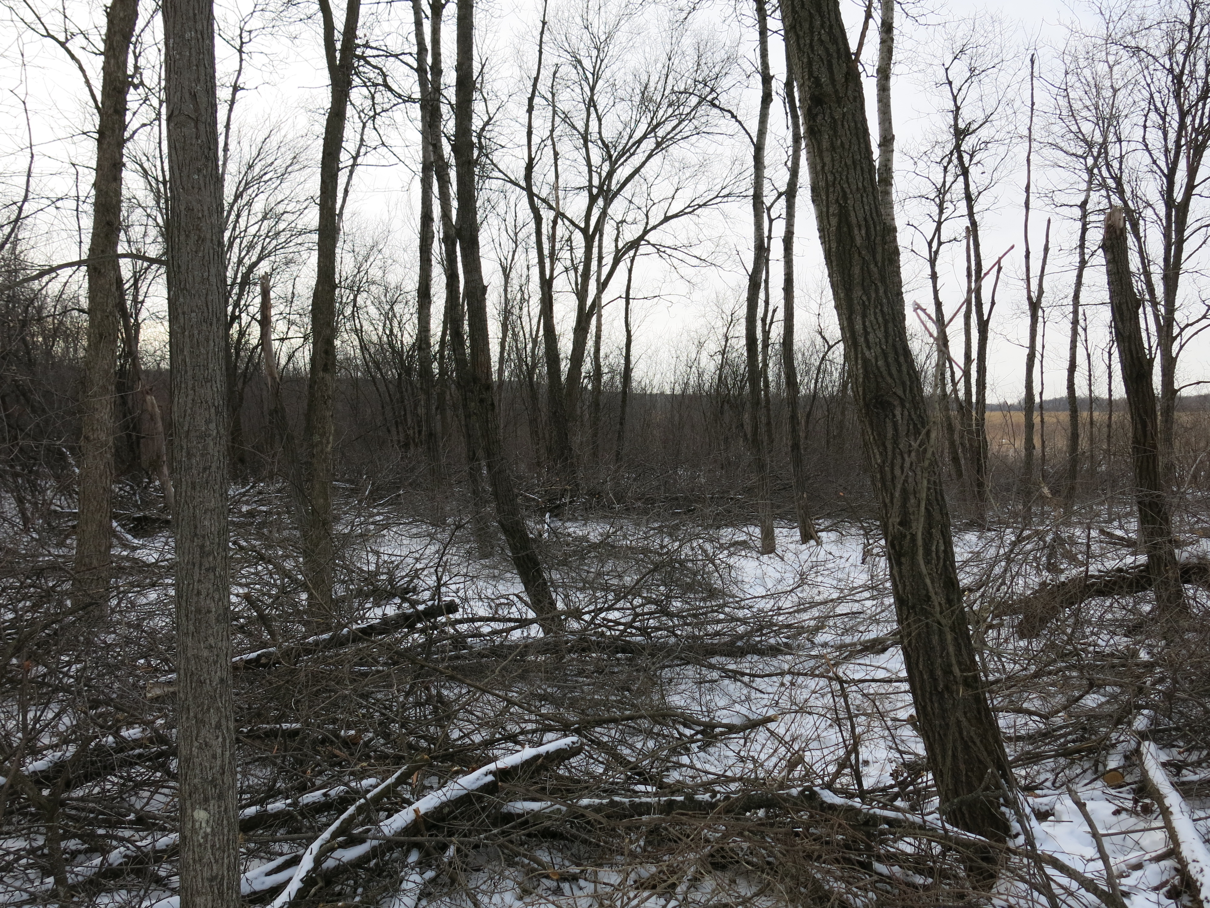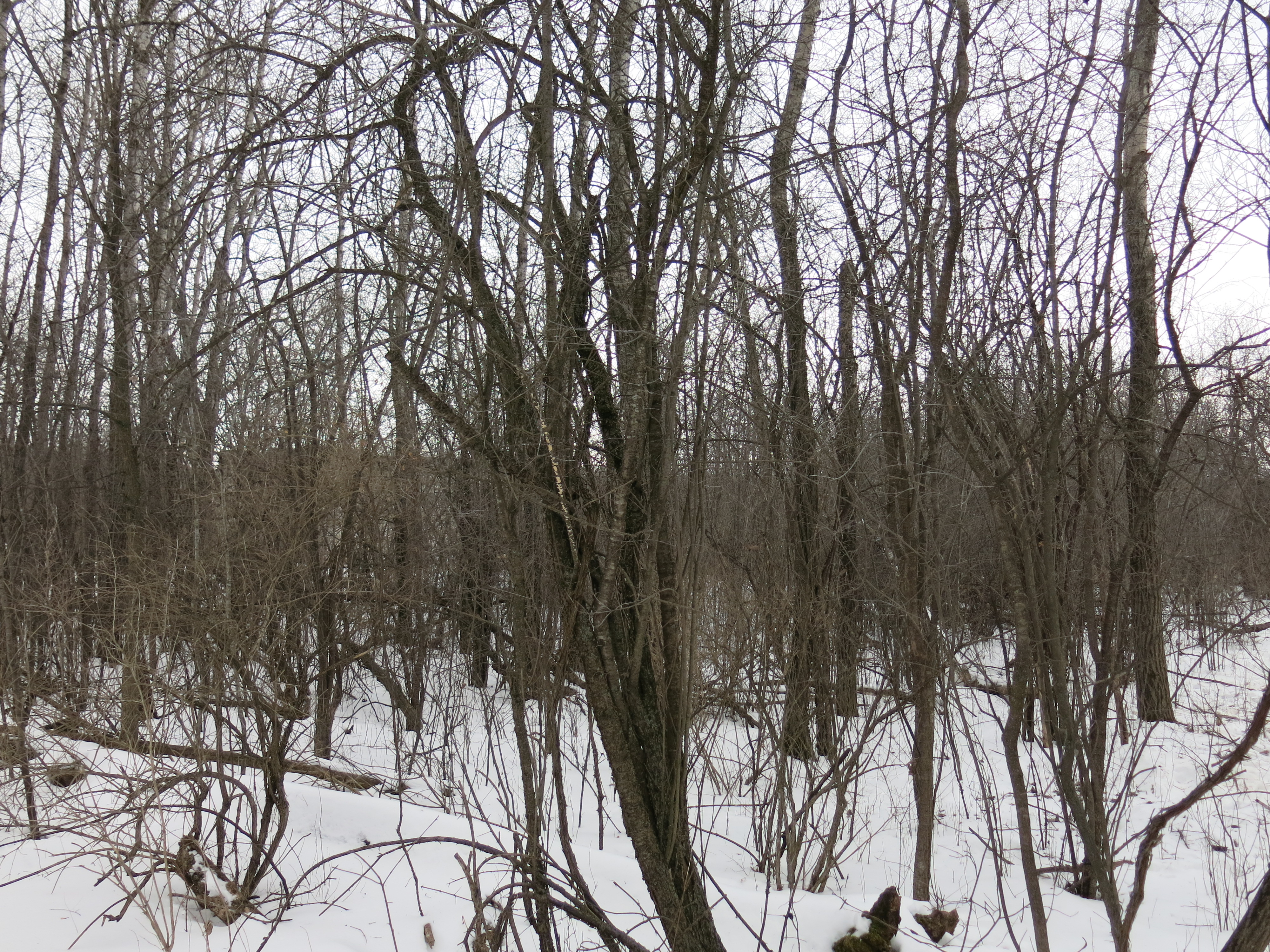 Last Monday, March 30th, I stabbed and slashed many a buckthorn on the north side of the north end of the loop trail, continuing where I left off last time. Here are four views, taken when I arrived, progressing from west to east.