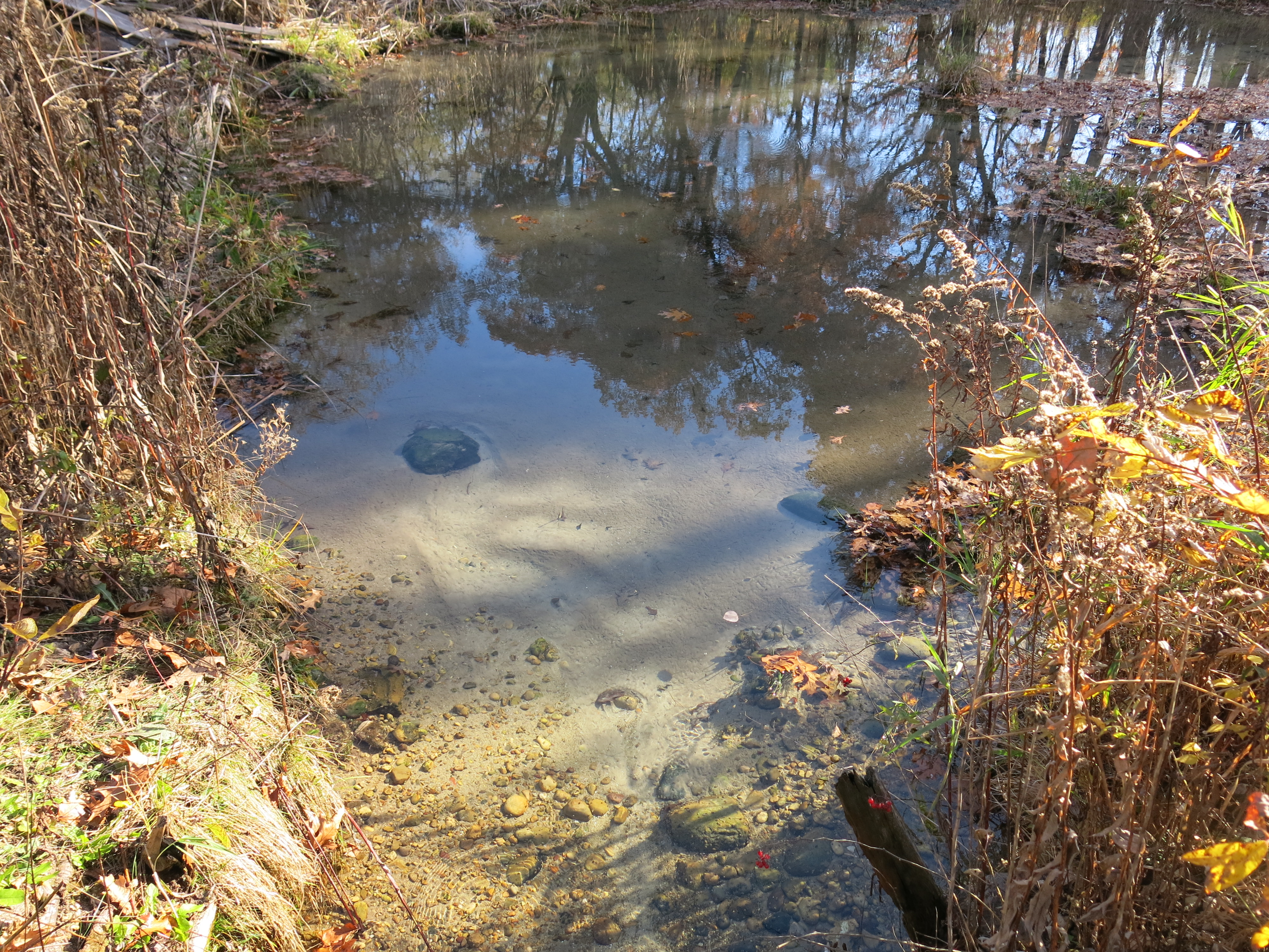 People I meet on the Scuppernong Springs Nature Trail tell me that they used to be able to see Ottawa Lake from the highway. Now, the only way you could possibly do that is via the drainage shown above. I was determined to reopen this view as a tease to draw people into exploring this beautiful area. At the end of the day on Wednesday, I followed the drainage up expecting to see the water emerging from a culvert that drains wetlands on the northeast side of Hwy 67. Instead, the culvert was dry and I found the source was a bubbling spring on the west side of the highway.