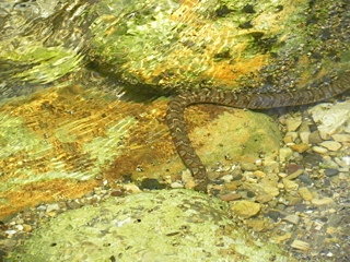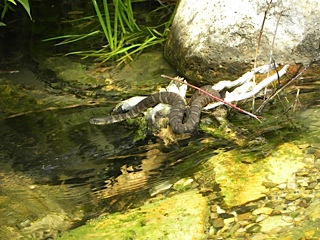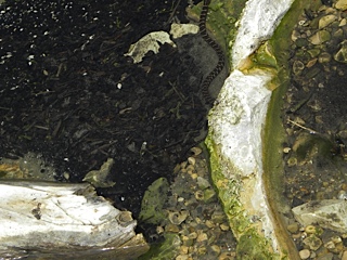 The photos below are from several dates. As we all recall it has been a brutally hot and abnormally dry summer. Many plants bloomed quite early . Once the hot weather set in Sue caught these images. On July 1st, these three snakes were observed in the creek, near the marl pit bridge. The two lighter colored snakes are Northern Water snakes, the one with his head under a rock is underwater in the middle of the creek, after a minute or two he came to the surface with what appeared to be a Slimy Sculpin in his mouth. He was pretty quick so Sue couldn’t quite get that shot. We had only a fleeting glimpse of the small Darker snake underwater so we didn’t positively ID it. Then she has a nice photo from July 9th which is a nice photo of a Hog Nosed snake. We have observed several of these in various locations. On one occasion we observed Mr Hog-nose with toad legs still hanging out of his mouth but we didn’t want to get closer or attempt a photo and disturb his well earned meal.