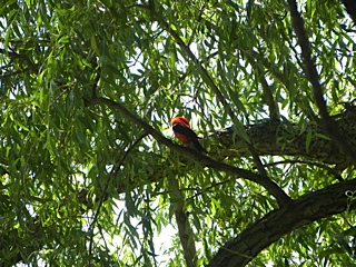 Sue and I wanted to send you these photos taken near what we call the Hotel Spring, from the trail guide, which is downstream from one of the wooden bridge crossings. The springs have a nice dolomite wall in an arc which is handy to sit on and cool your feet on these very hot summer days. Sitting on the dolomite wall arc and cooling our feet on June 26th, we were able to observe this beautiful scarlet tanager using the shade of the large willow that cools the rocky riffle area that has spring water flowing out over it. Numerous other species were flitting in and out of the willow and the shaded riffle area. We speculated that the combination of shade, firm rocky riffle with cool water and some over head protection from a possible predation from Copper’s hawks made this a special area for a number of bird species.