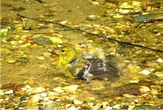 On July 1st ( still beastly hot) this female goldfinch and waxwing were again enjoying the shaded, cooled riffle area. We have seen many bird species flying in and out and perching on many different plants and areas all along the trails. The variety of birds and numbers taking advantage of this spot surprised us and after documenting this use we thought it important to mention to you.
