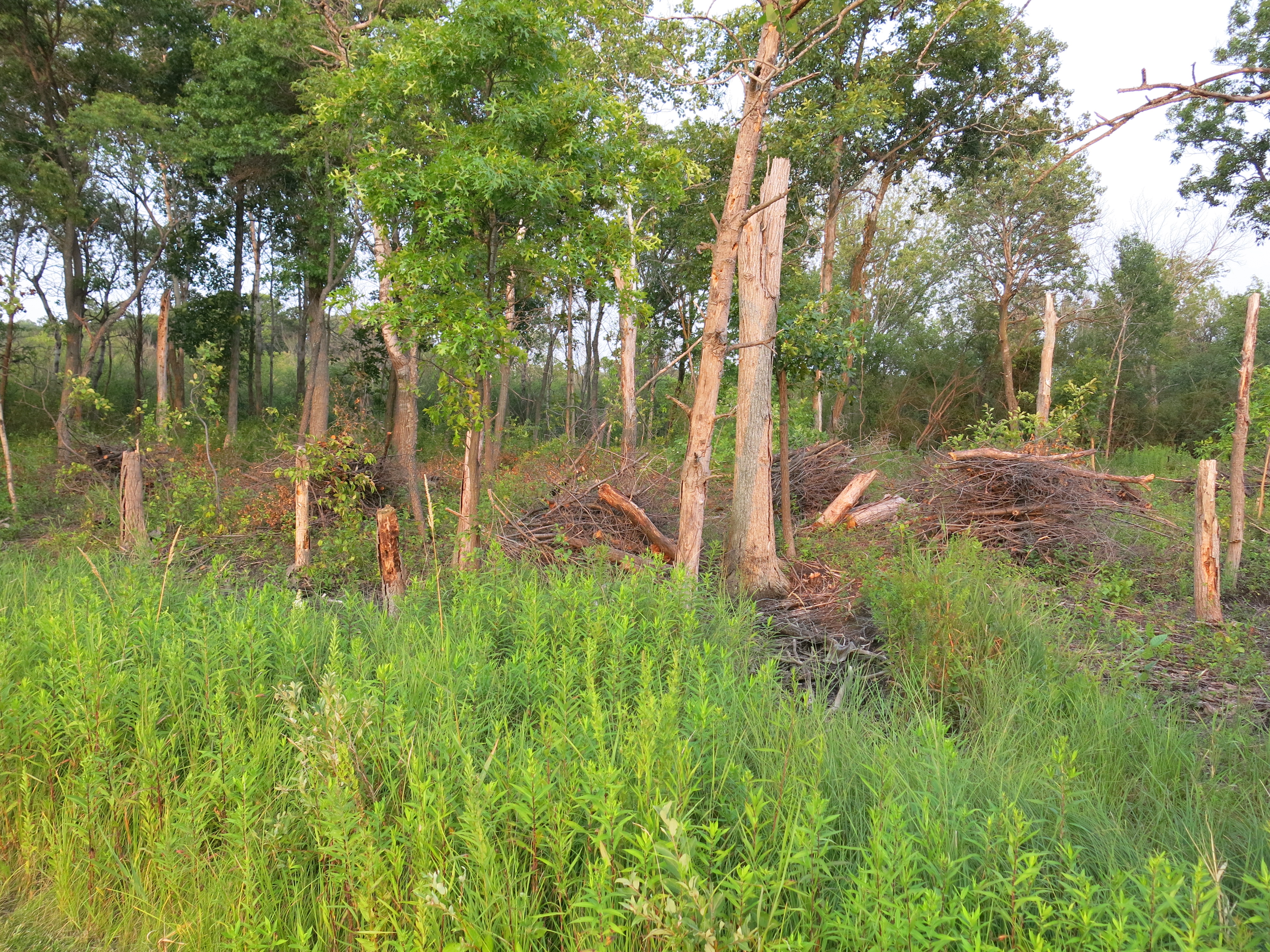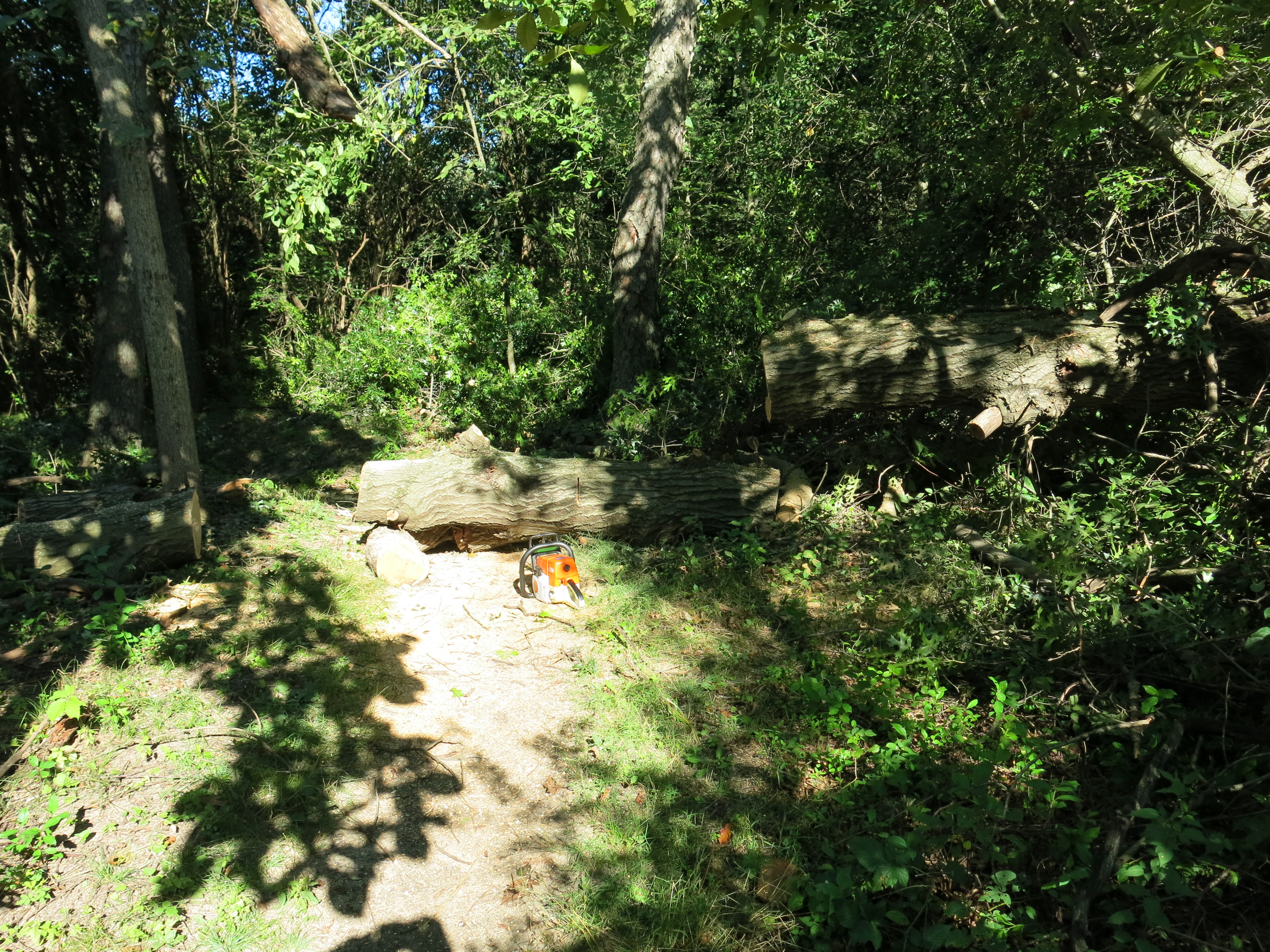 On Thursday, I was joined in the morning by a new volunteer named Dave Kieffer, who took a vacation from his project management role to help me out. Dave worked the brush cutter and I swung the chainsaw in the area marked in blue above that is closest to the cut-off trail.