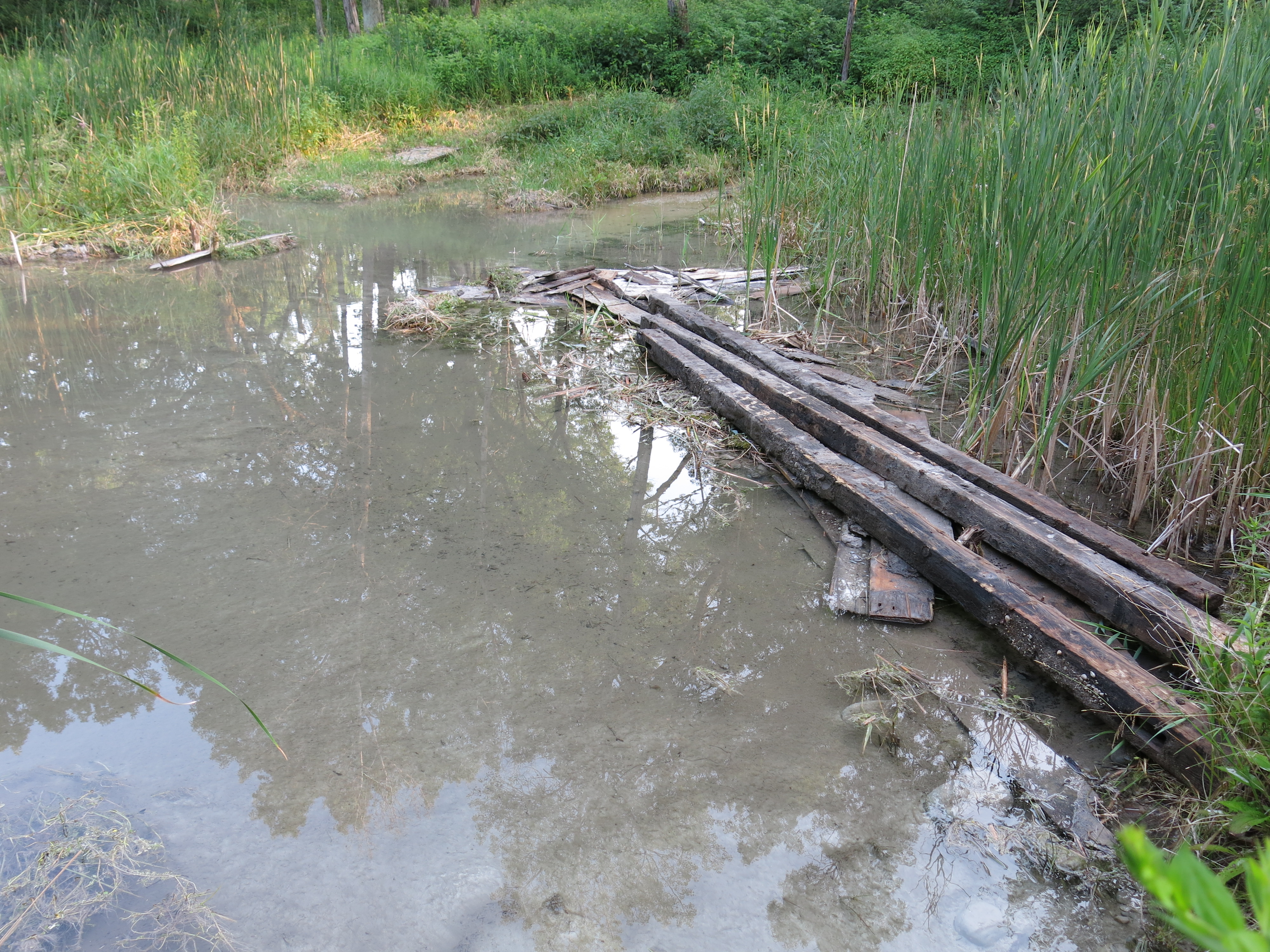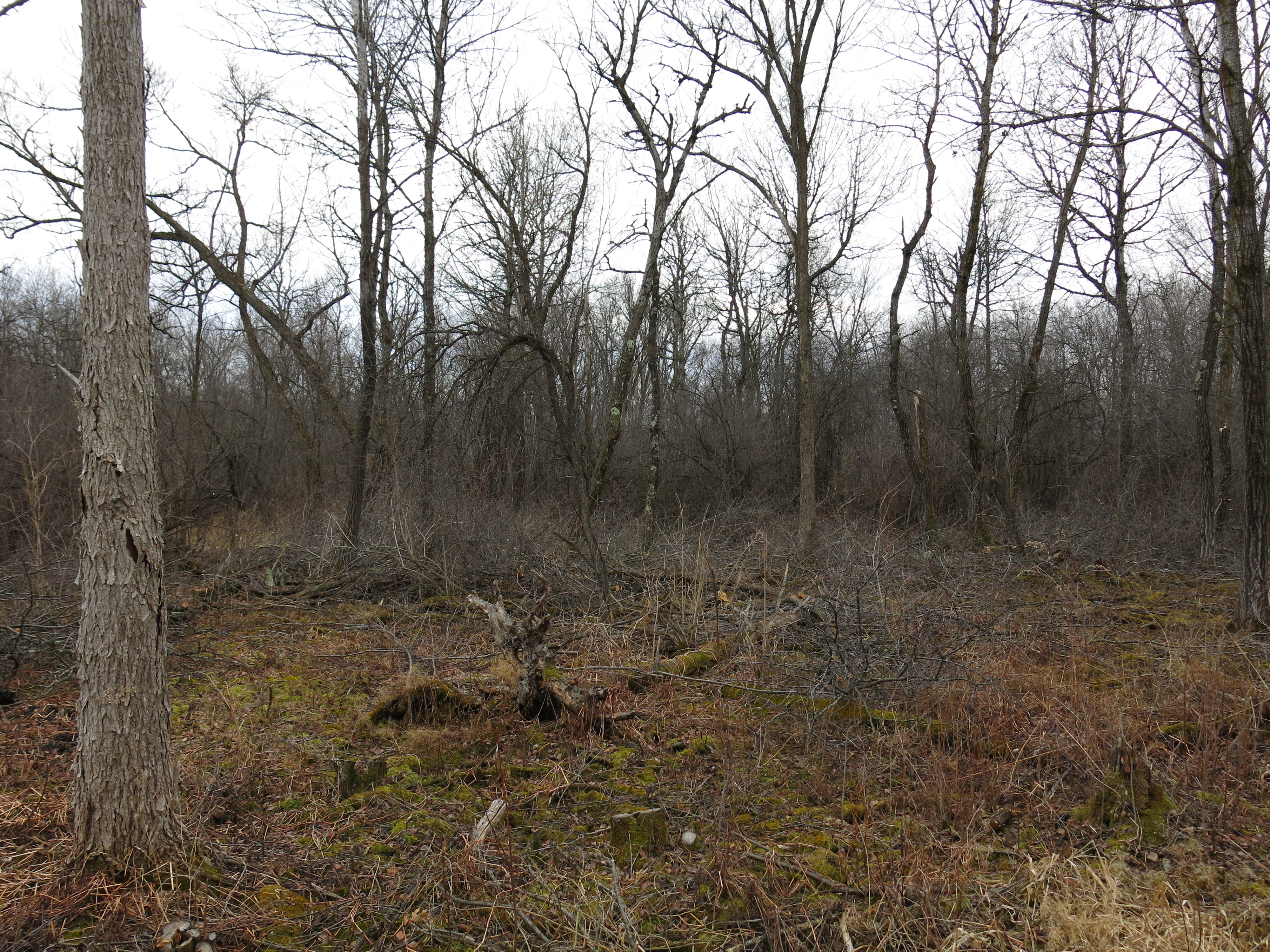 After weeks of cramming to prepare my defense against the band of thieves and robbers known as government, for my “day in court”, I needed a day in the woods with my chainsaw to settle my nerves. I returned to the marl factory on March 12th to attack the last stand of buckthorn on the wedge of land between the Tibby Line railroad tracks (signpost #2) and Marl Pit Bridge (signpost #4). Below, the area as seen from signpost #4.