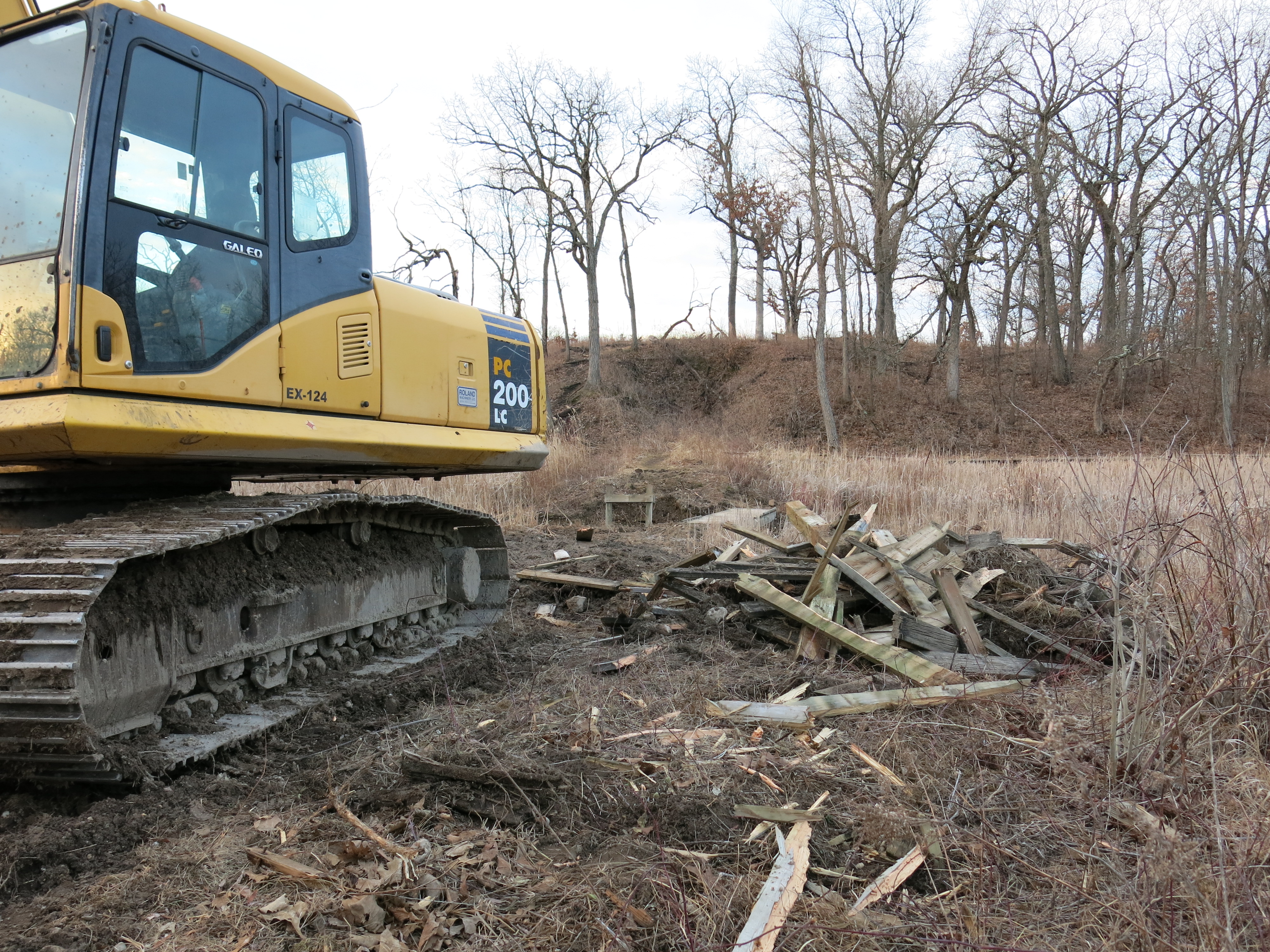 Abe Wittenwyler, heavy equipment operator with the DNR, wasn’t looking for a pot of gold under the Hotel Spring bridge; he had come to excavate the riverbed to address the hydrology issues that Ben Heussner identified as a result of the elevation survey the DNR conducted last year. I called Ben for an update, left a message, and got to work cutting buckthorn in the wetlands just down the trail — to the left — from the main parking lot on Hwy ZZ. Here is how it looked before I got started.