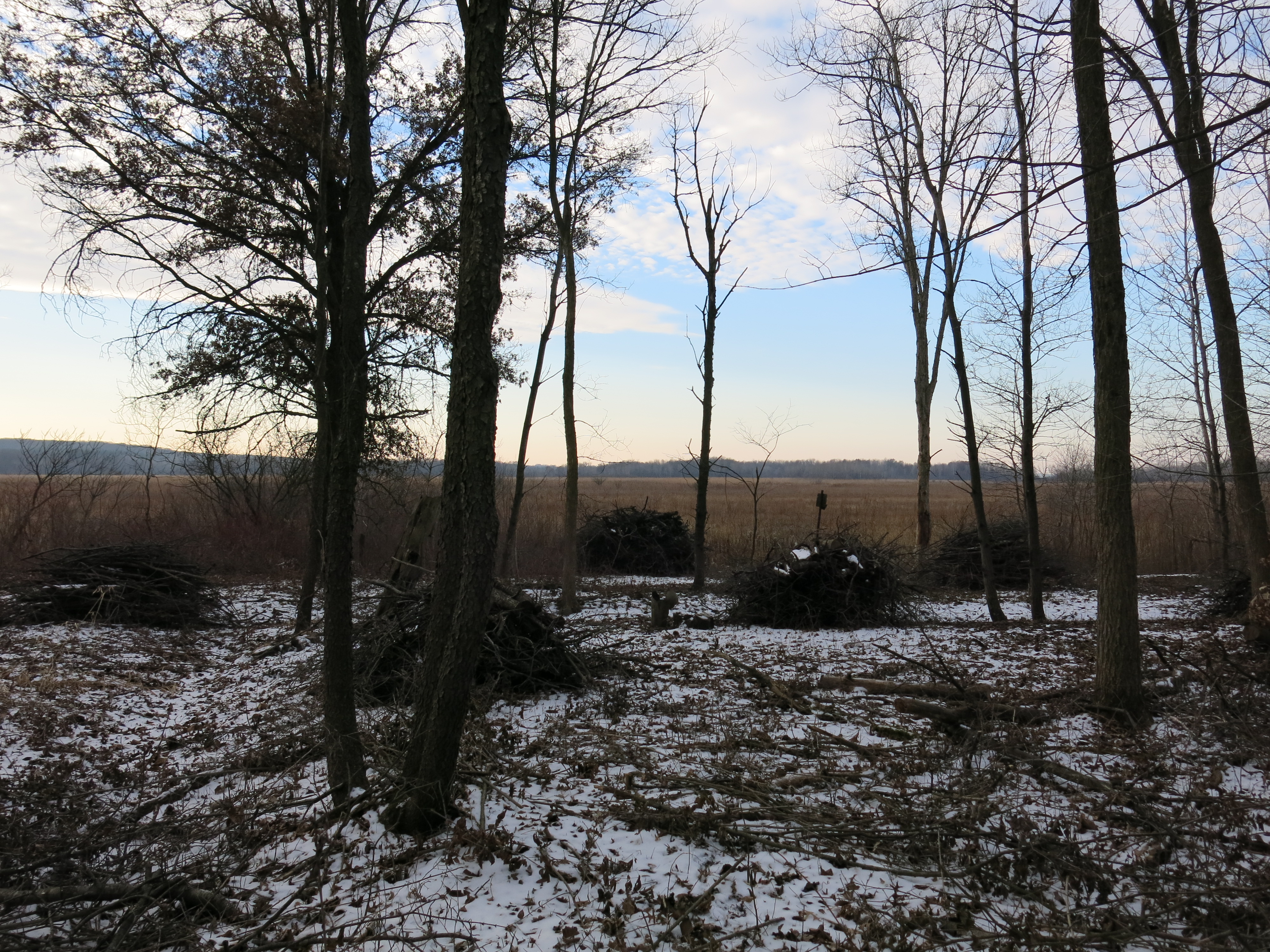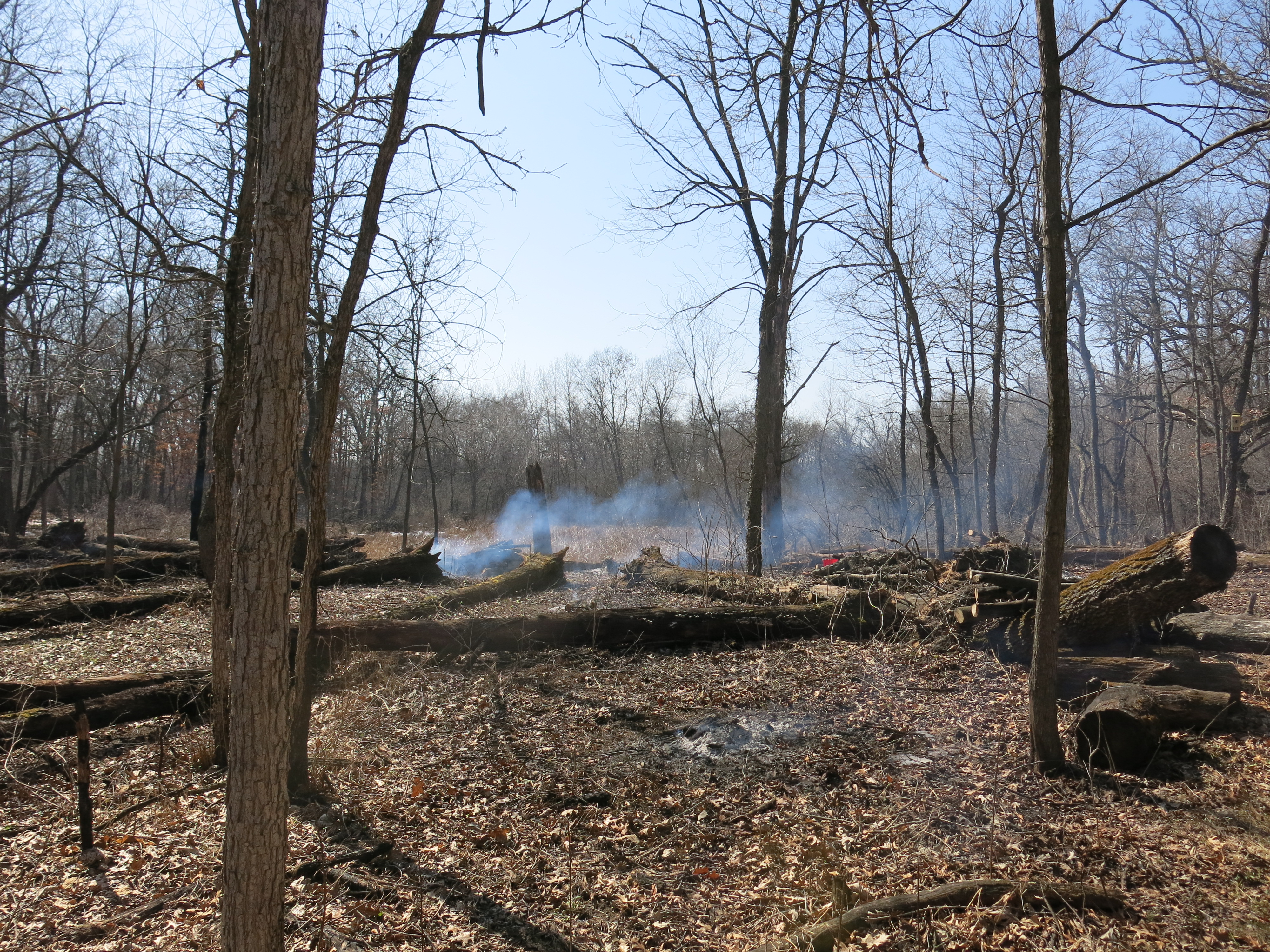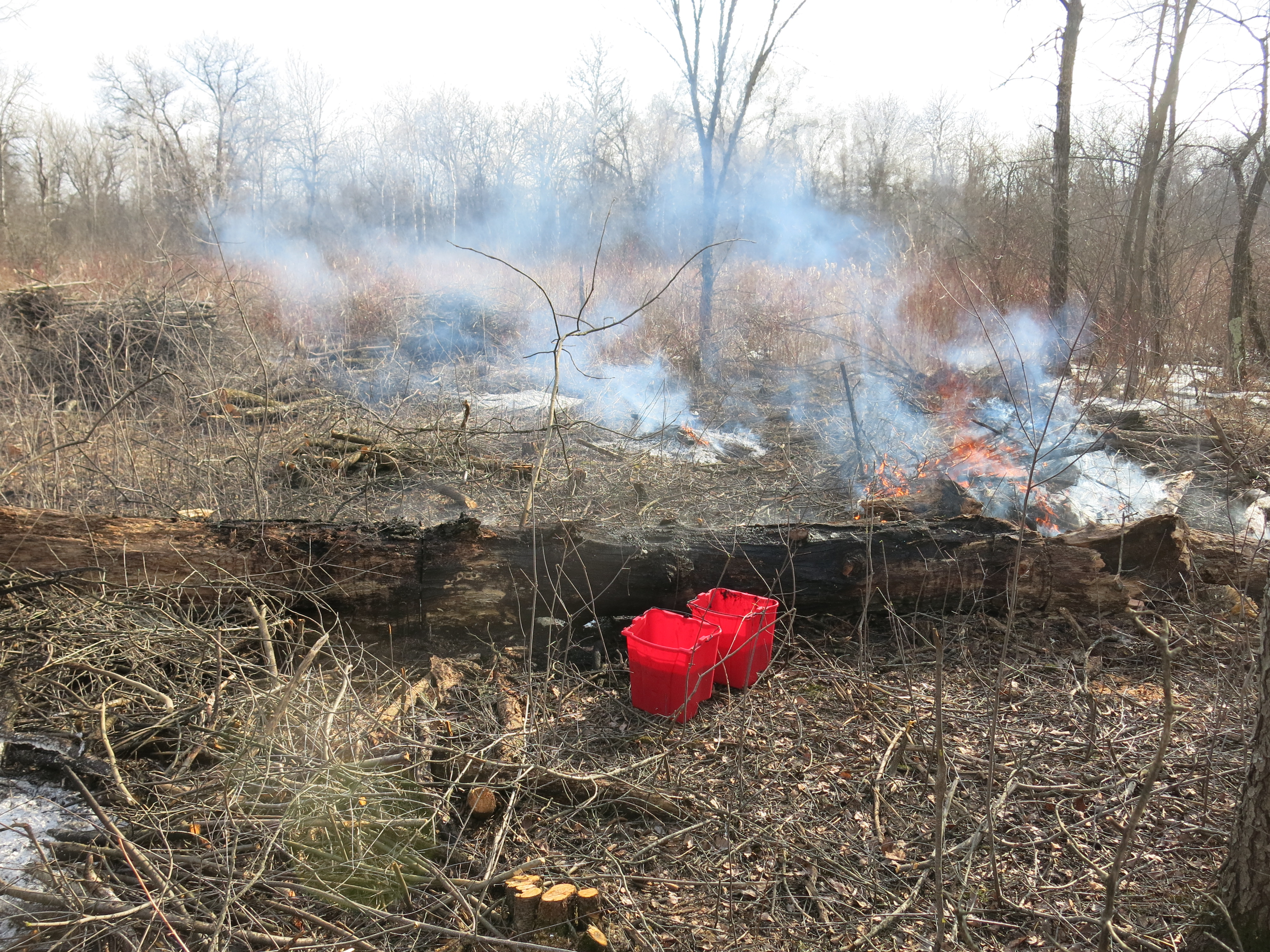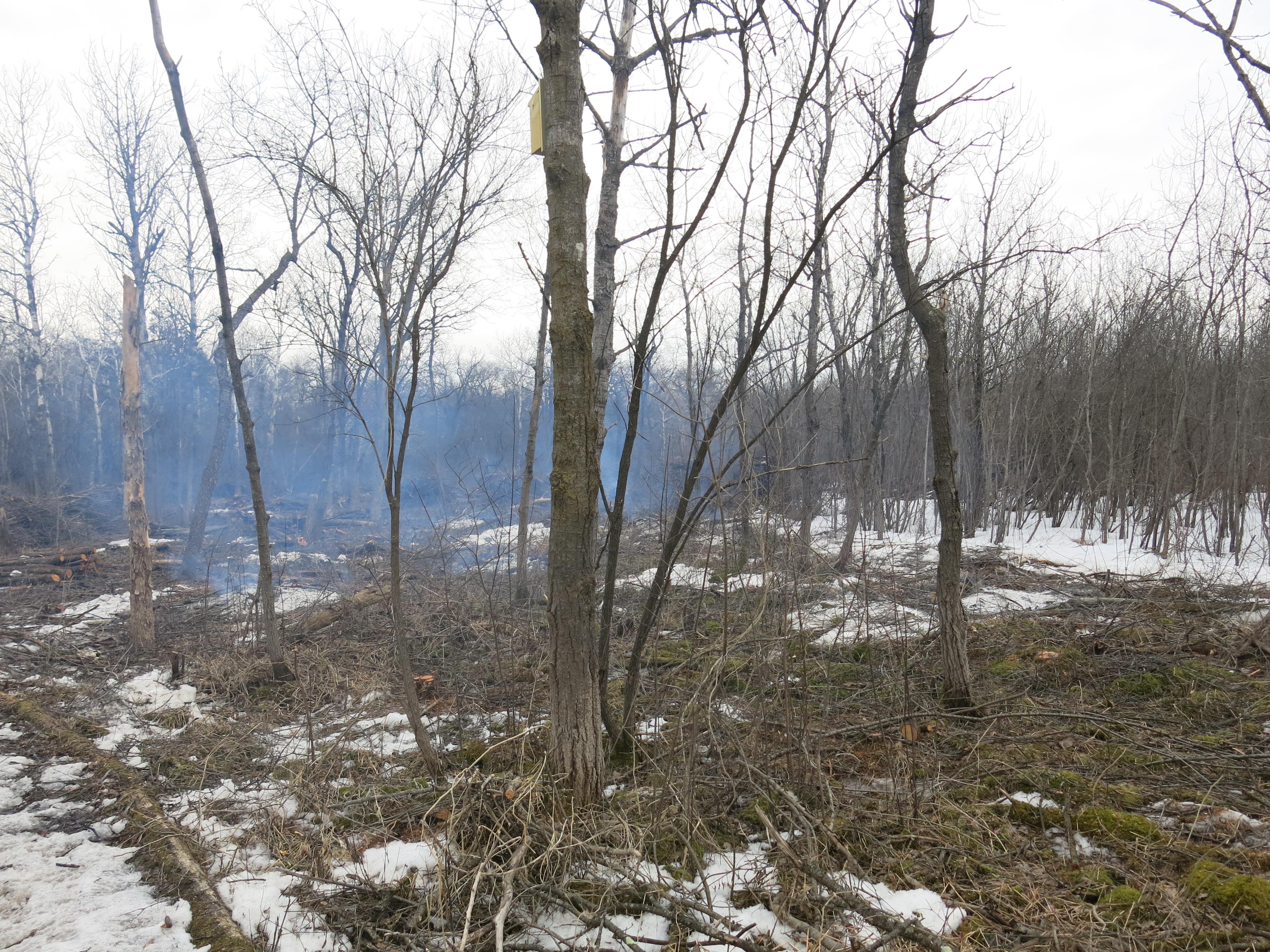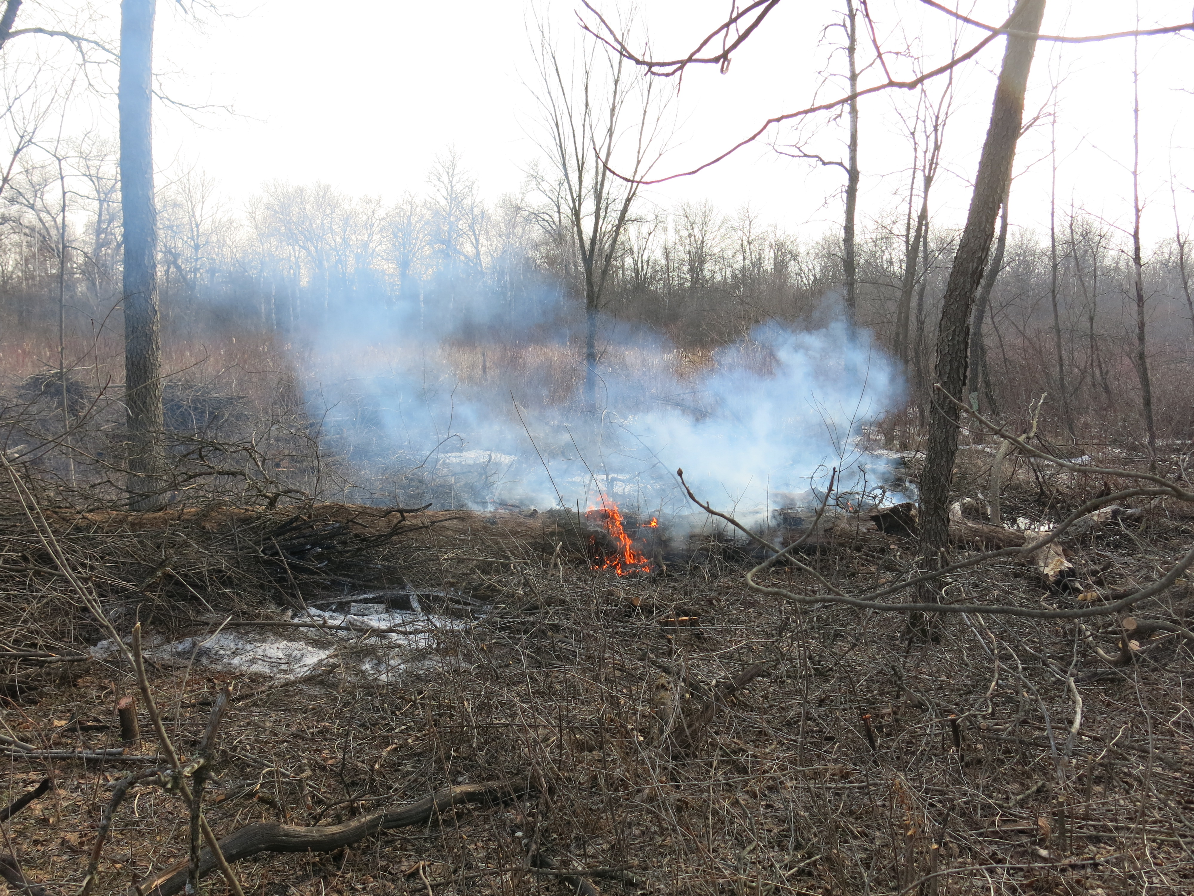As we broke for lunch, I happened to look up and see a line of flames spreading east into the woods from one of the brush piles. We put the creeping fires out quickly and focused on tending the burning piles from that point on.