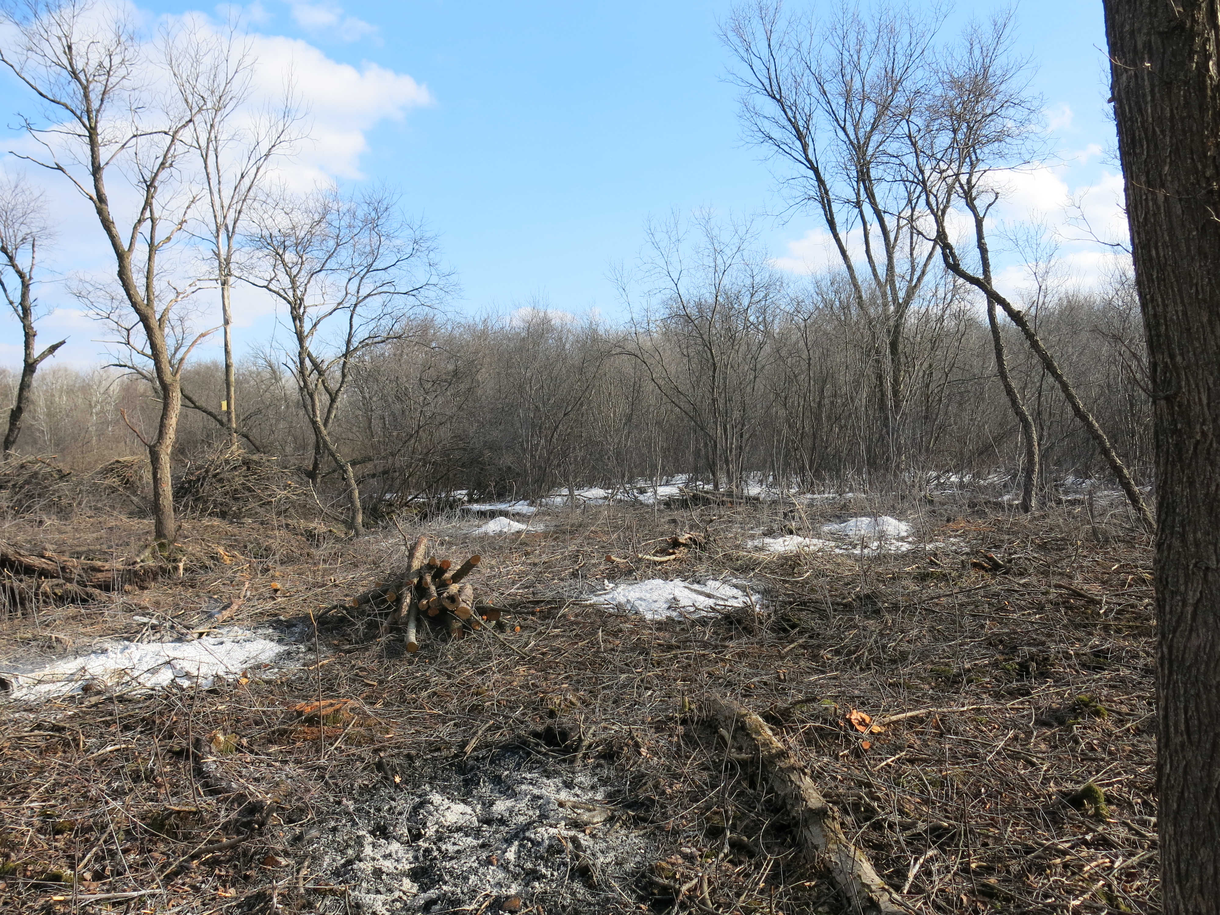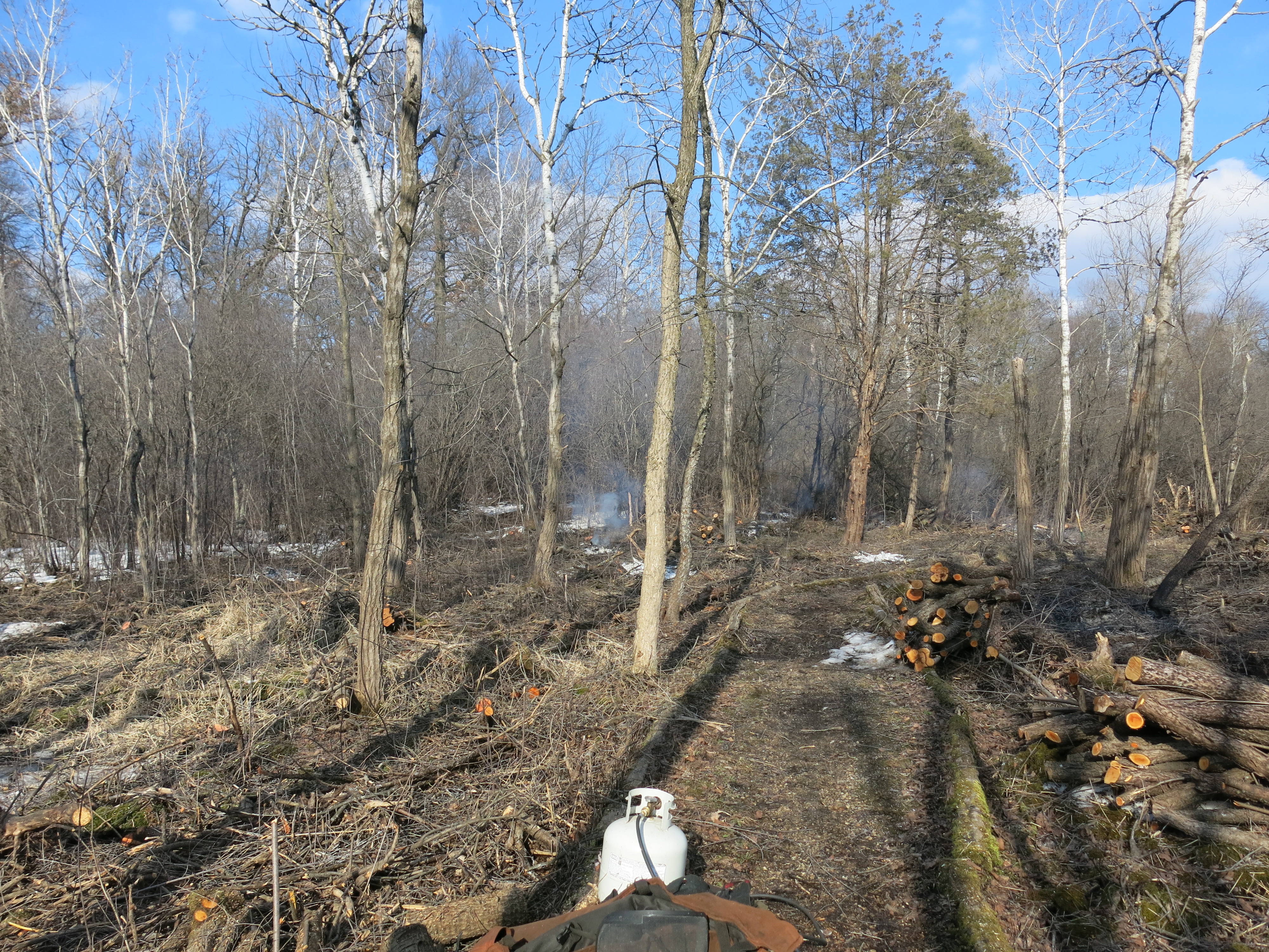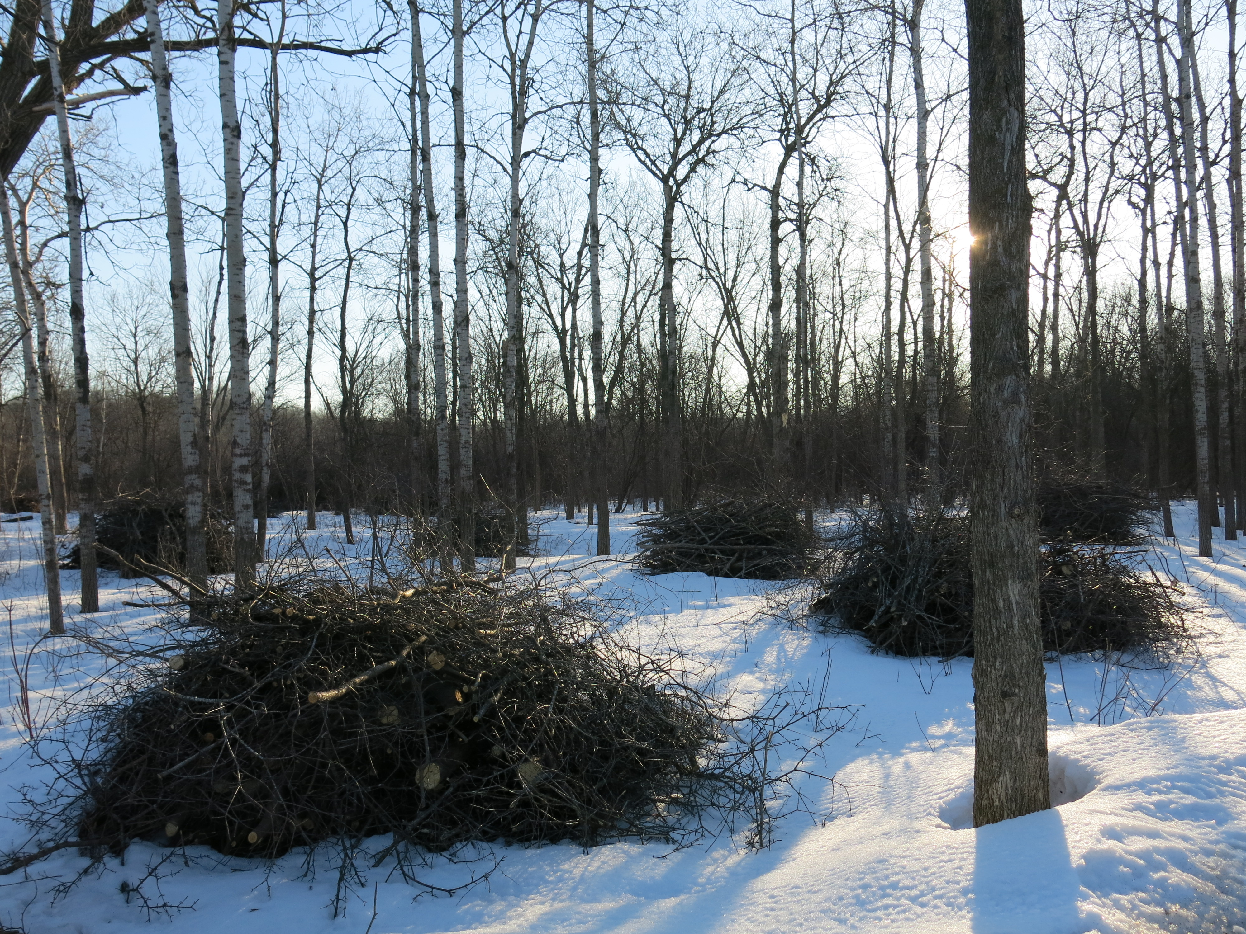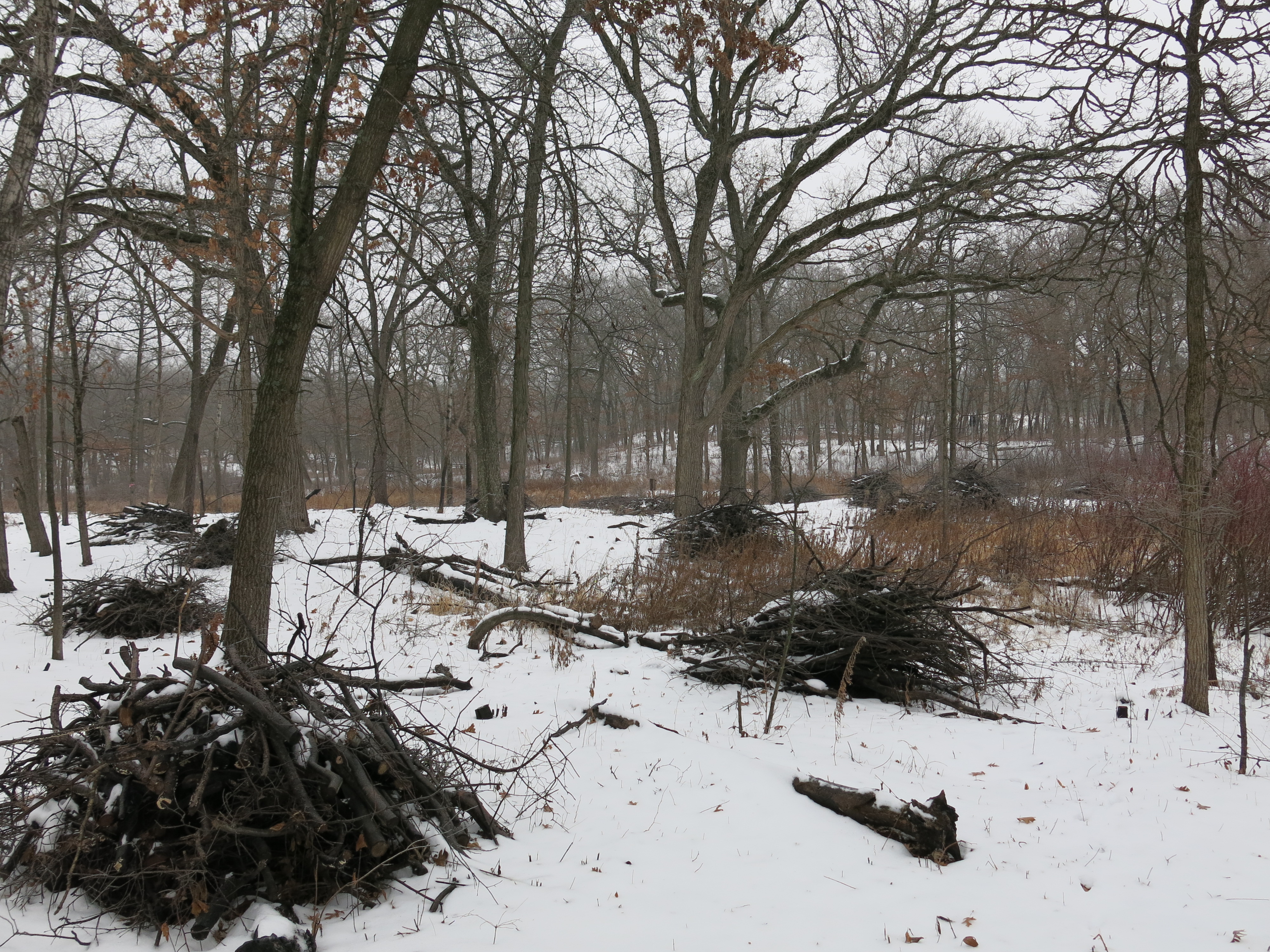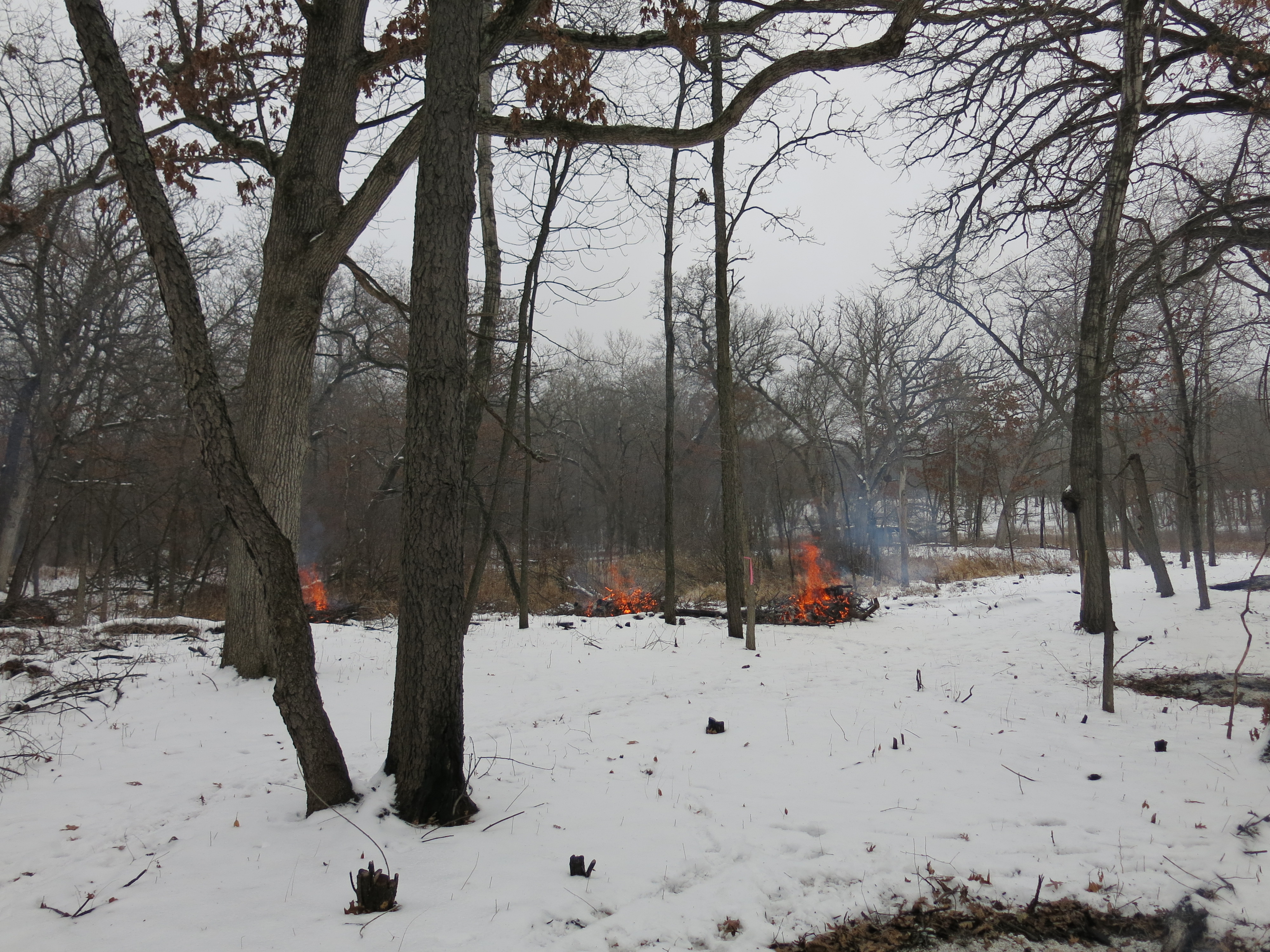 It was a calm night and there was no chance of any of the fires spreading, but the glowing embers from a few of the fires were visible from Hwy 67 and someone called it in. That prompted a call from Paul Sandgren, the Superintendent of the Kettle Moraine State Forest–Southern Unit, and he explained that the DNR was reviewing their prescribed burning procedures and that no more burning should be done until that review is complete. That’s OK with me, the conditions this past Sunday were a little dicey and we stopped lighting piles early because of our safety concerns. Thanks to Matt for completing the mop up!