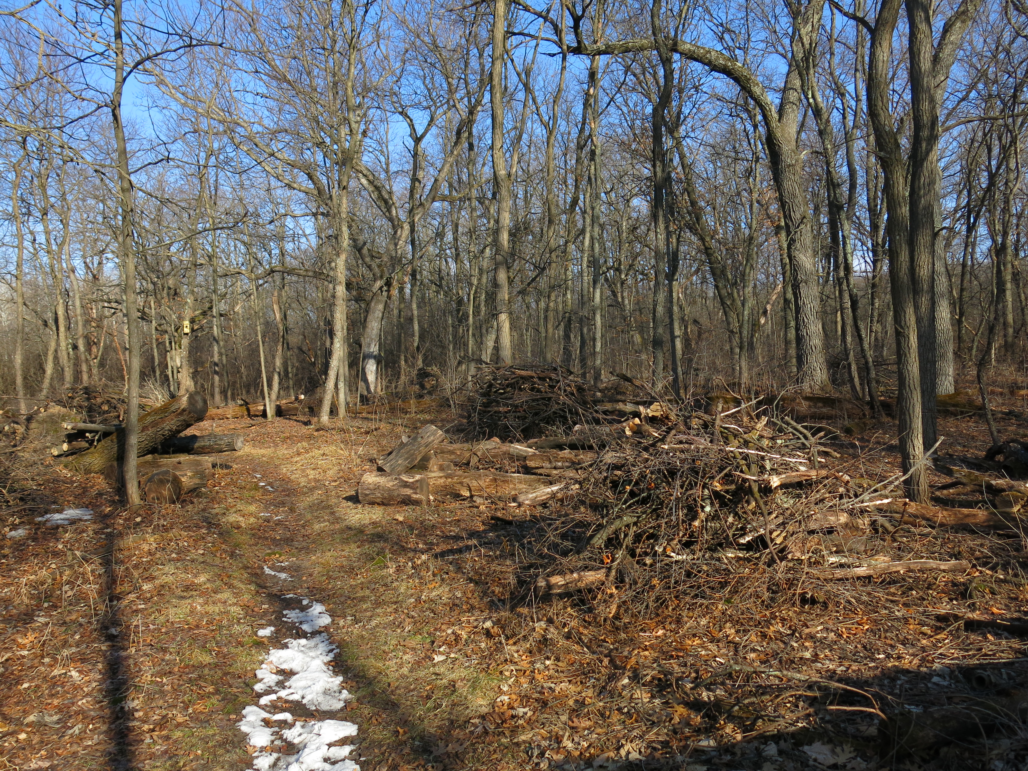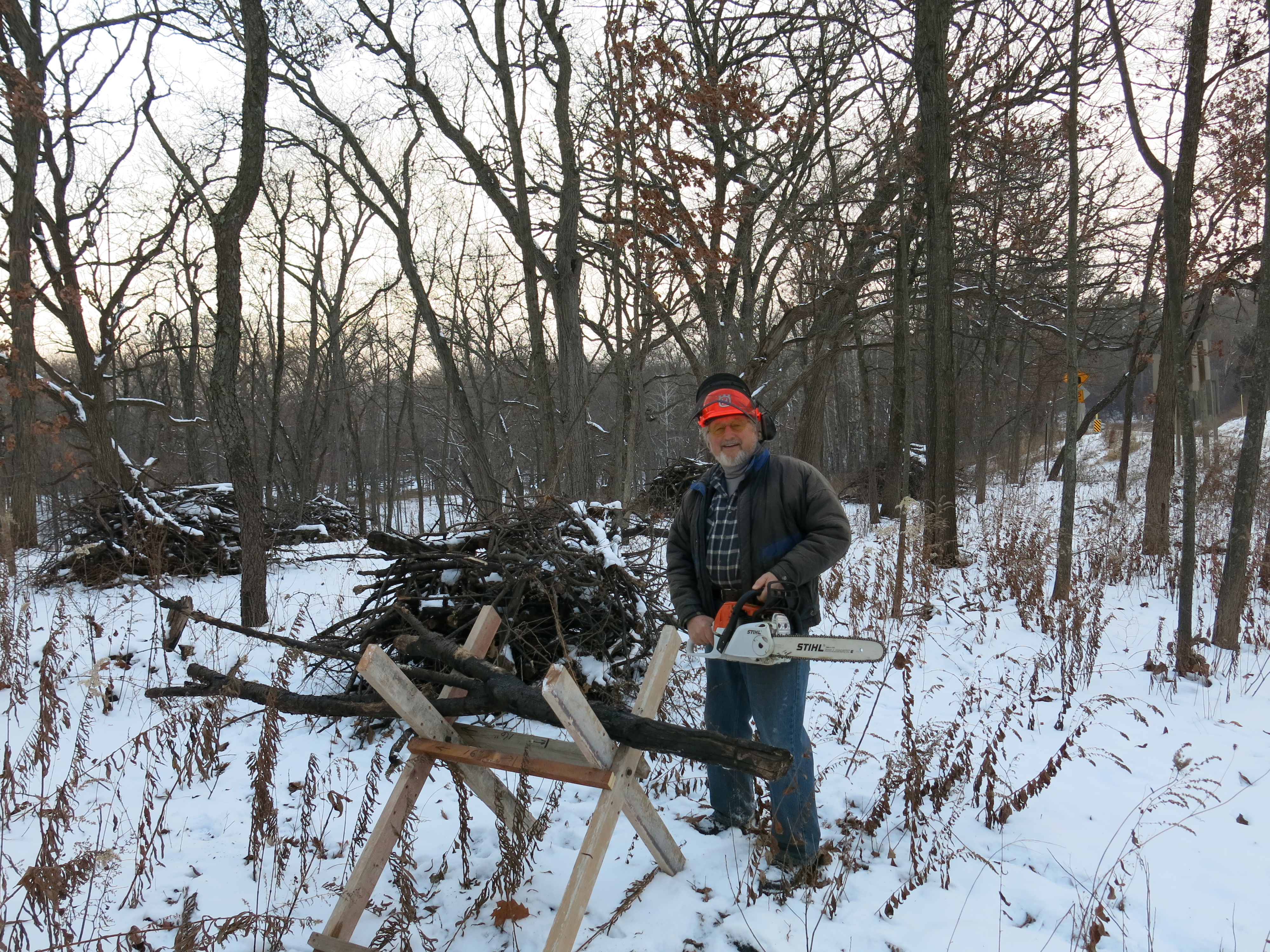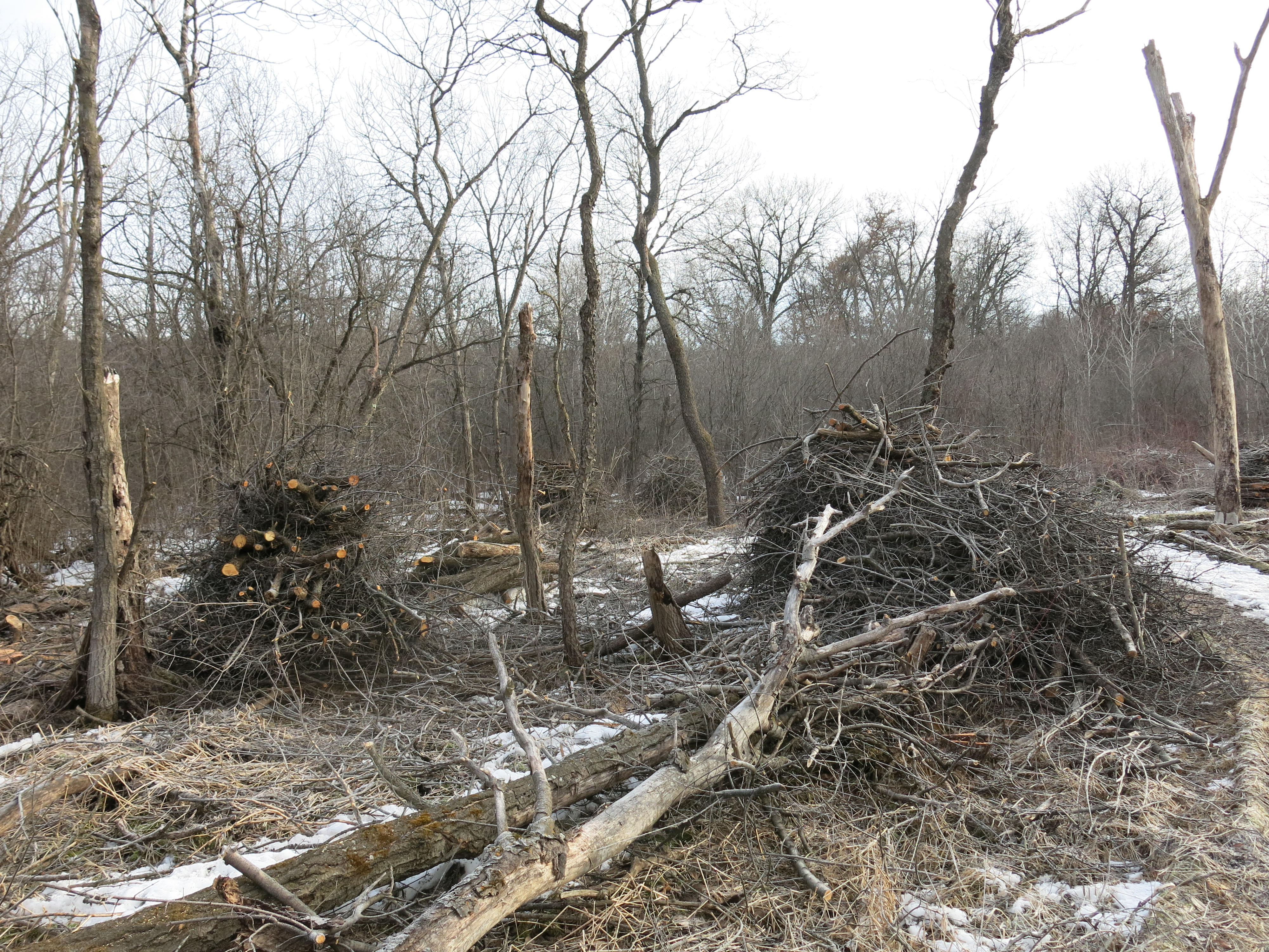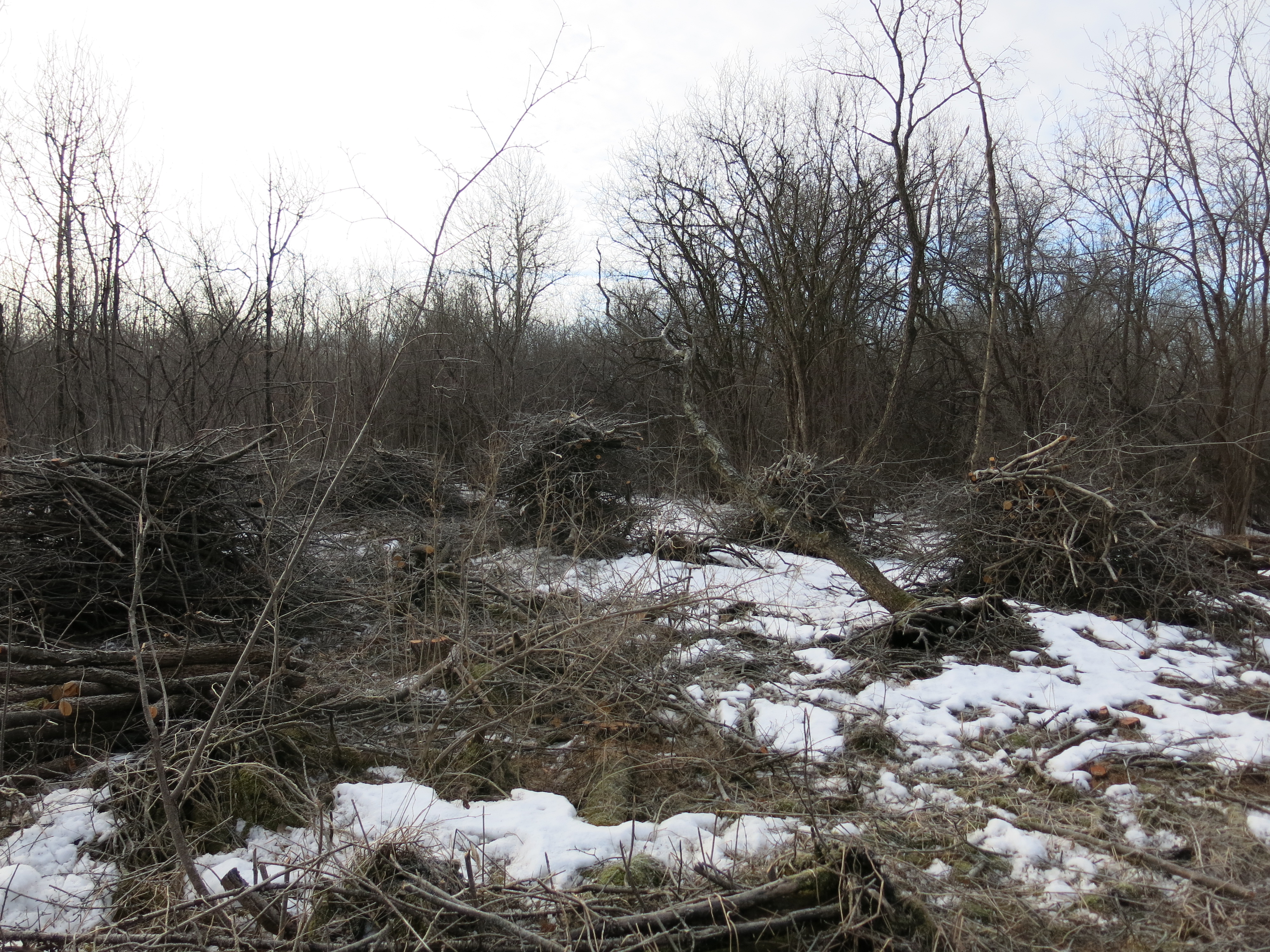 It was a calm night and there was no chance of any of the fires spreading, but the glowing embers from a few of the fires were visible from Hwy 67 and someone called it in. That prompted a call from Paul Sandgren, the Superintendent of the Kettle Moraine State Forest–Southern Unit, and he explained that the DNR was reviewing their prescribed burning procedures and that no more burning should be done until that review is complete. That’s OK with me, the conditions this past Sunday were a little dicey and we stopped lighting piles early because of our safety concerns. Thanks to Matt for completing the mop up!