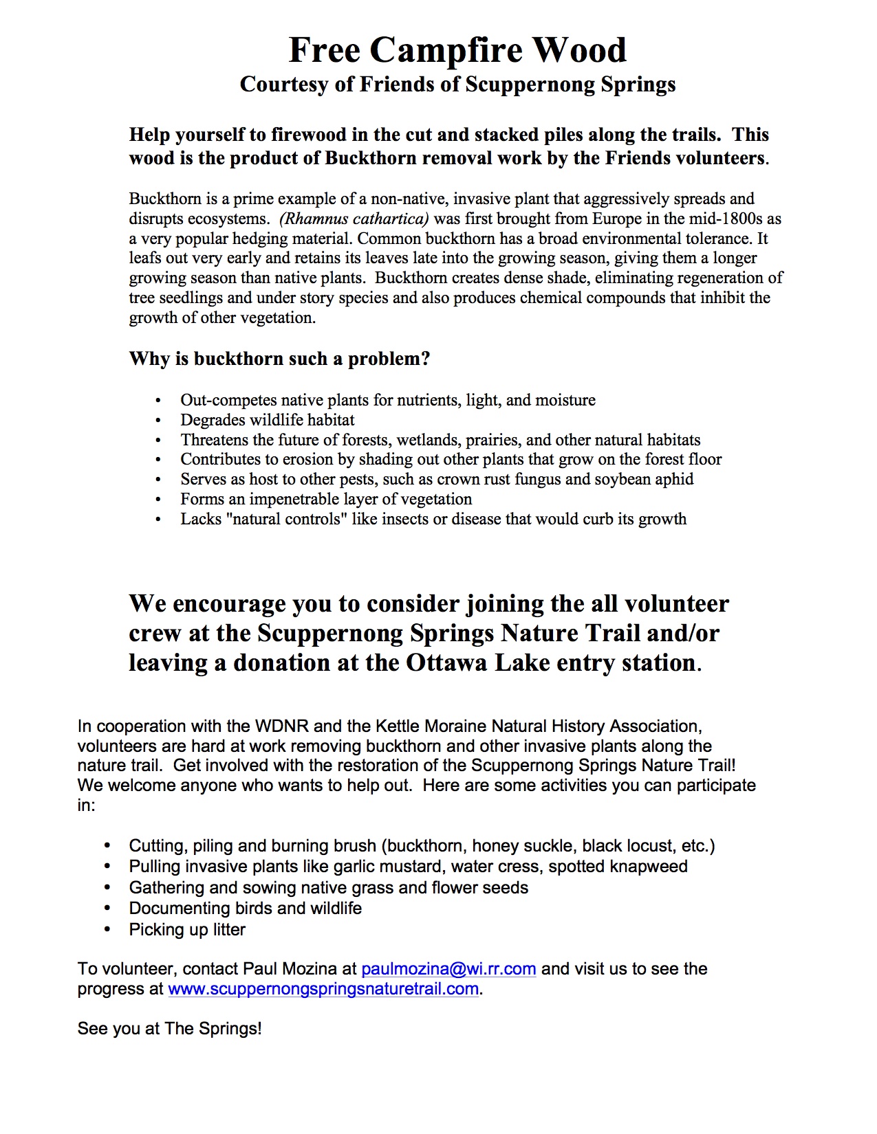 We are looking for a wheelbarrow donation! If you have one, new or used, we’d like to leave it at The Springs near the buckthorn firewood piles that Dick Jenks is preparing.