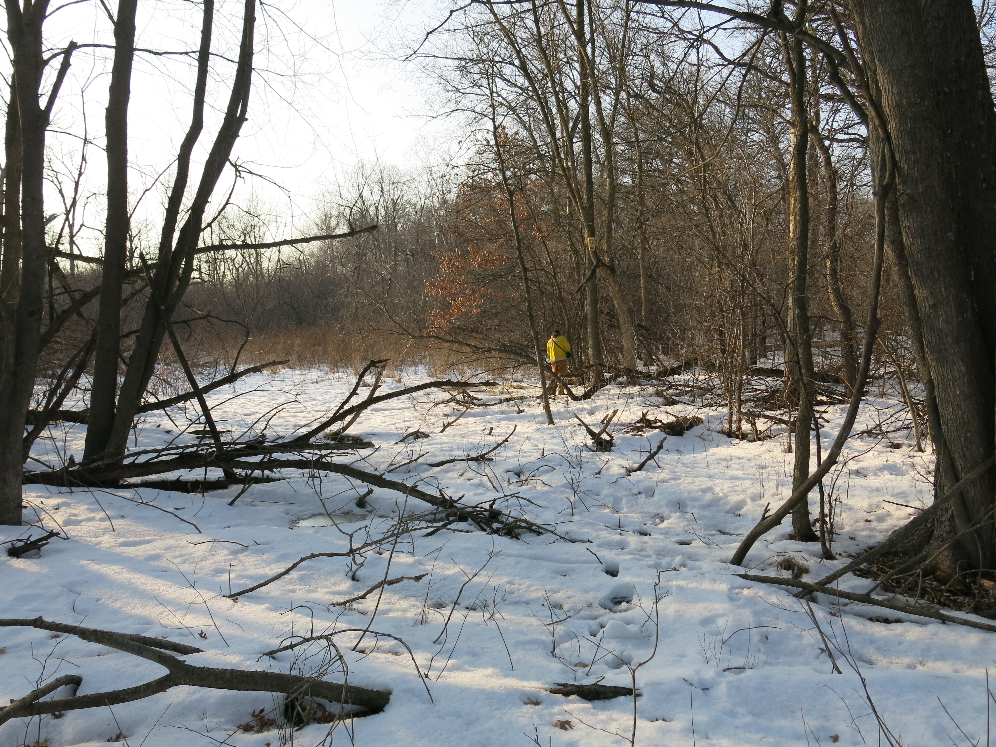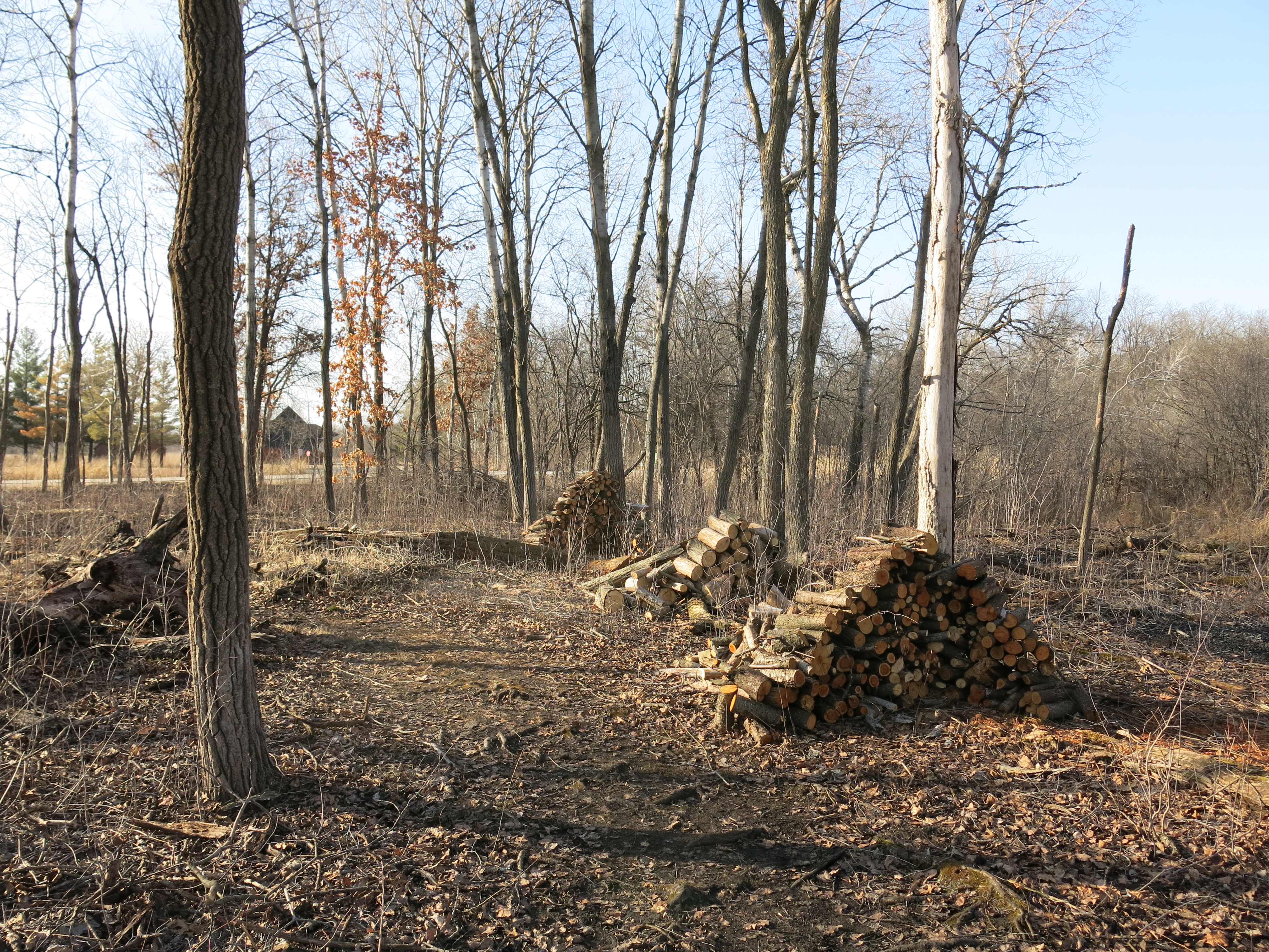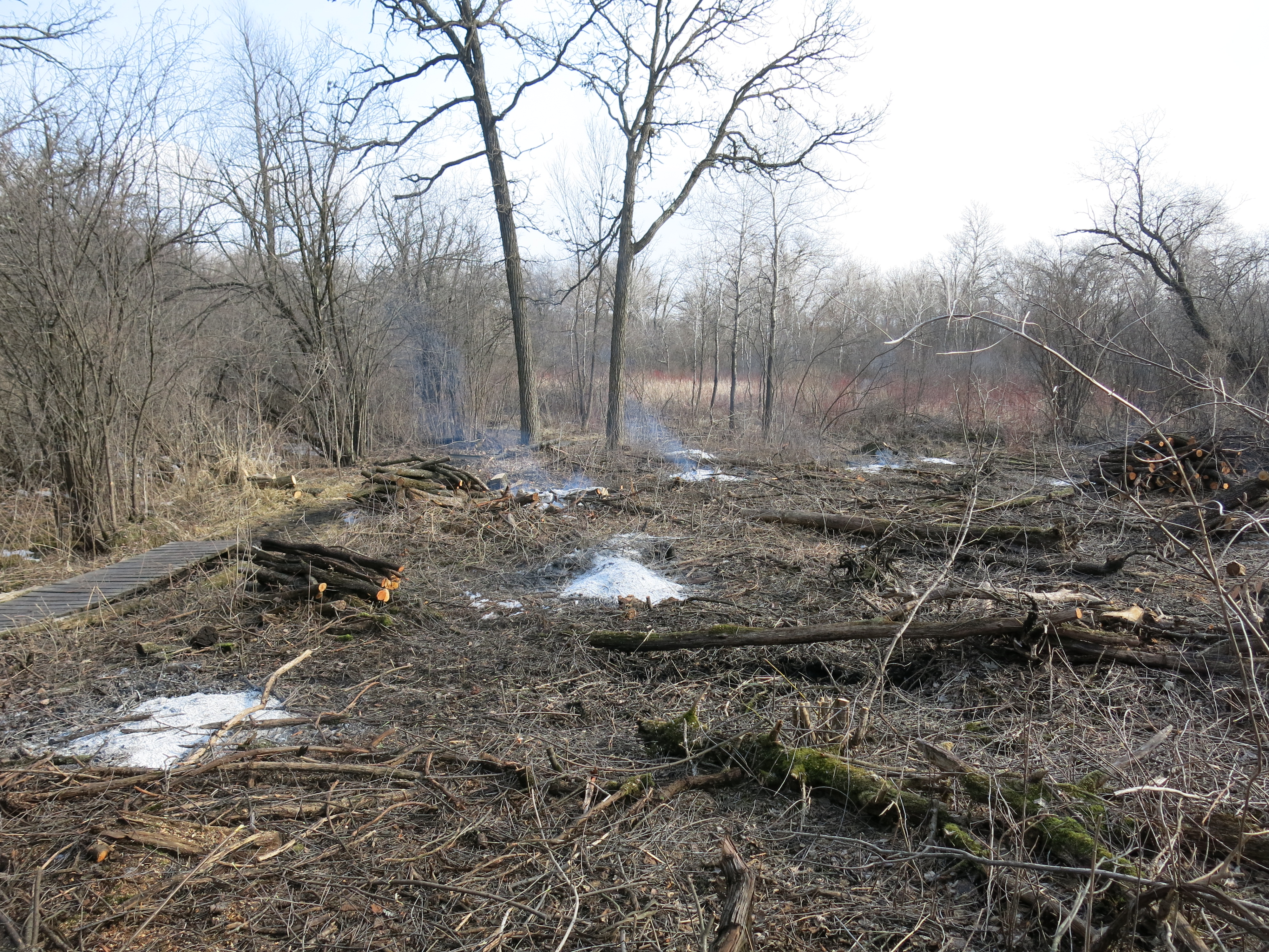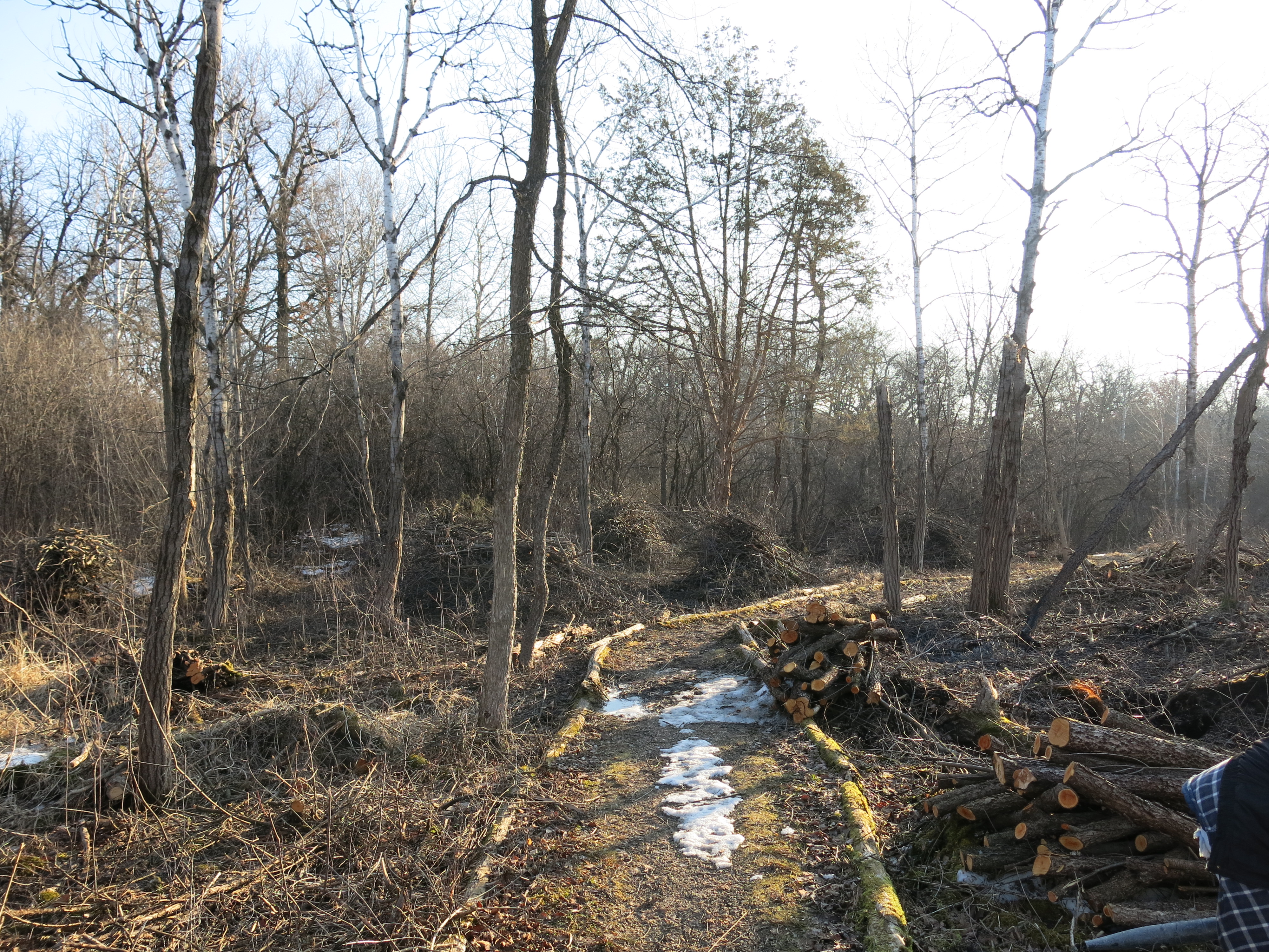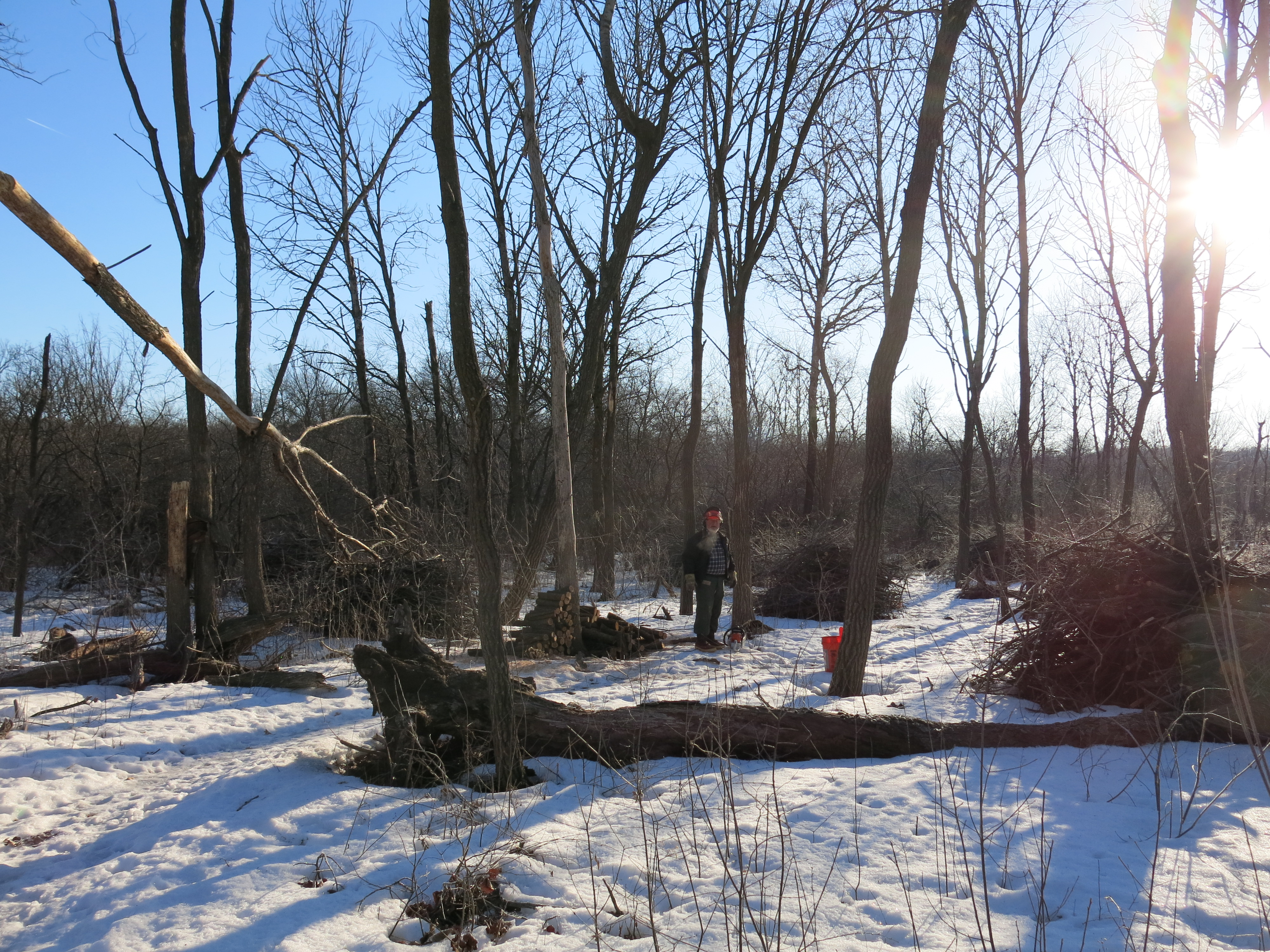 When I got into the the upper river valley, I could hear the sound of Marty’s skid steer loader and I hastened to the south end of the trail hoping to talk with him about his plans to repair the damage done by his heavy machine. Marty, with lots of help from Carl Baumann, has been harvesting dead black locust trees for firewood.