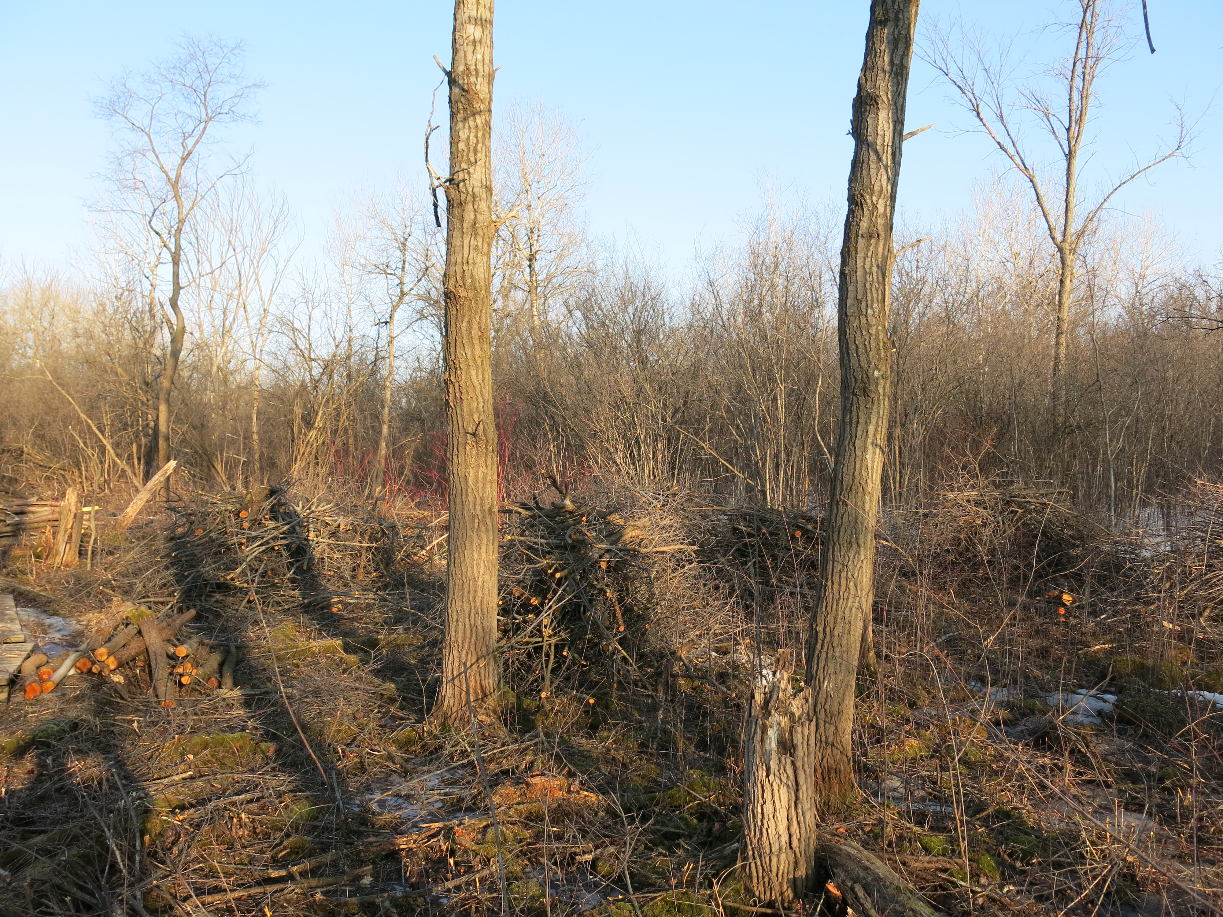 I missed him and was surprised to see him from the sand prairie driving his machine slowly north on Hwy 67 to his home some 3 miles away. Marty called me last night and assured me that as soon as the frost is out of the ground and things dry up a bit, he will return to clean up the slash and repair the skid steer scars.