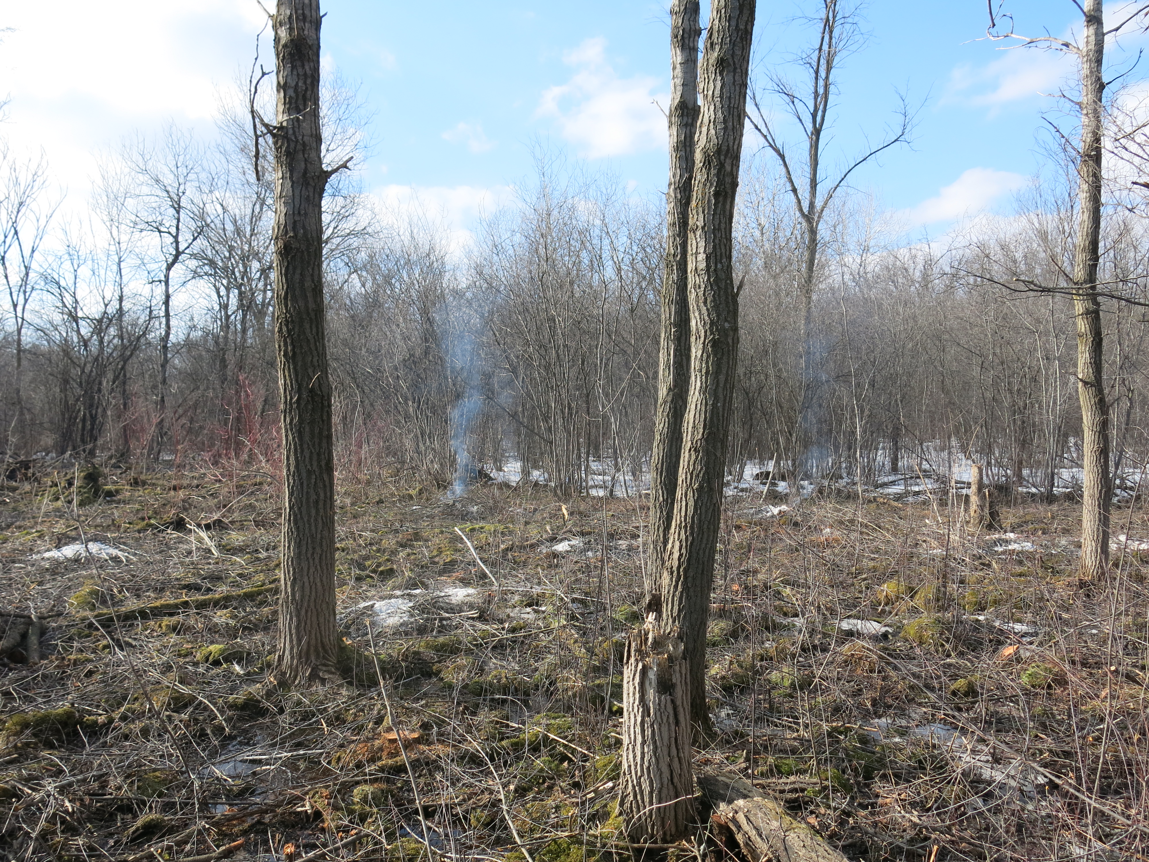 I was soon joined by Dick and Rich and we commenced to prepping, lighting and tending brush piles along the north east rim of the loop trail between the old barn site and signpost #13.