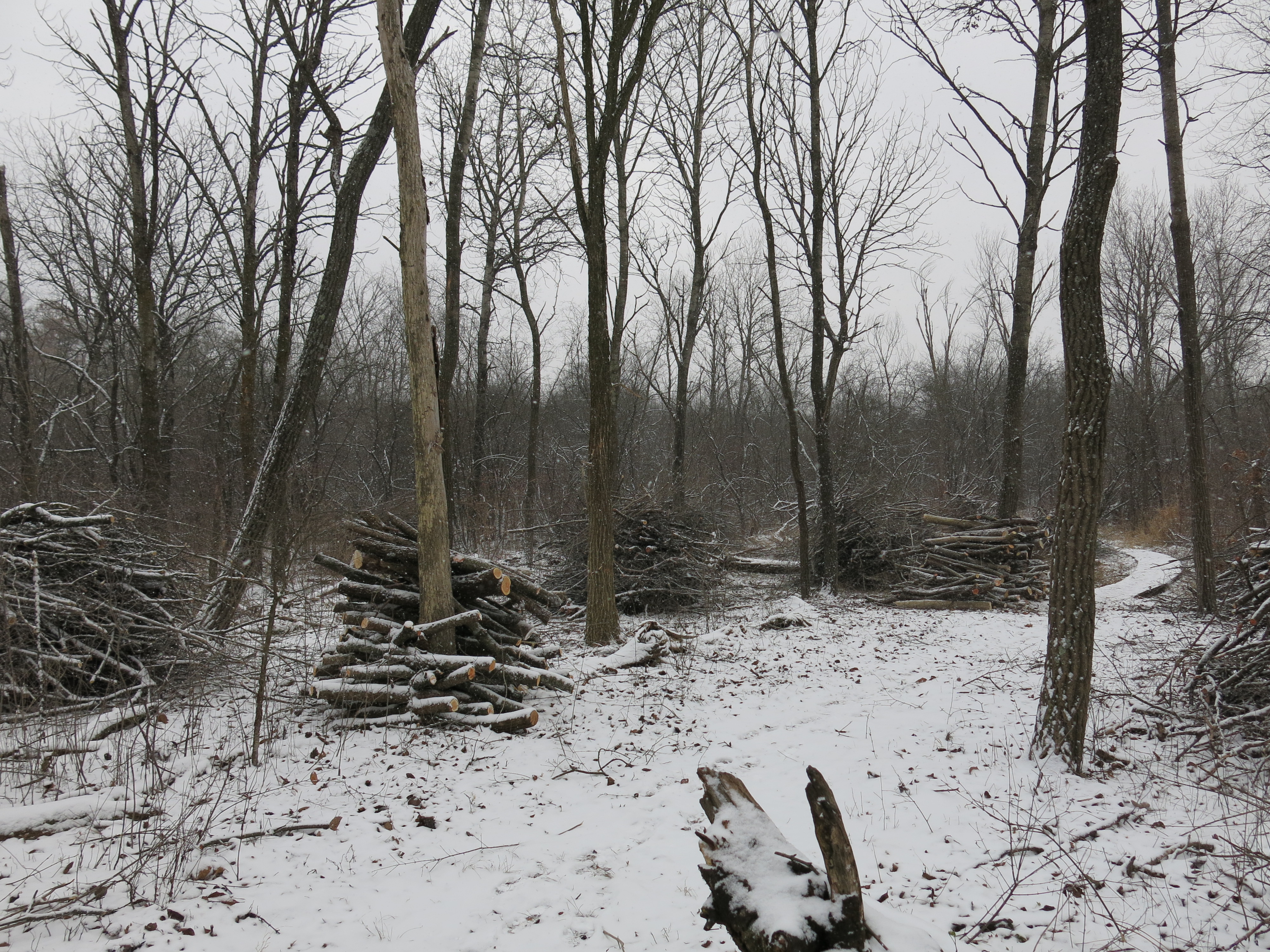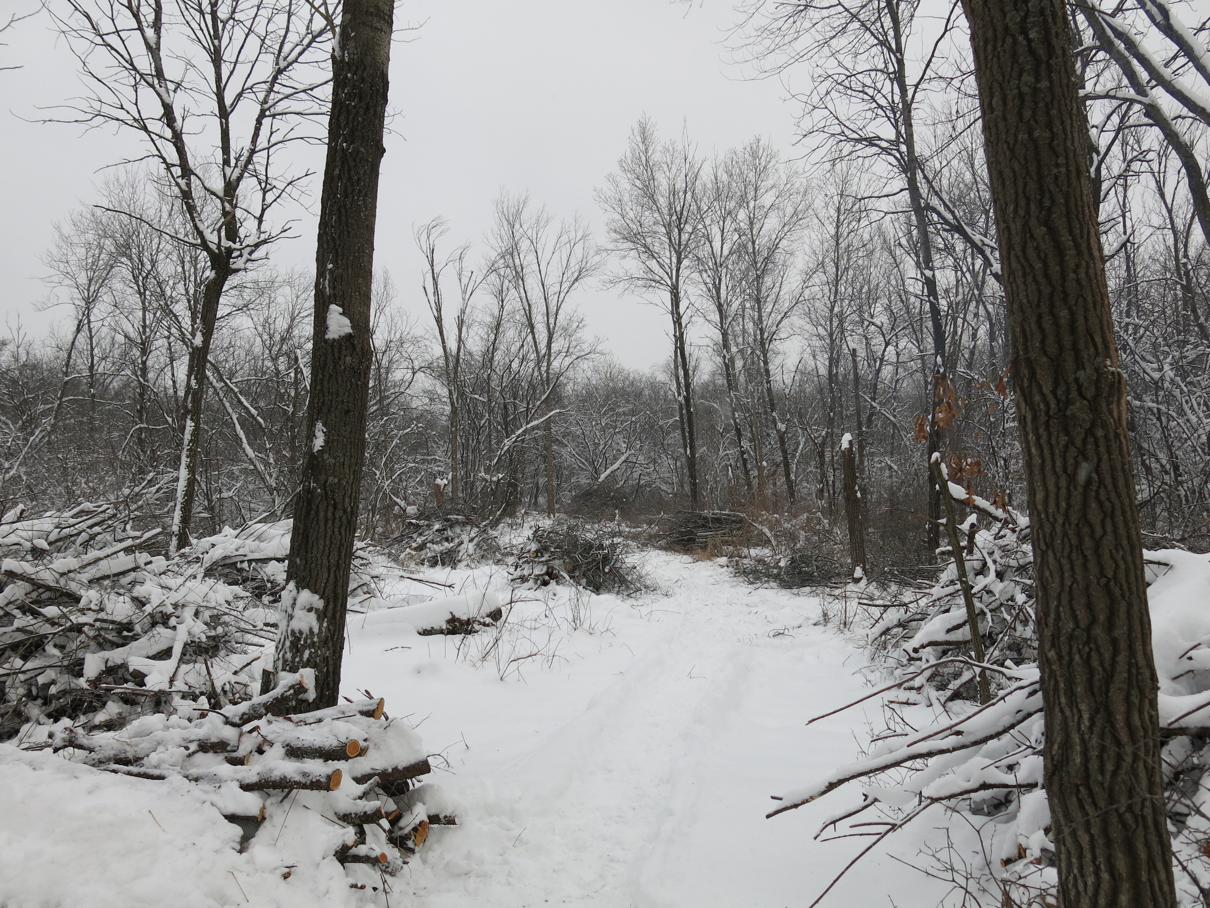 With all the rain we had this past Thursday, I was glad to have on my new pair of muck boots yesterday; the slush was just an inch or two below the surface of the snow. I’ll try to contain my excitement as I describe the work on the last stretch of the Buckthorn Alley (well, the last stretch of the south side of the trail that is.) The first thing I noticed was that Andy Buchta had piled all of the brush that Ben, Zach and I cut last tuesday.
