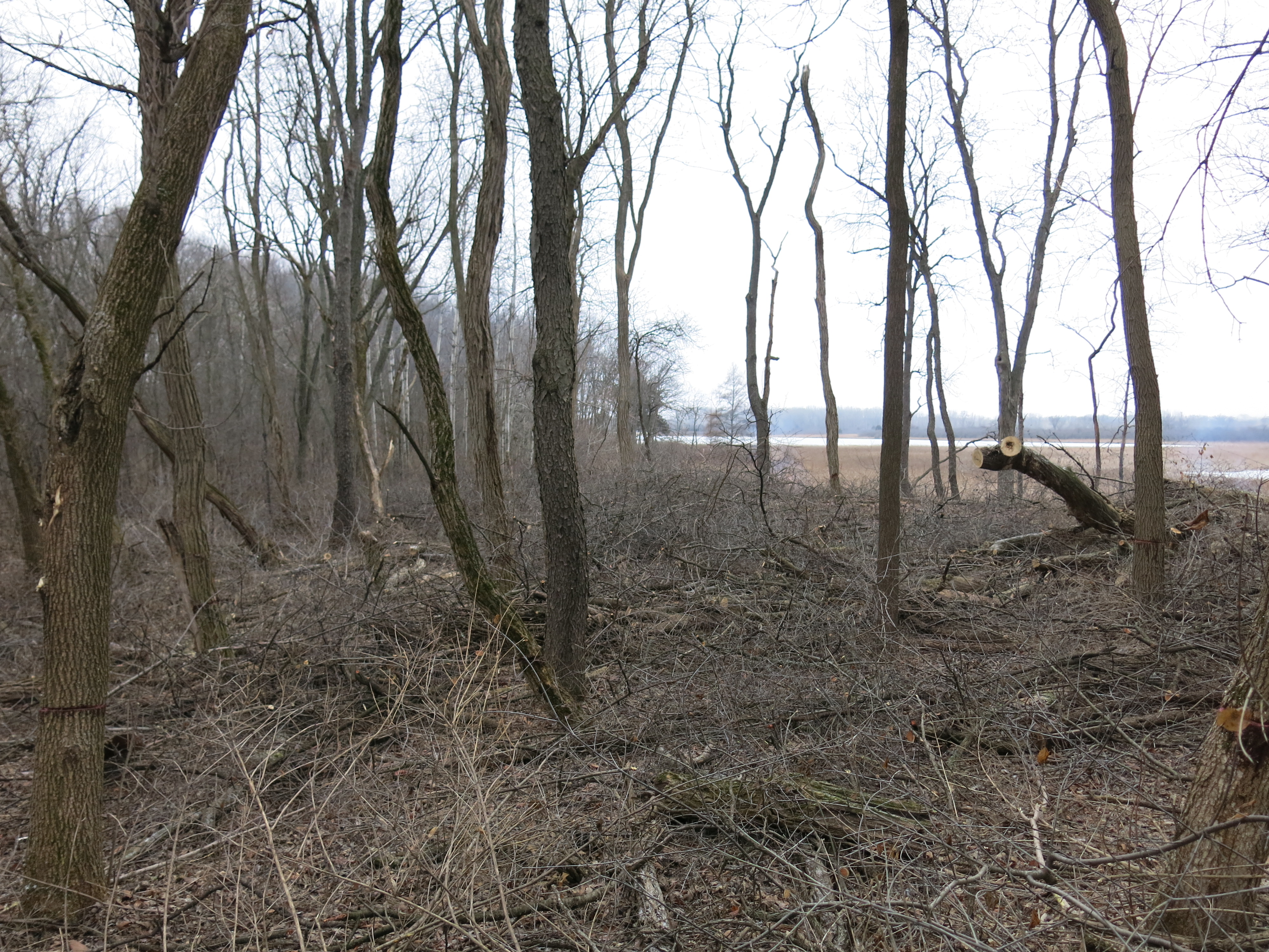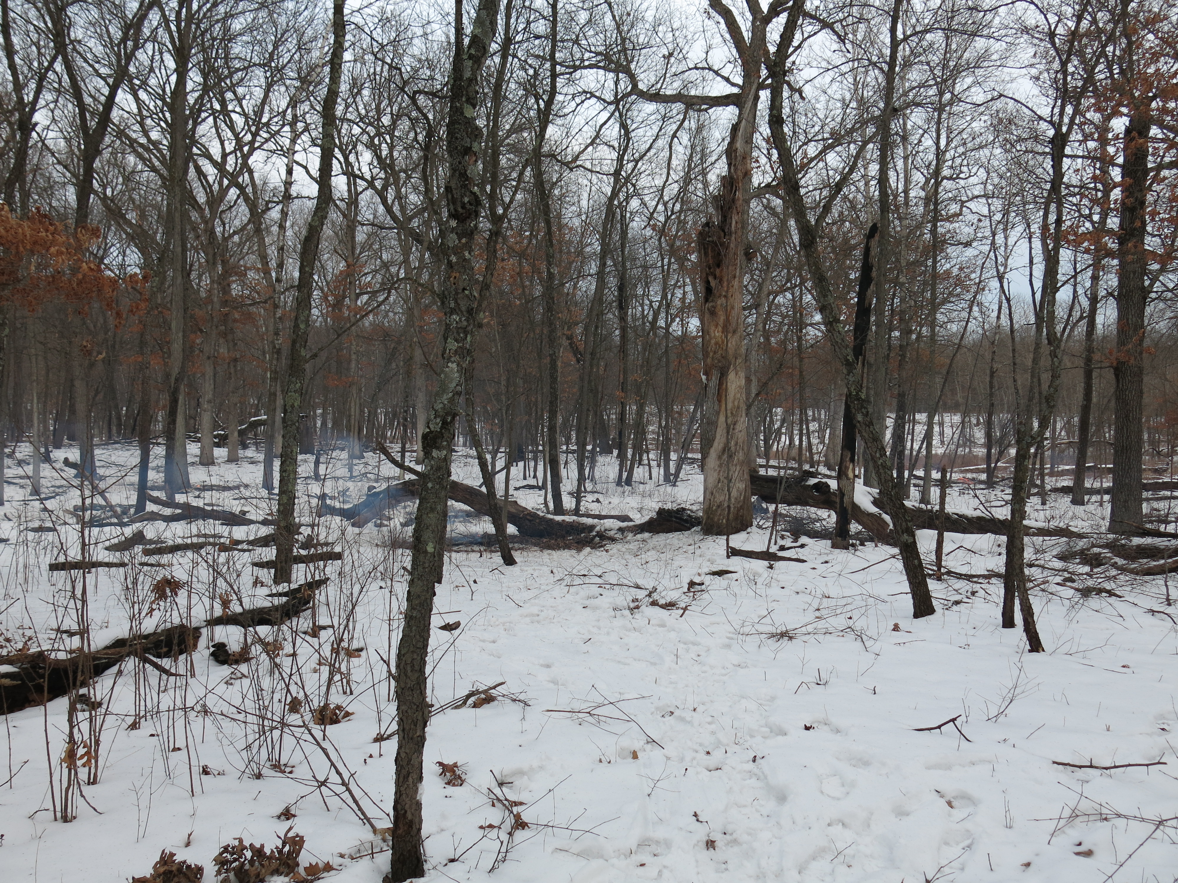 On Wednesday, Chris Mann volunteered to help me burn the brush piles Andy Buchta made on the south side of the trail last Fall, near the location shown above. Again, here is how it looked north, east and south, before we got started: