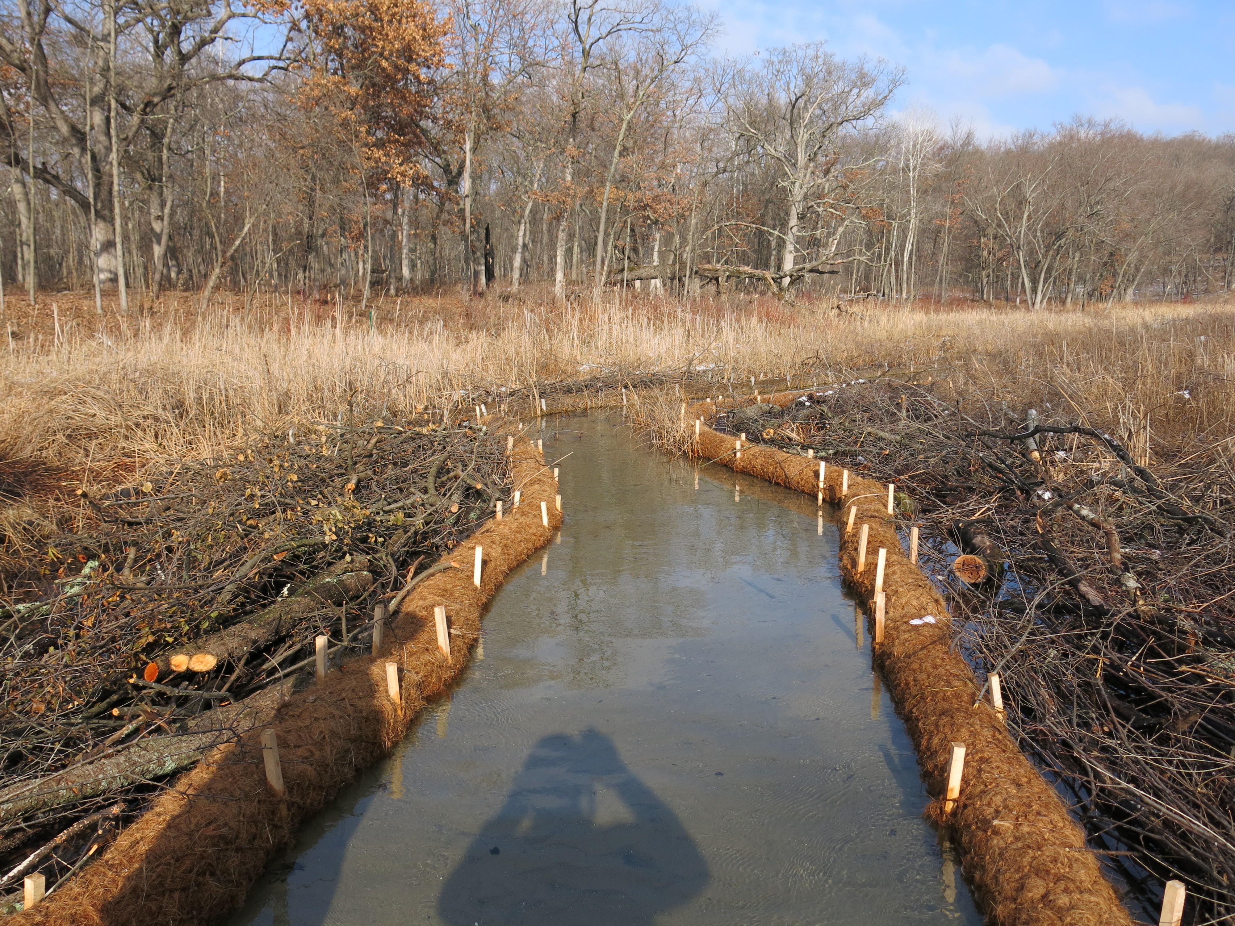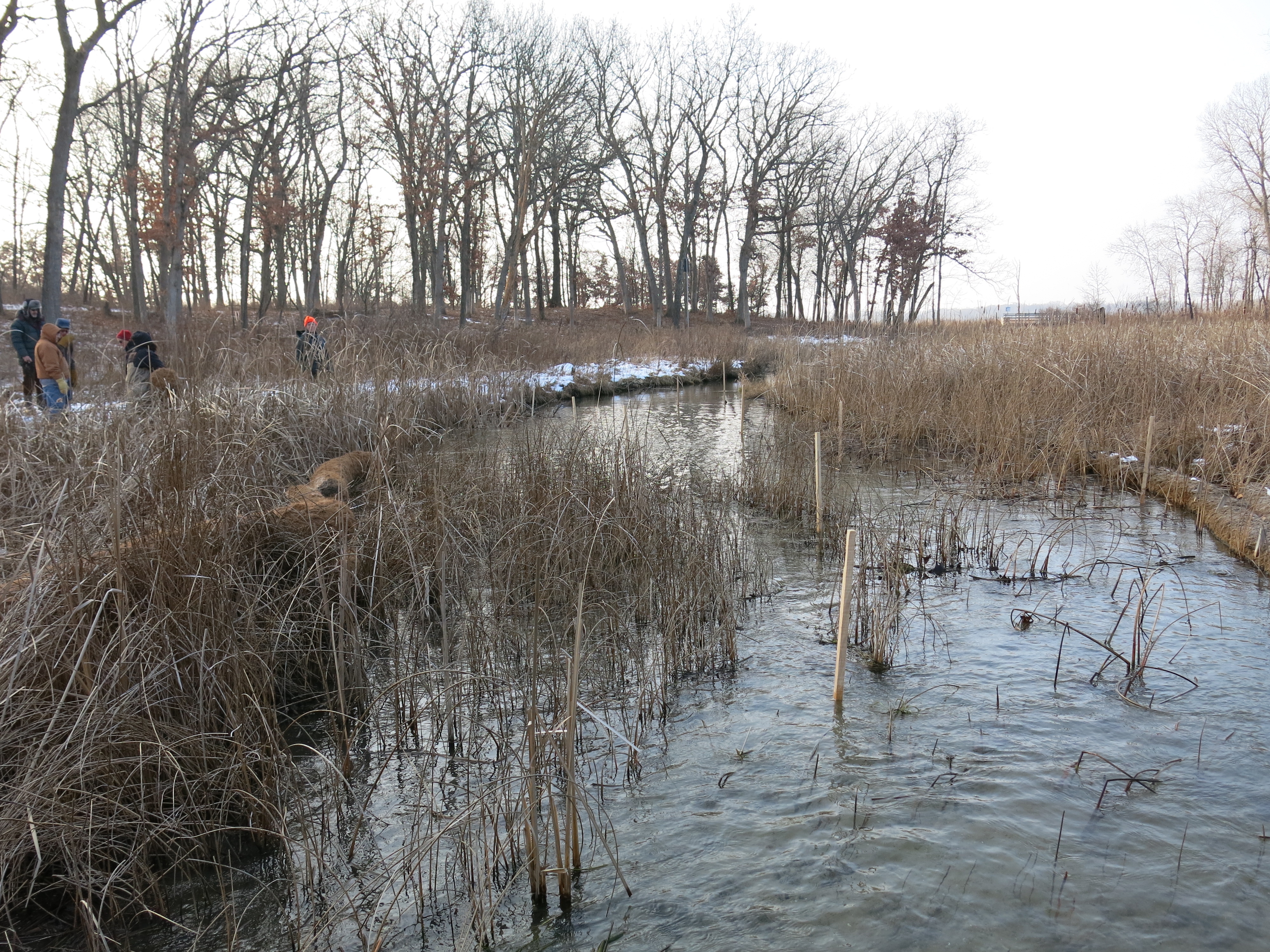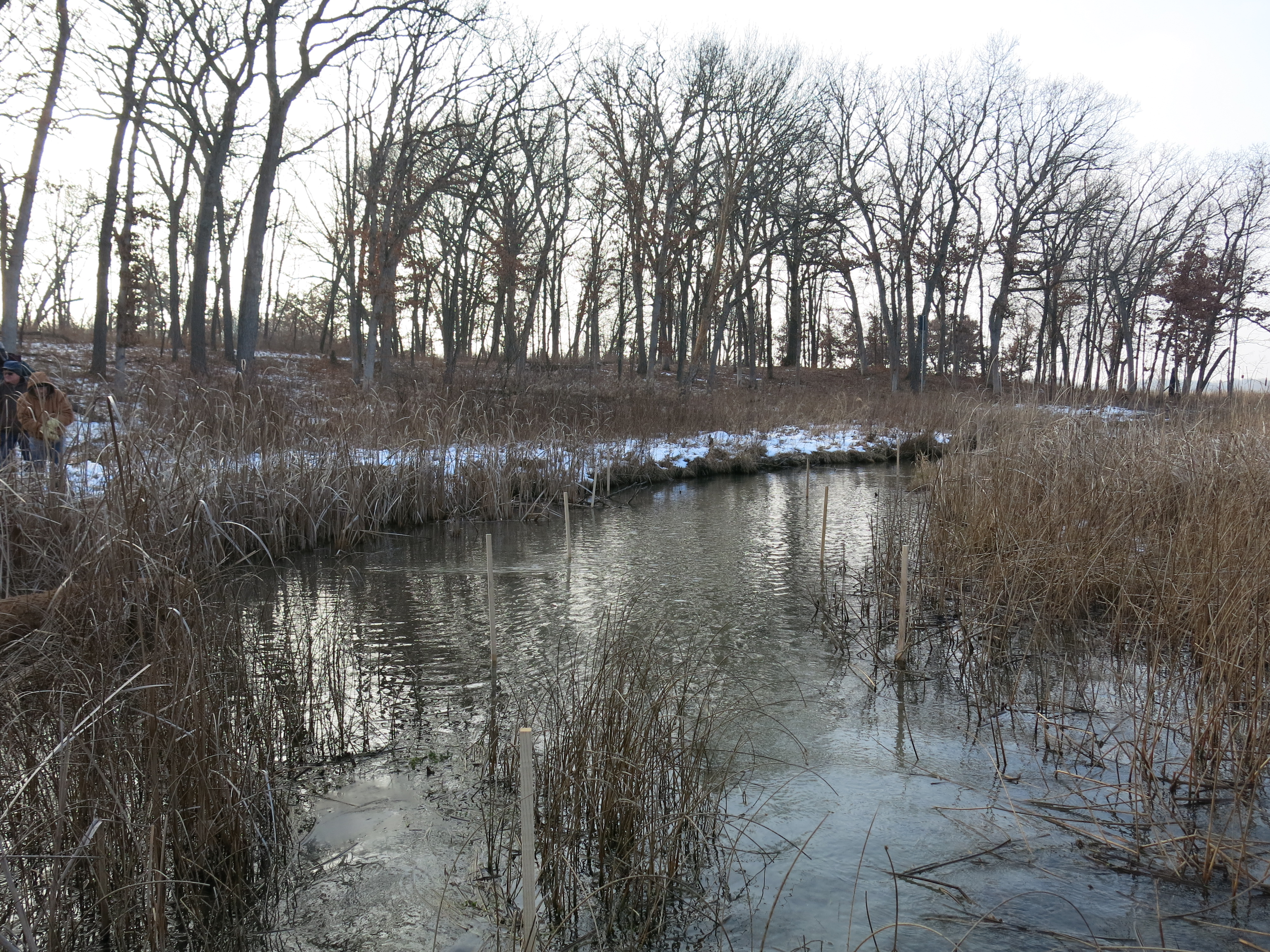 Abe Wittenwyler, heavy equipment operator with the DNR, wasn’t looking for a pot of gold under the Hotel Spring bridge; he had come to excavate the riverbed to address the hydrology issues that Ben Heussner identified as a result of the elevation survey the DNR conducted last year. I called Ben for an update, left a message, and got to work cutting buckthorn in the wetlands just down the trail — to the left — from the main parking lot on Hwy ZZ. Here is how it looked before I got started.