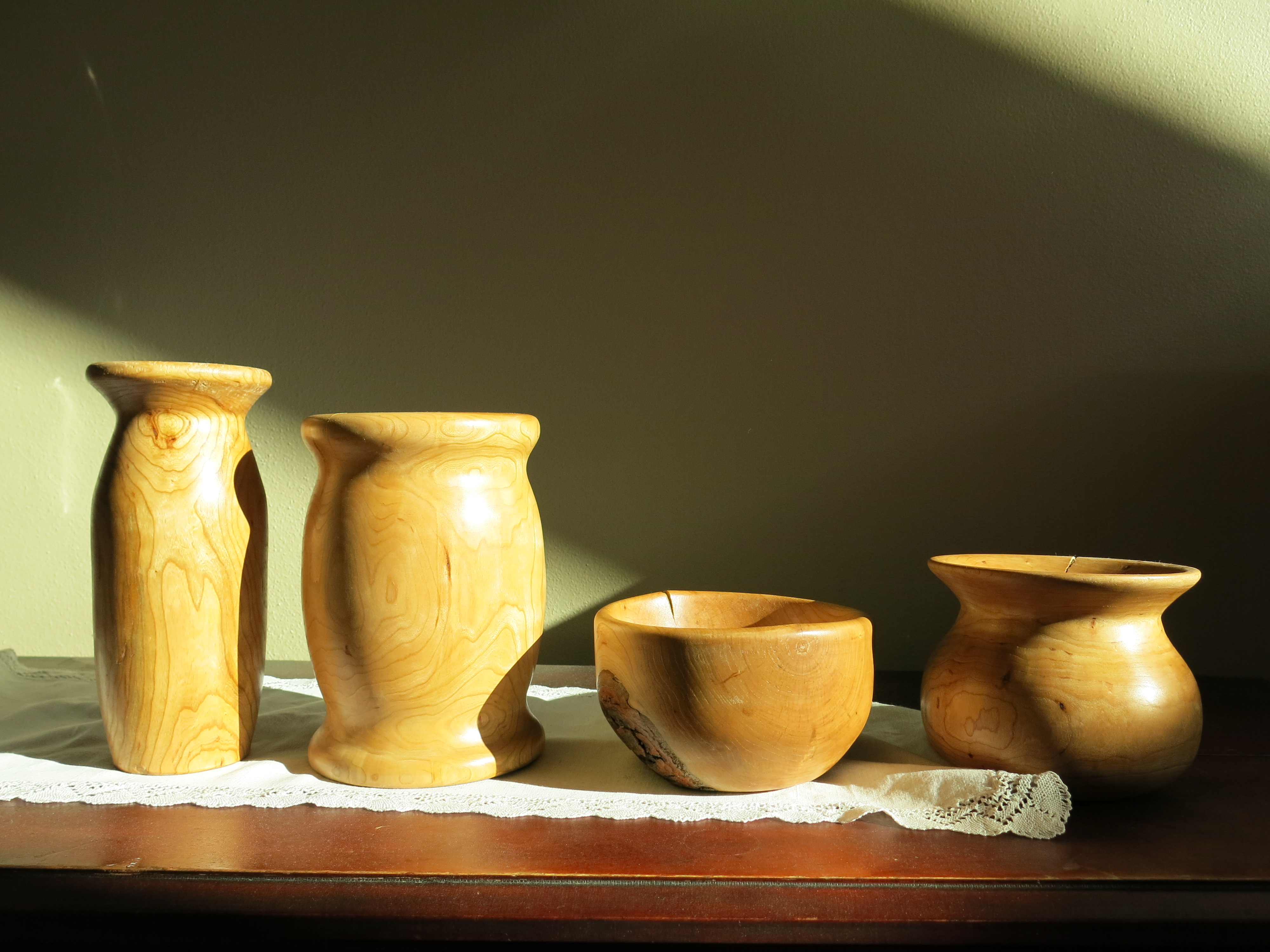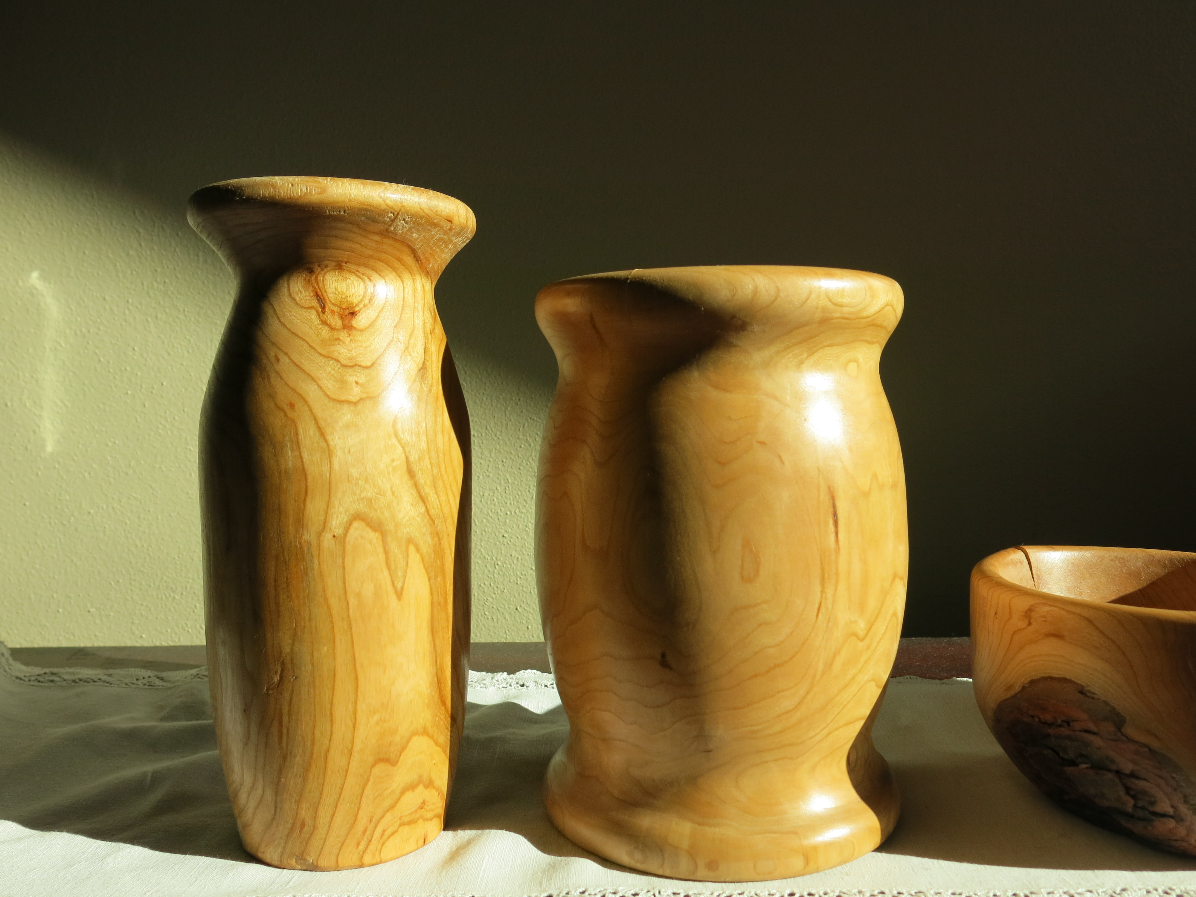 While on my evening stroll, I got a call from my old friend, Randy Schilling, who came out to The Springs 2 years ago to harvest some oak, hickory and cherry logs.  He had some presents for me: vases and bowls turned with care into art on his wood lathe.