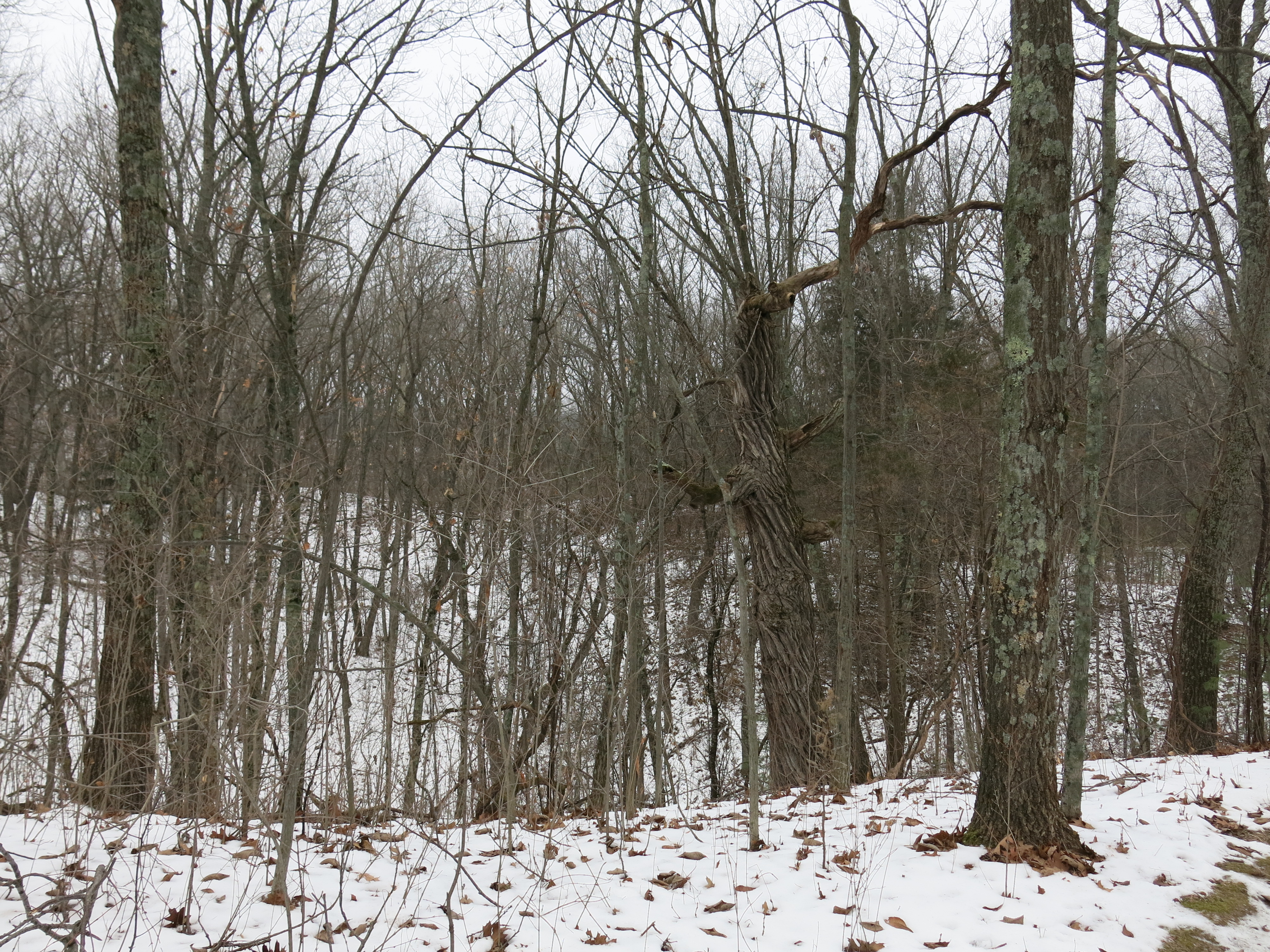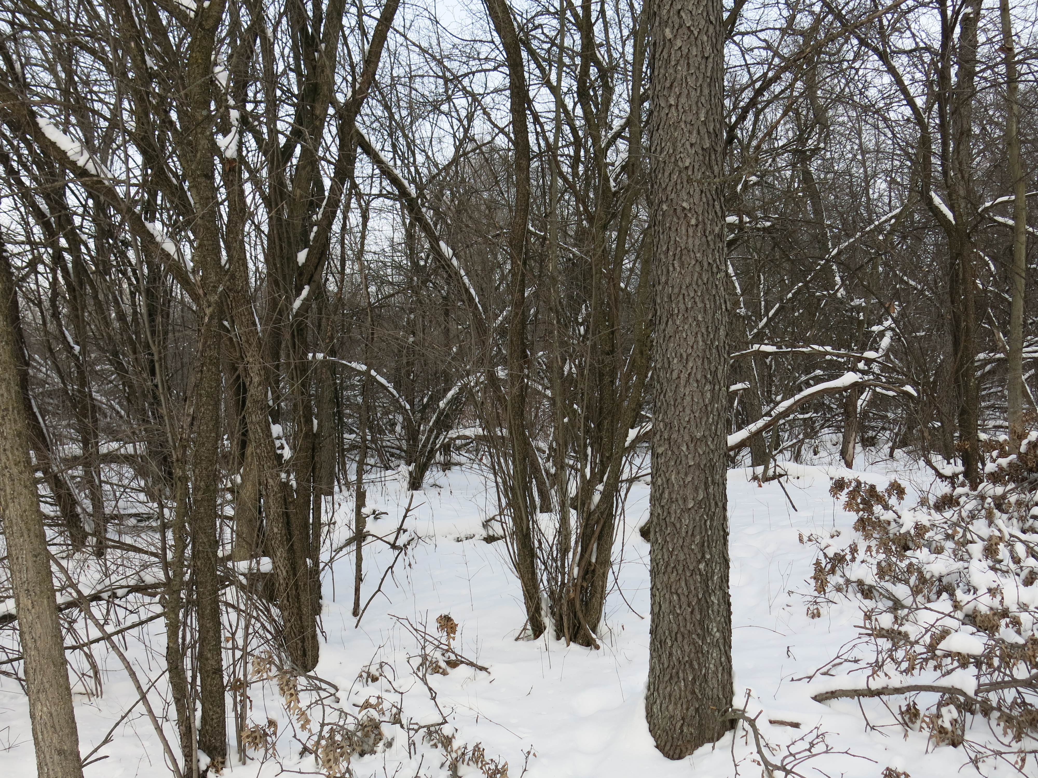 Thursday proved to be a bit more challenging; Andy informed me that it was -4 when he arrived, and snow was forecast for the afternoon.  I was joined by Chris Mann, Austin Avellone, Phil Hass, Drew Ballantyne and Andy Buchta deep in the Buckthorn Alley, where the trees were hideously misshapen after years of falling over themselves and resprouting.  The views below are looking west, north and east from where I parked my sled.