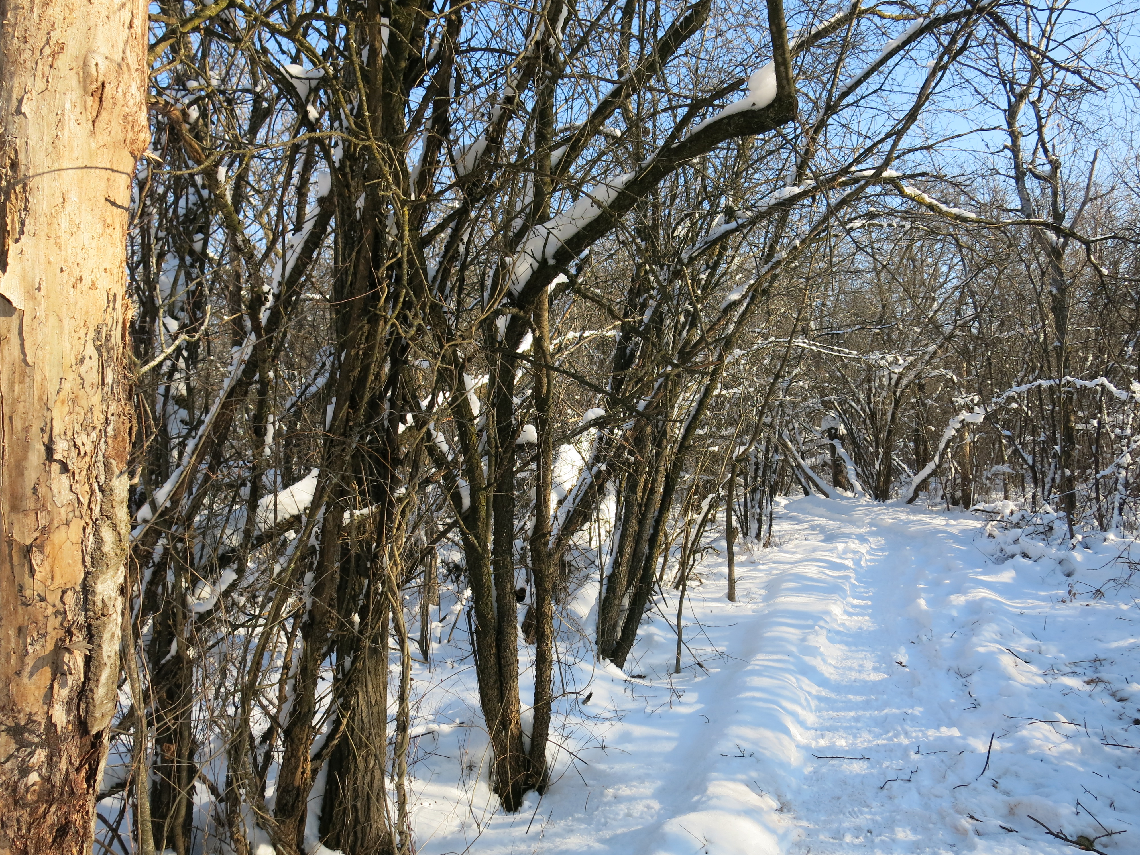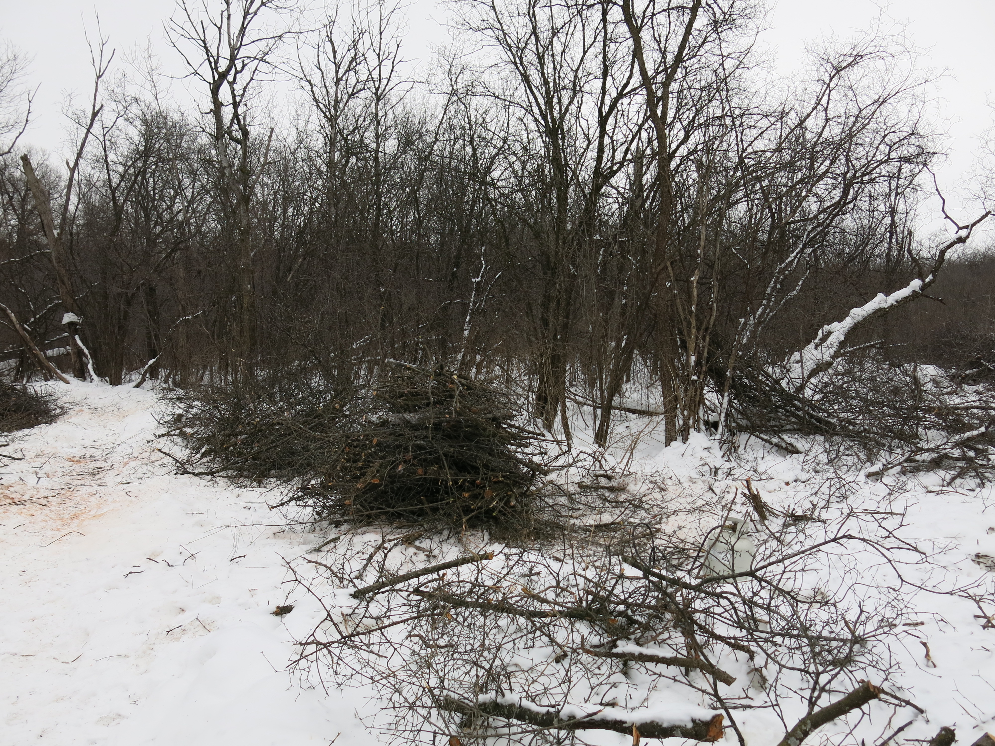 We lit the brush pile in the foreground of the first picture above and had a nice fire to keep warm by. Karen and Pati split their time between piling brush and feeding brush into the fire. Ben was obviously more comfortable with the chainsaw and, I dare say, I think he had a lot more fun. He and Karen visited this spot on New Year’s day and they bushwhacked through the opening in the buckthorn that Zach and I cut and passed through three different cranberry bogs before emerging on the cut-off trail. It is encouraging to know that the area between the north section of the trail and the cut-off trail is not a solid mass of buckthorn. I’ll have to check this out myself!
