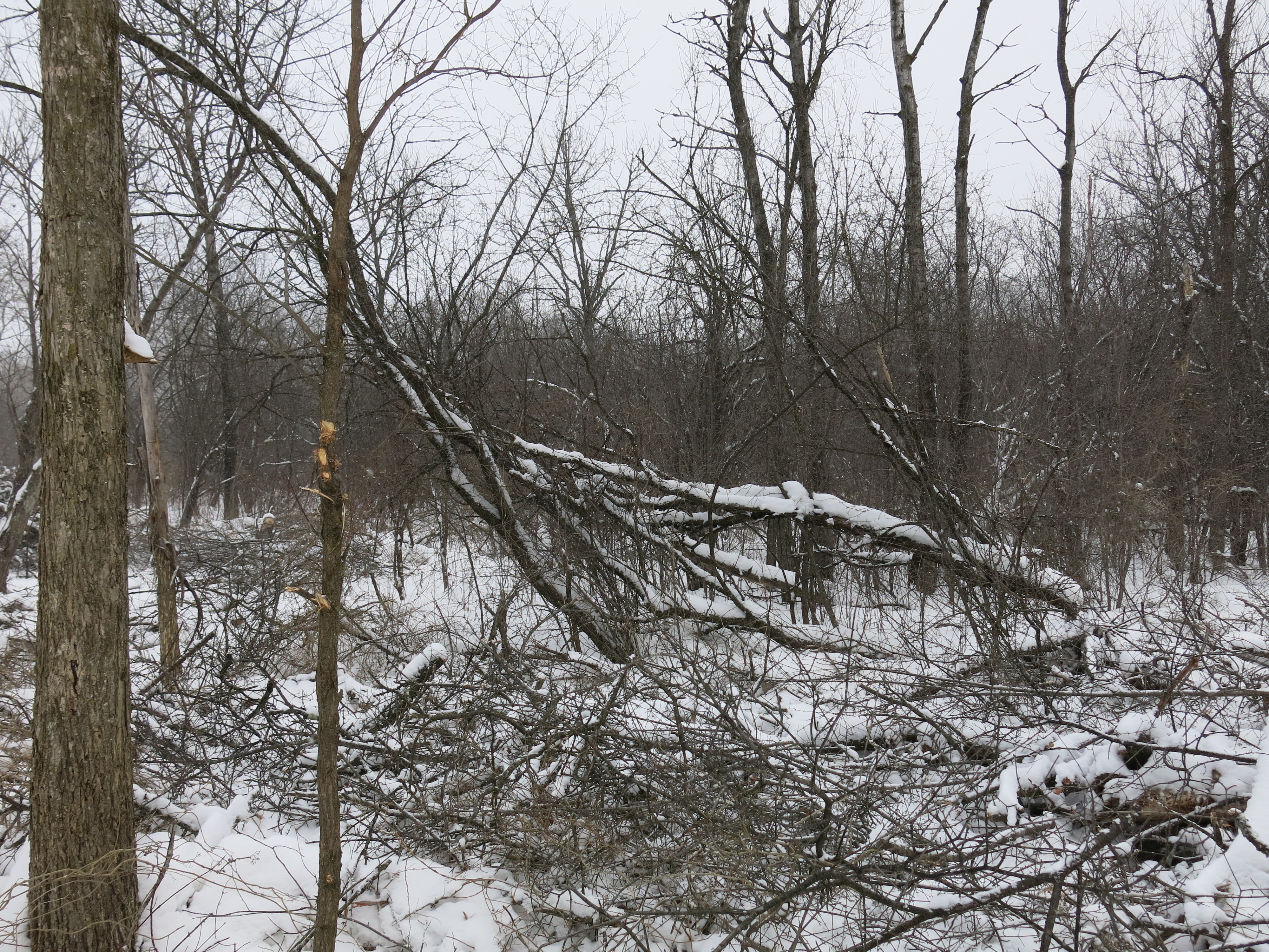 At the Scuppernong Springs Nature Trail, it is U.S. Highway 67 that has been unocculted. The removal of huge colonies of black locust trees from both the north and south ends of the preserve, along with the buckthorn cutting, have exposed the sights and sounds of the highway to major portions of the trail. I won’t occult the truth: this is very obnoxious, especially in winter, and worst of all, at night. The bright, rolling headlights, intermittently blocked by trees, evoke the feeling of prison bars and clandestine interrogations; not very relaxing or natural. And on Saturday night, it was one car after another… I don’t like it one bit. We have to get some native shrubs planted and recreate a healthy understory.