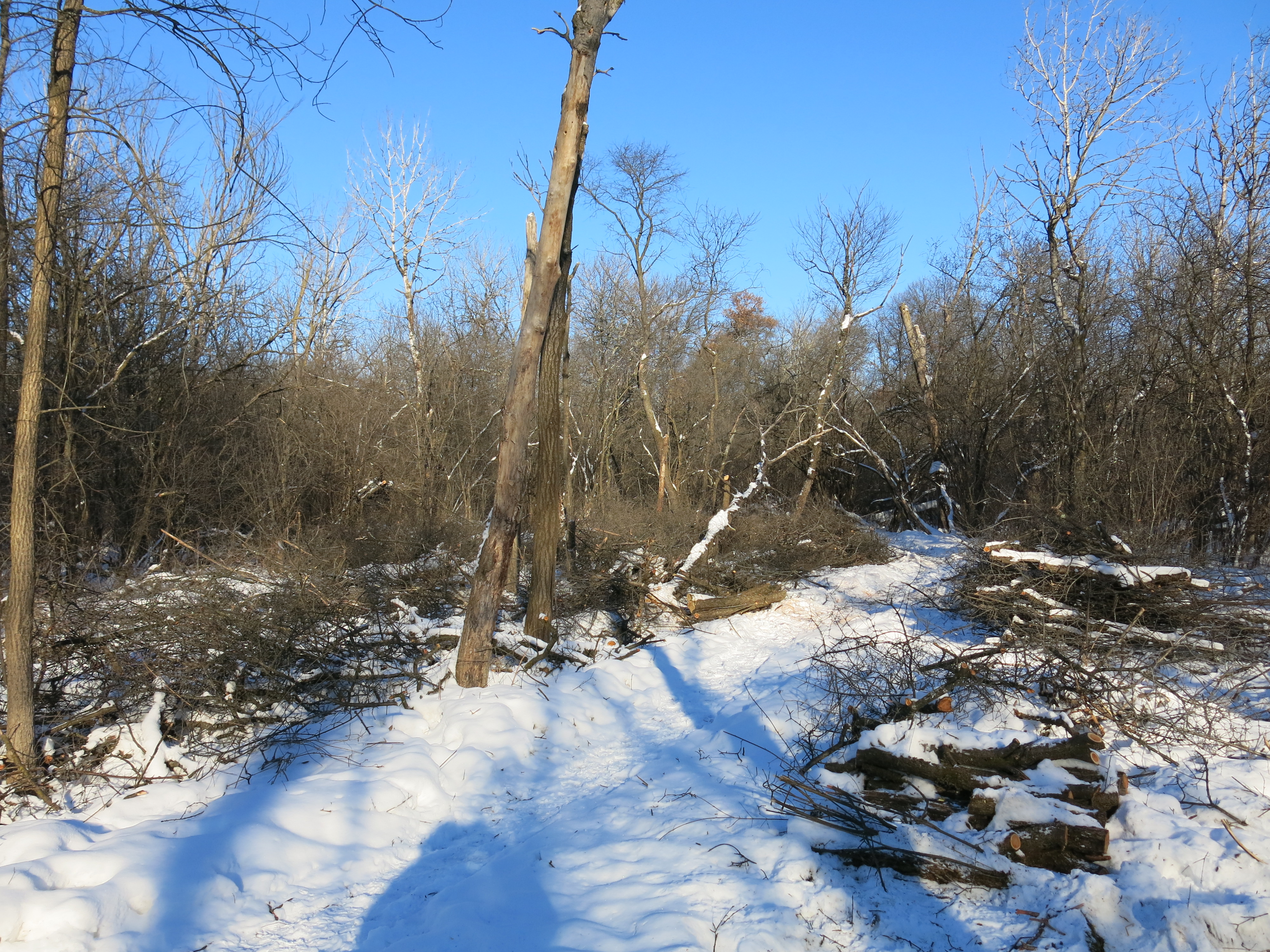 I continued working in the Buckthorn Alley, which will be our focus until conditions improve to resume burning brush piles. I cut on the left/north side of the trail. Here is what it looked like before I got started.